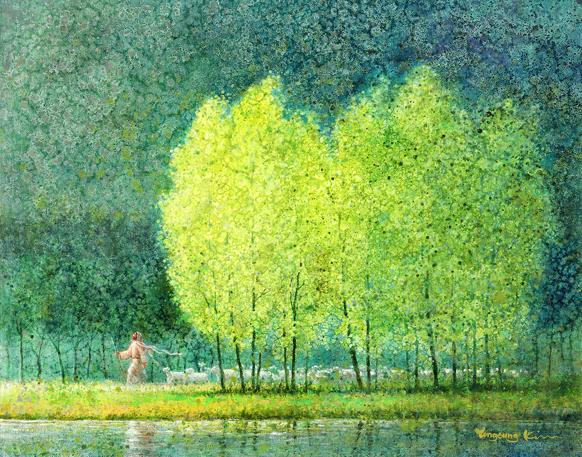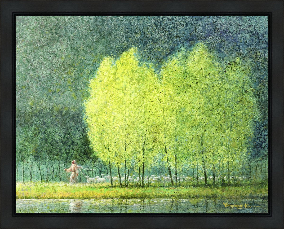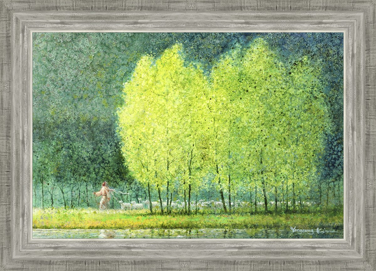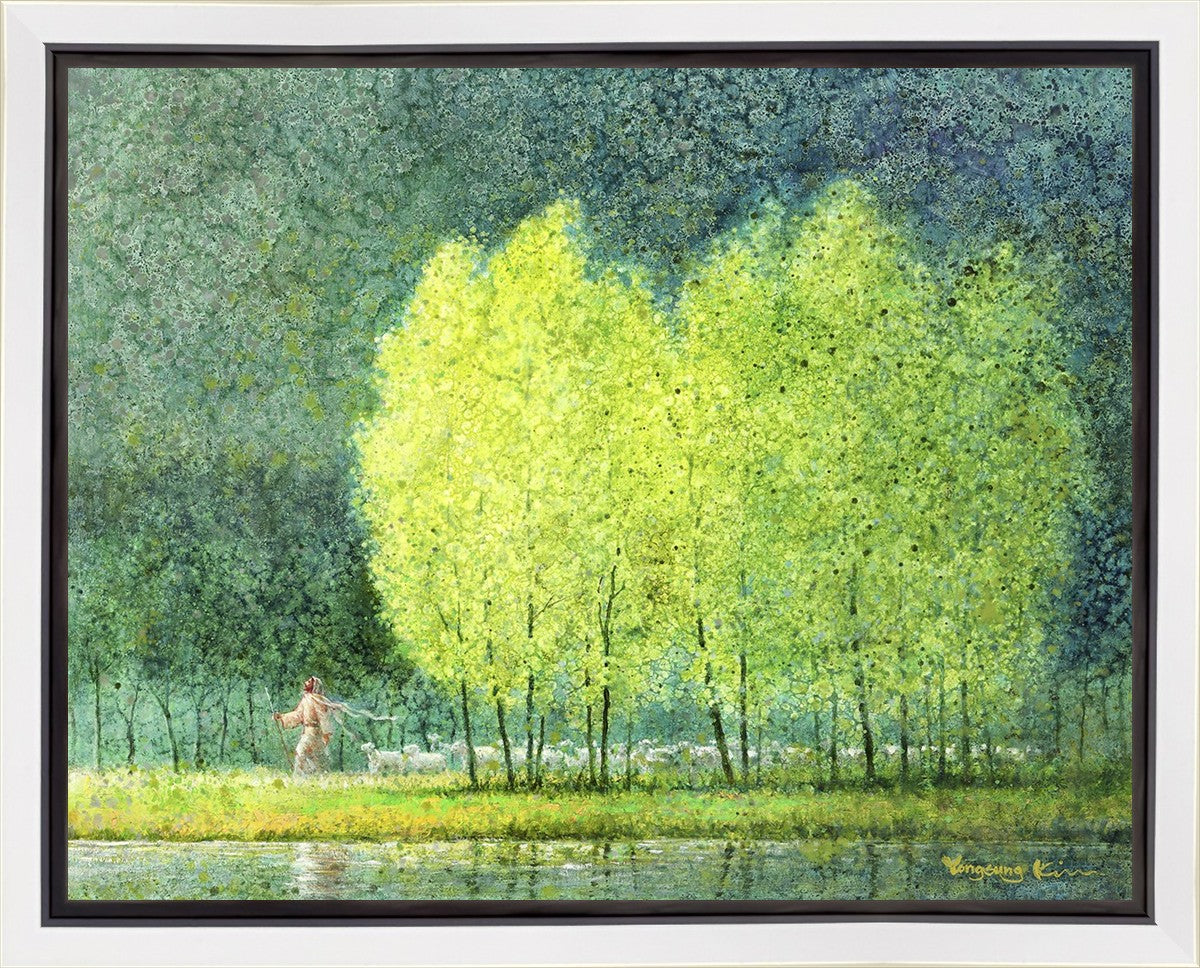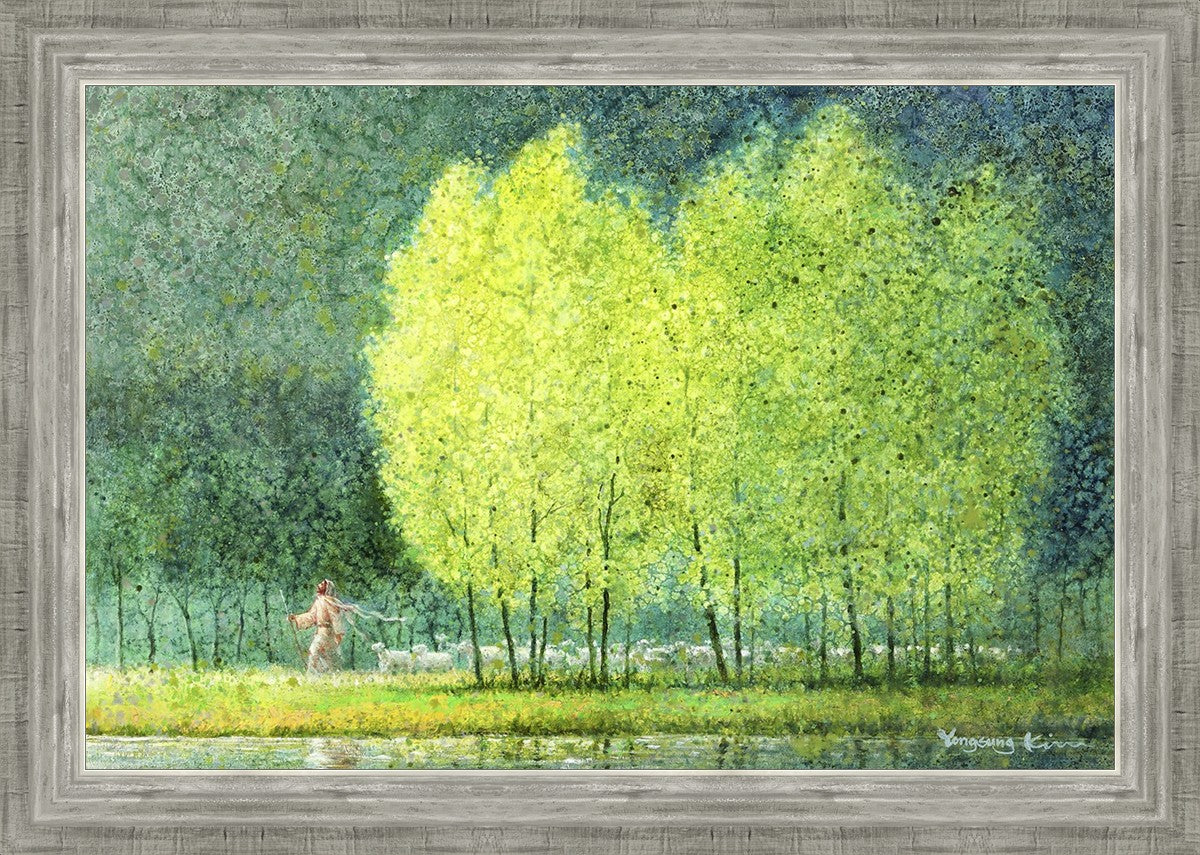 Painting of Follow In His Footsteps by Yongsung Kim featuring Jesus Christ guiding his flock of sheep through a grove of greens and blues