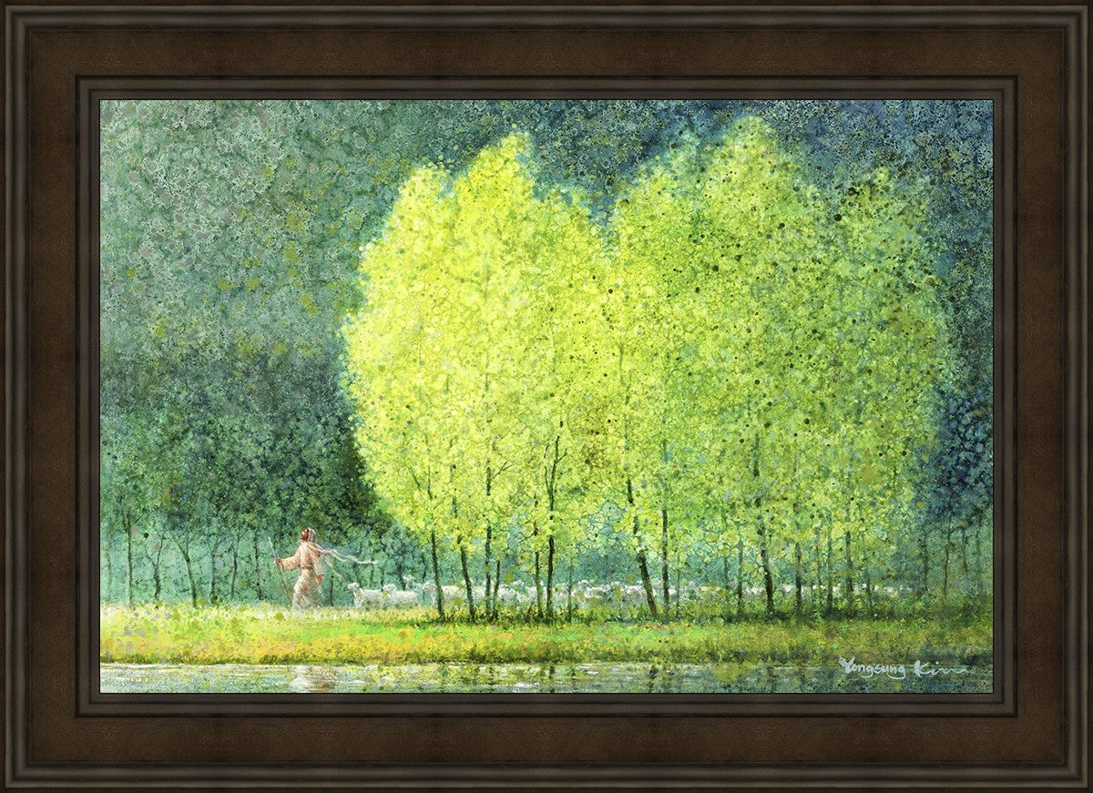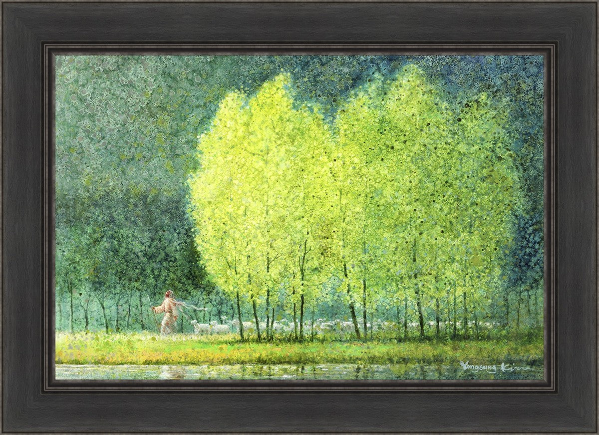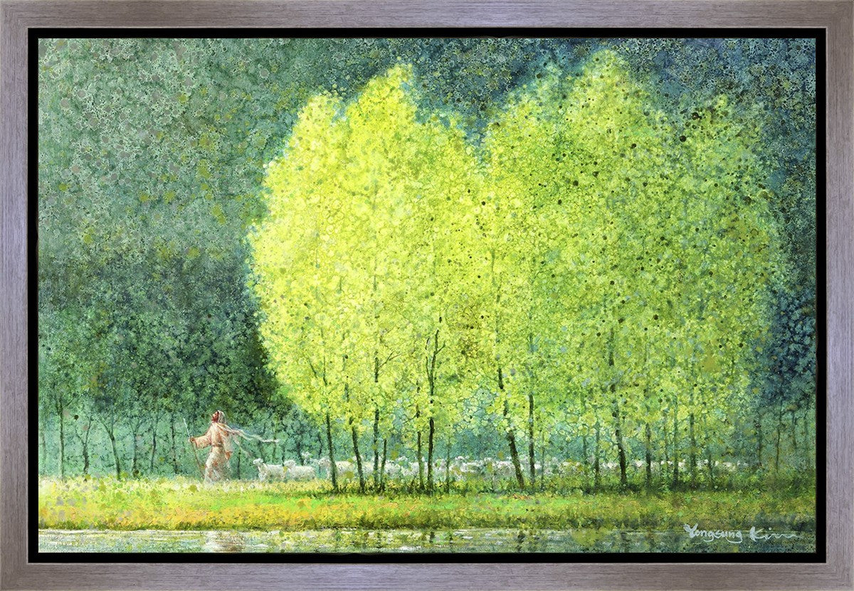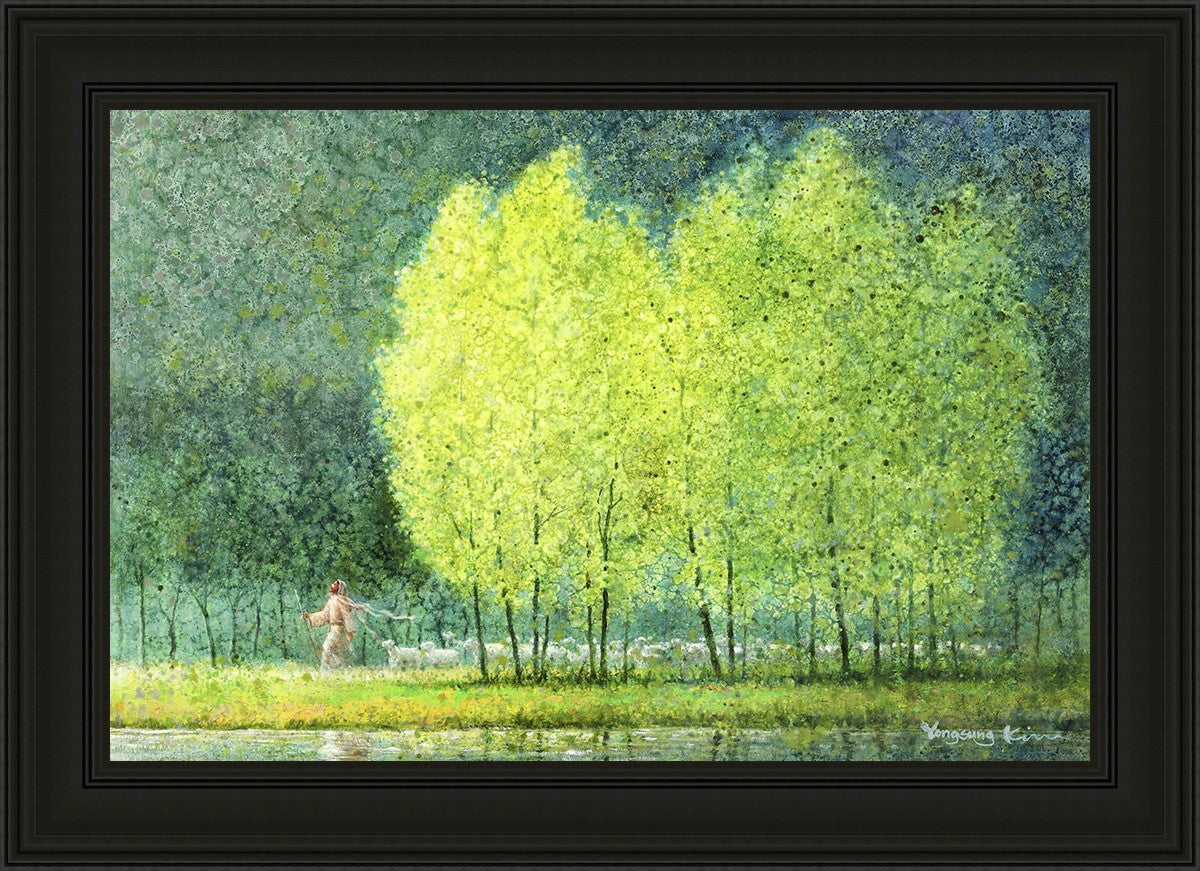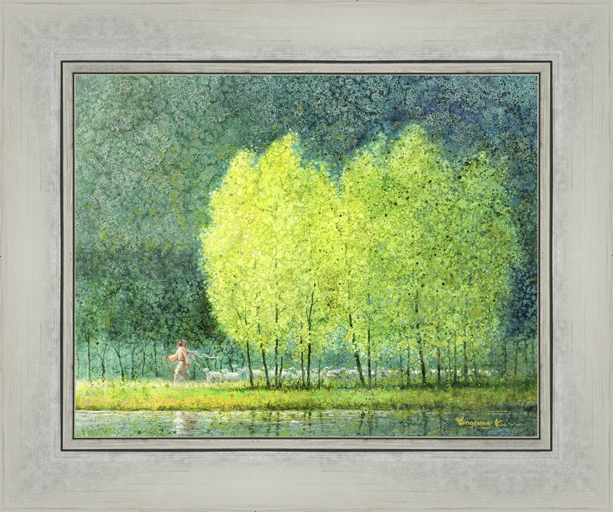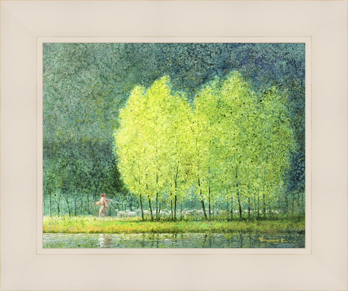 Painting of Follow In His Footsteps by Yongsung Kim featuring Jesus Christ guiding his flock of sheep through a grove of greens and blues