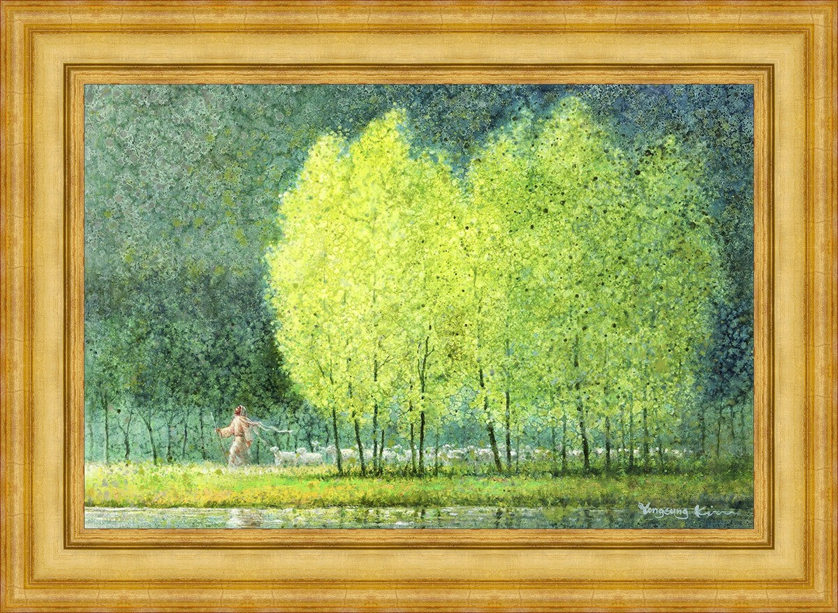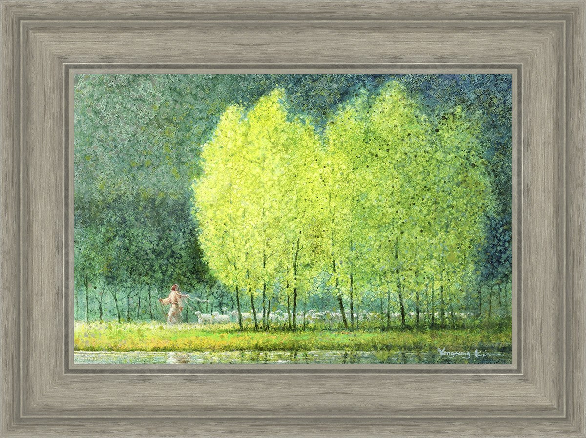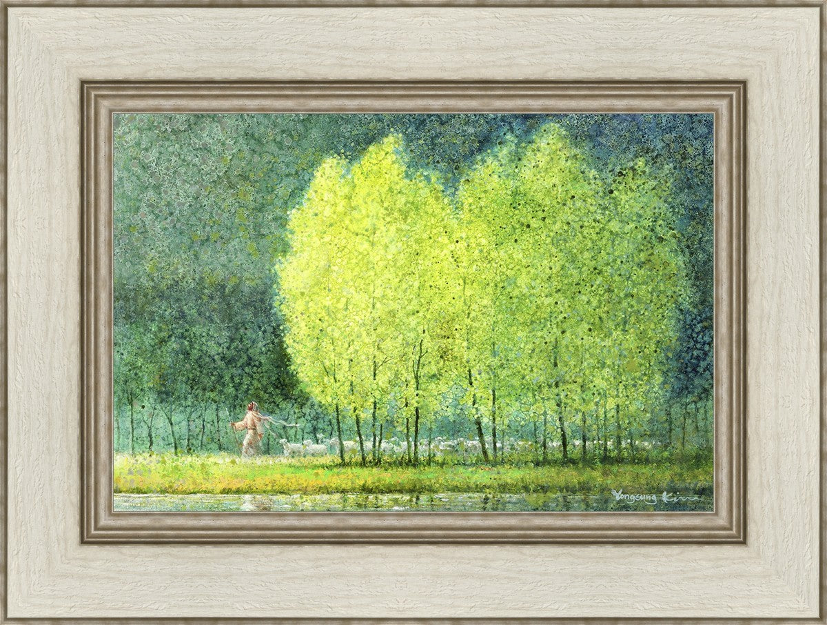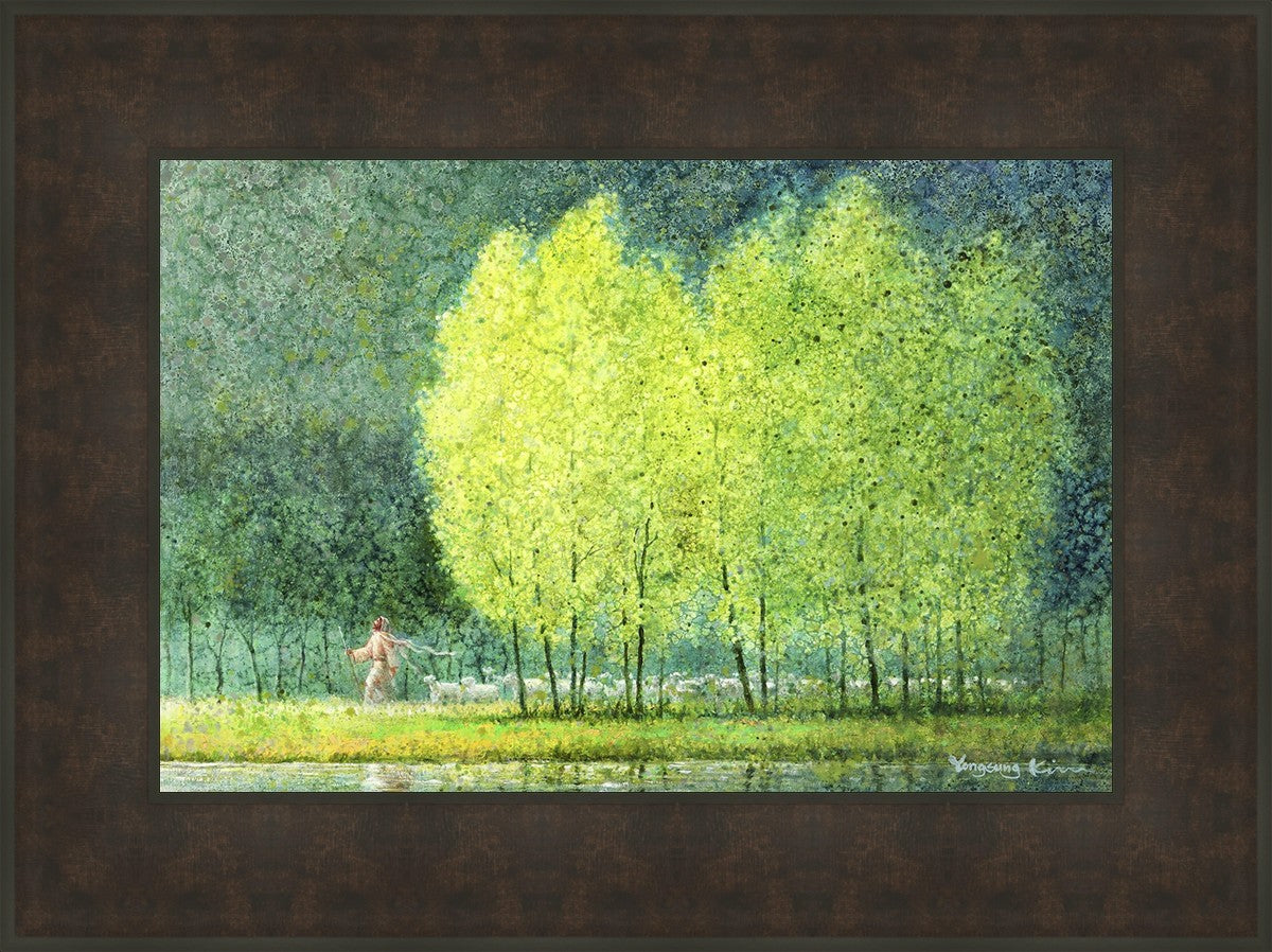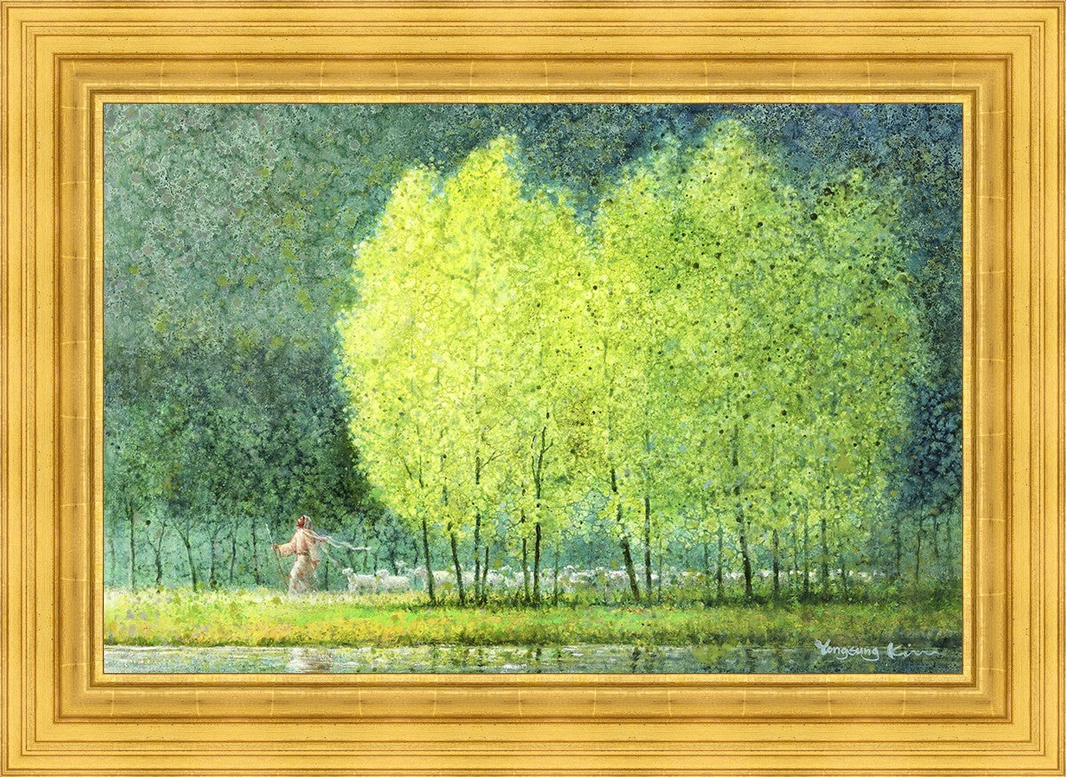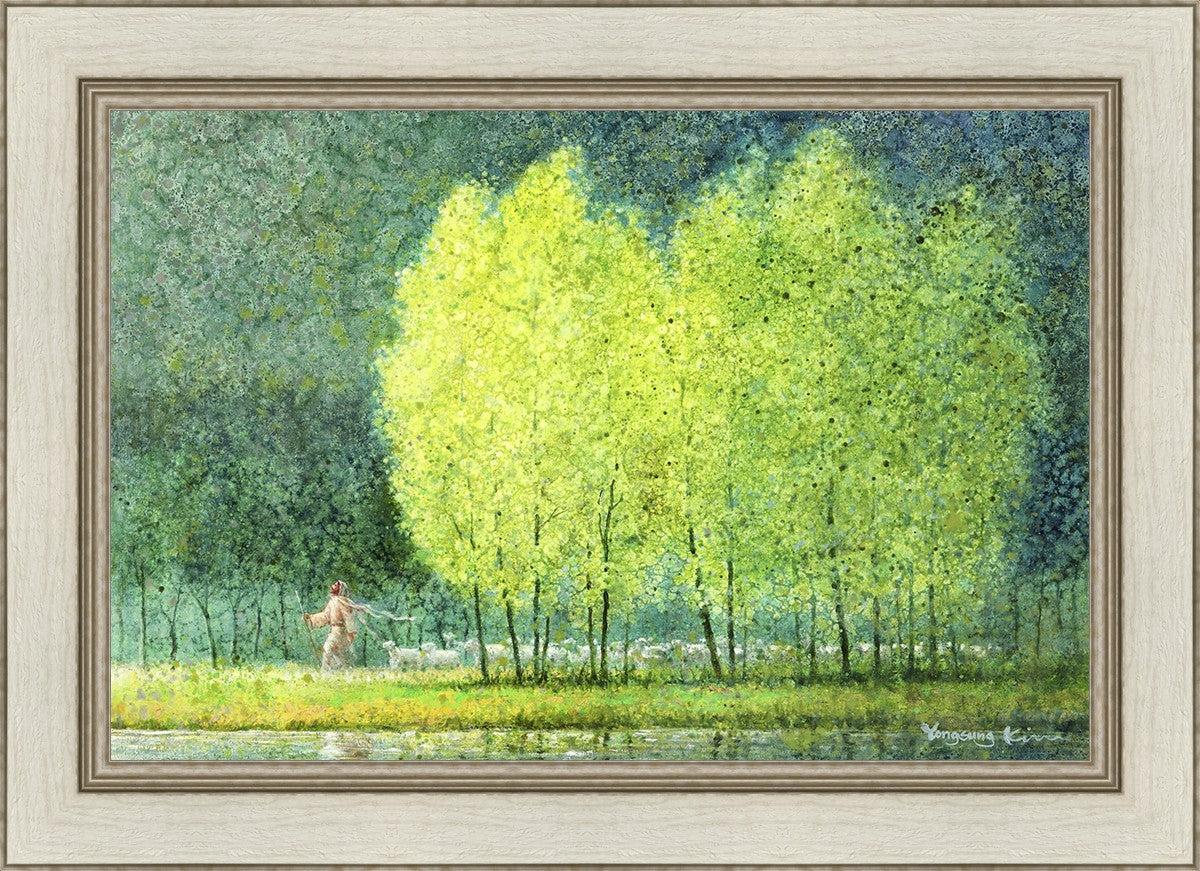 Painting of Follow In His Footsteps by Yongsung Kim featuring Jesus Christ guiding his flock of sheep through a grove of greens and blues