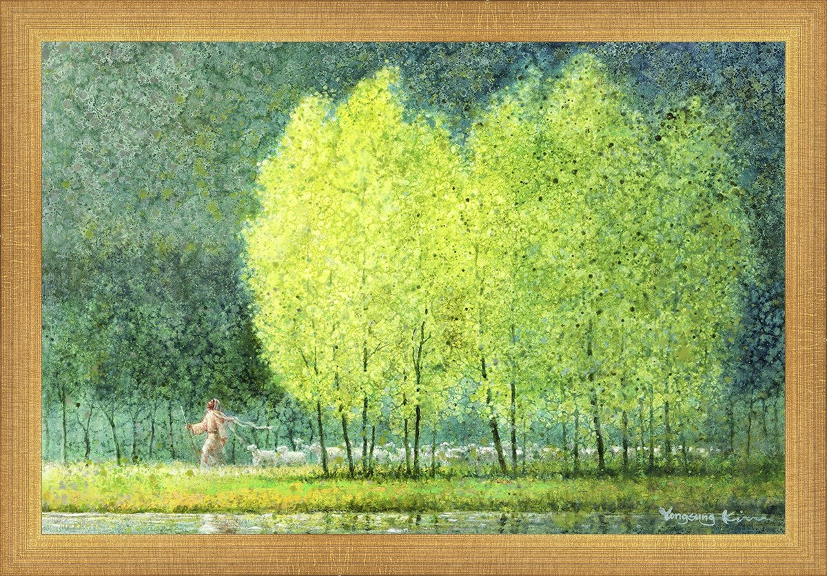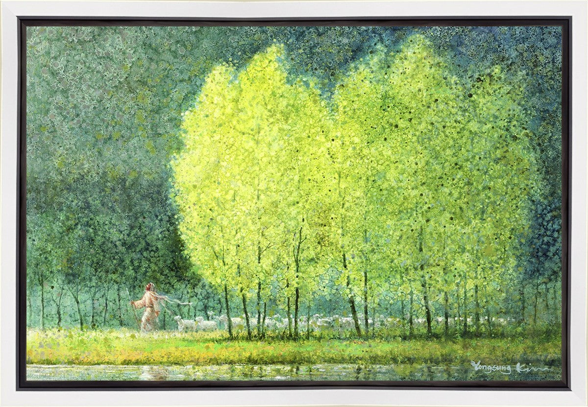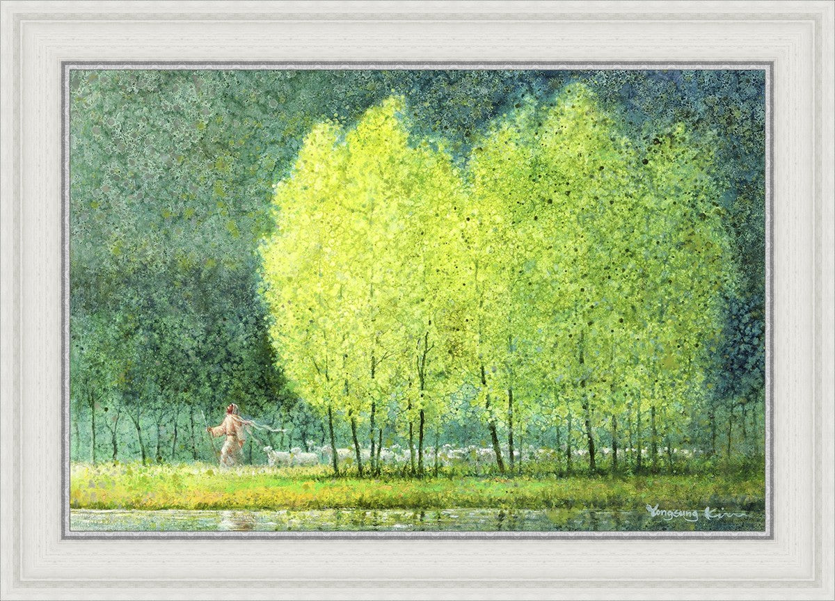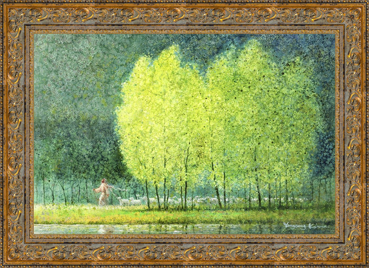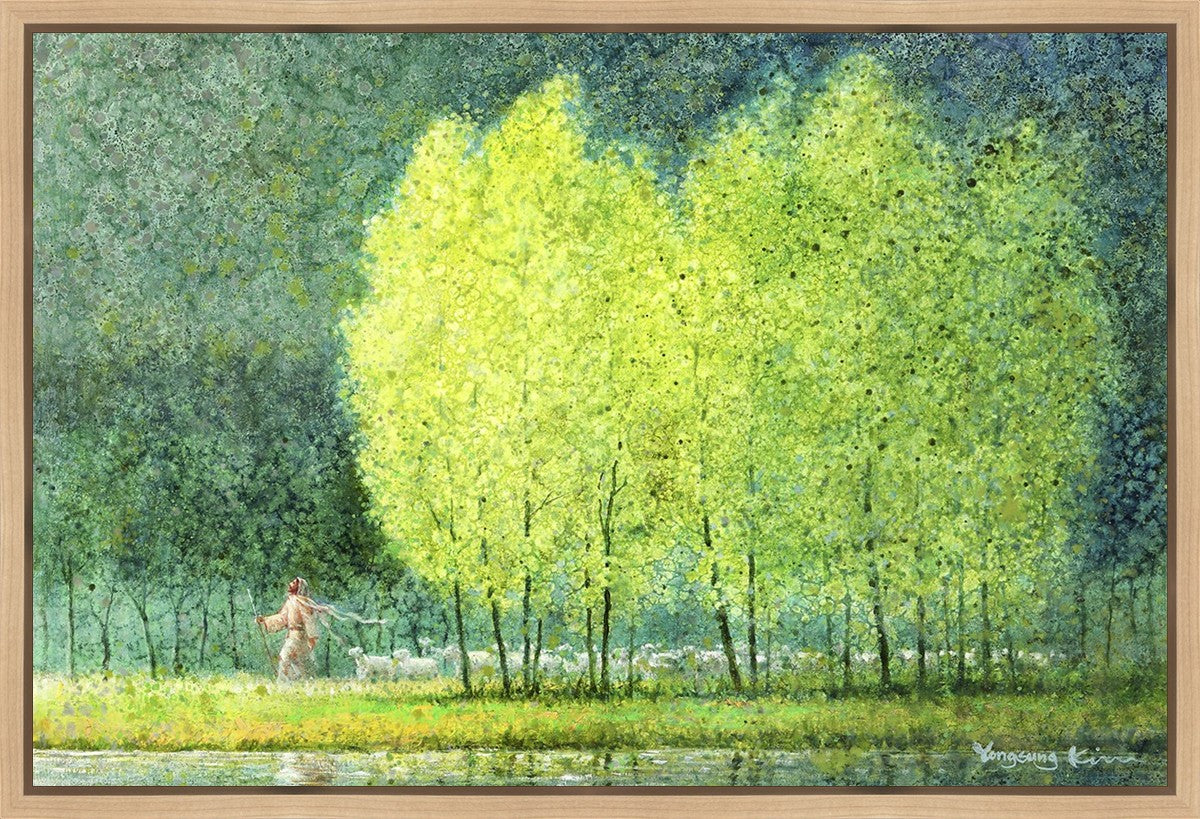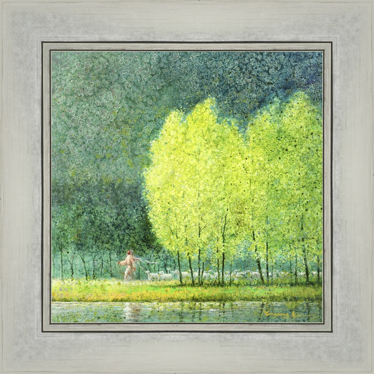 Painting of Follow In His Footsteps by Yongsung Kim featuring Jesus Christ guiding his flock of sheep through a grove of greens and blues