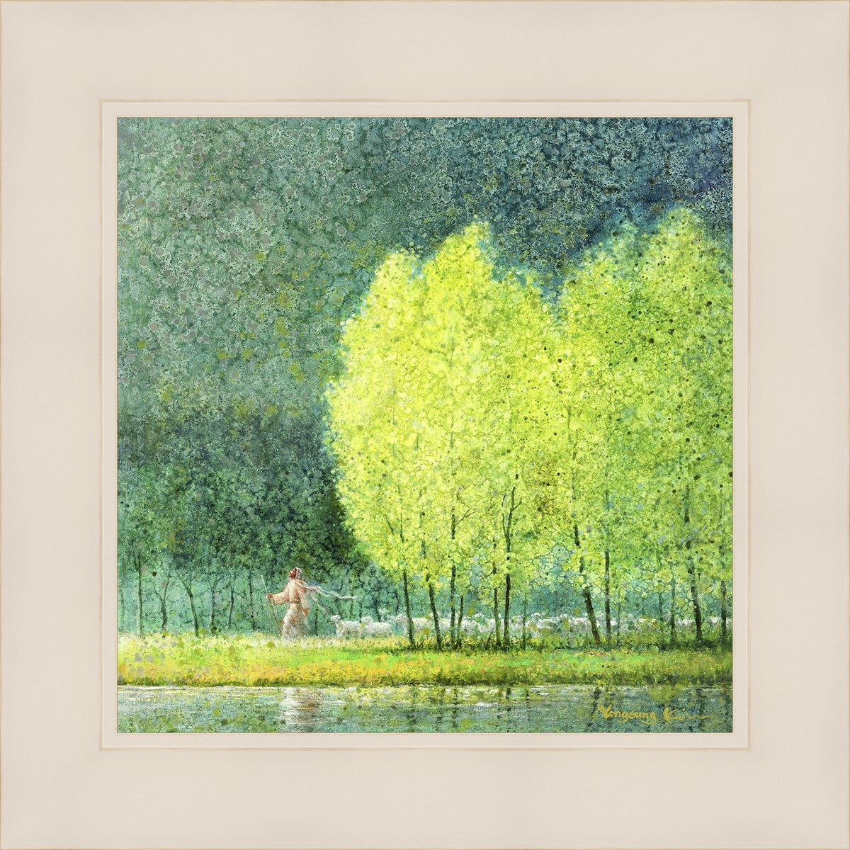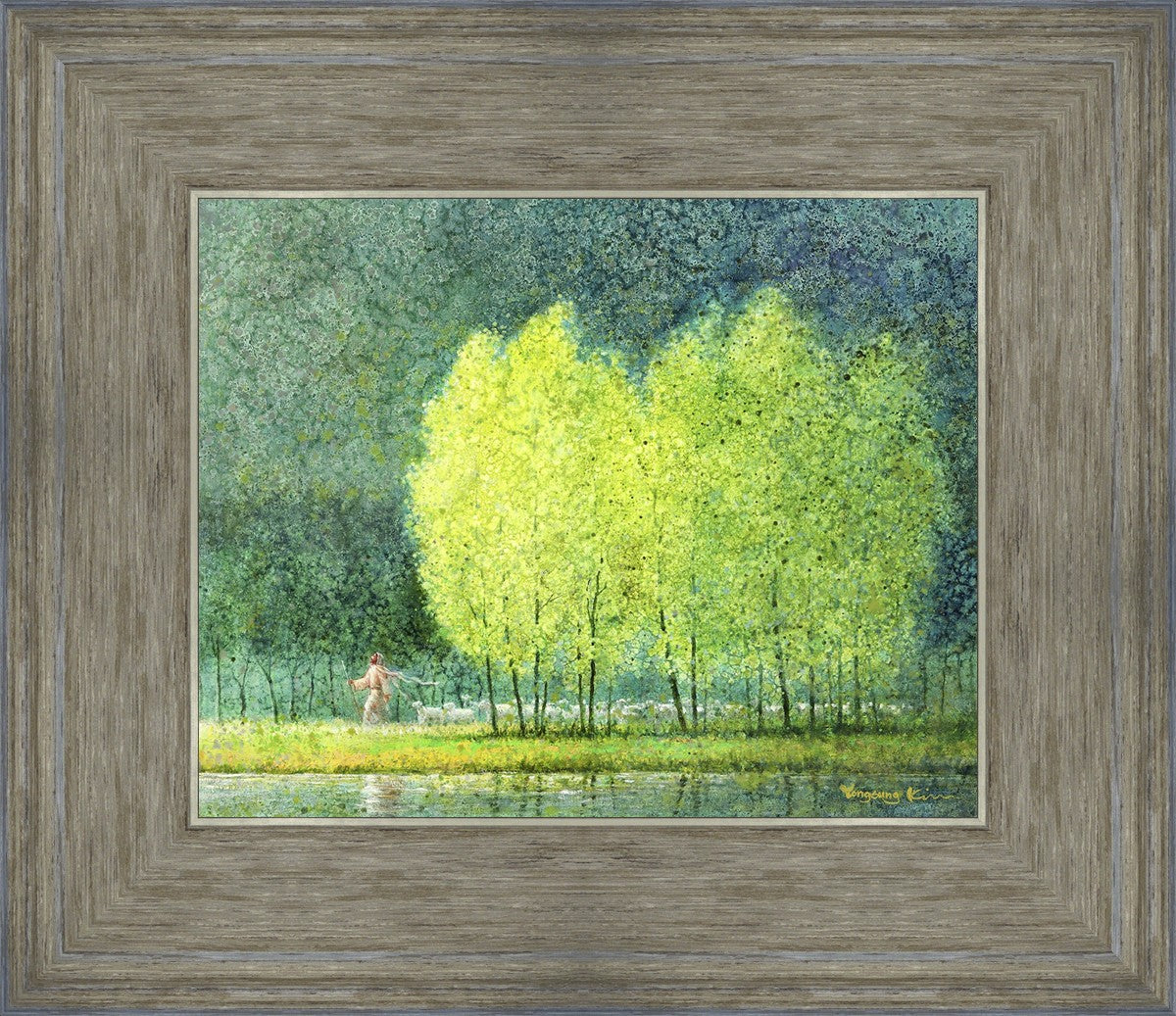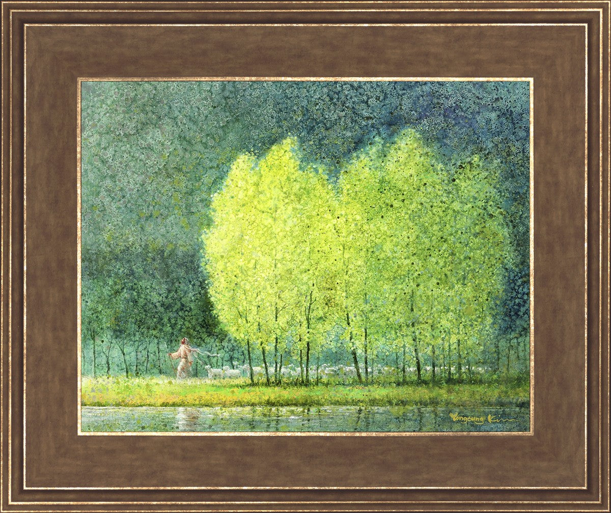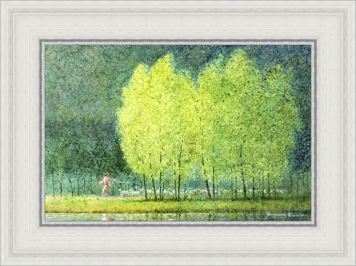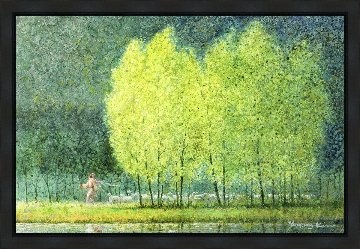 Painting of Follow In His Footsteps by Yongsung Kim featuring Jesus Christ guiding his flock of sheep through a grove of greens and blues