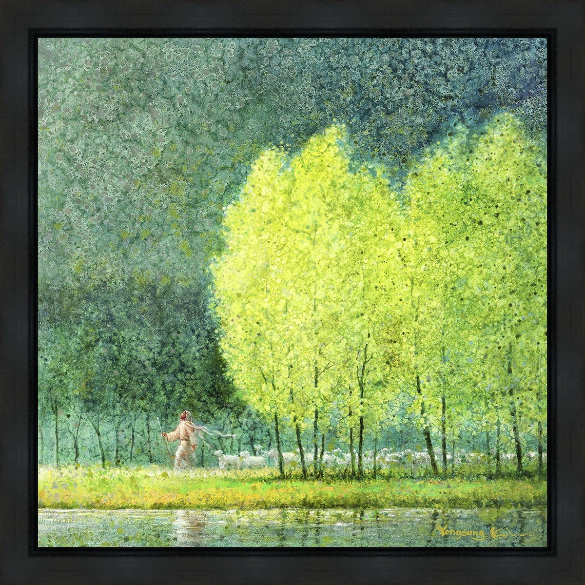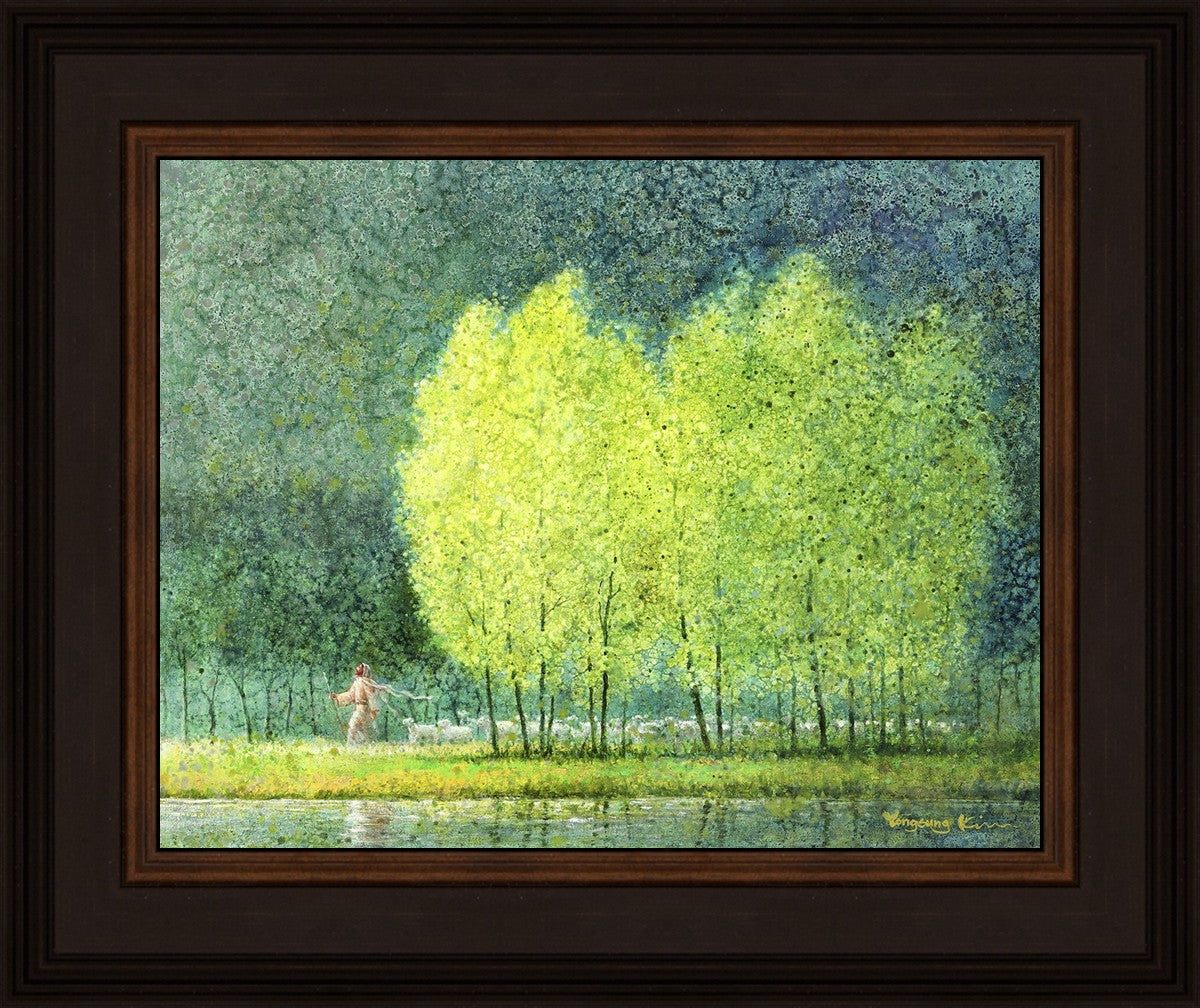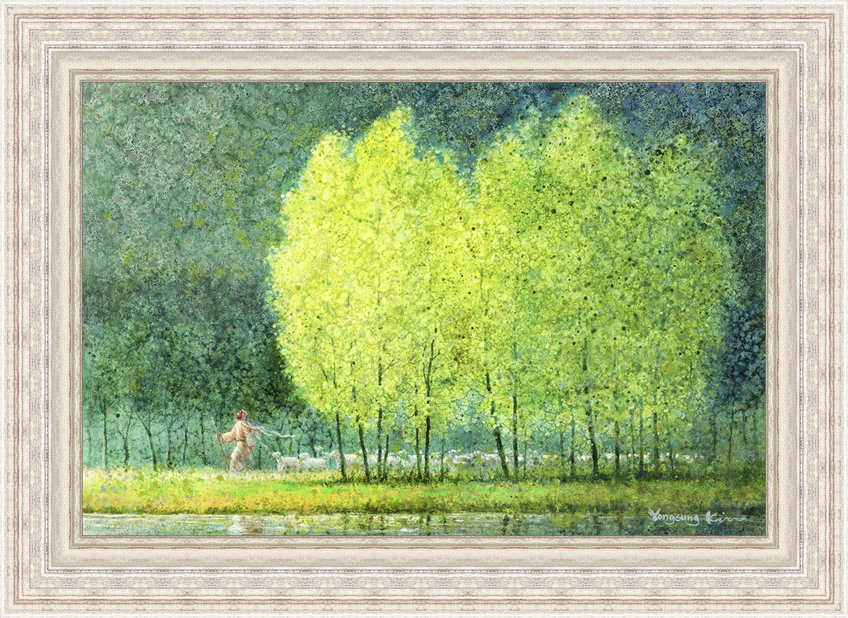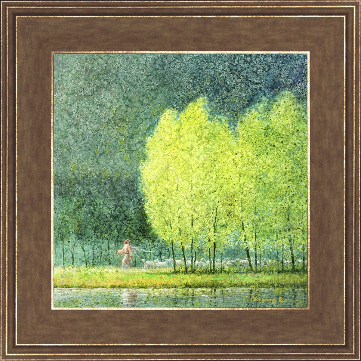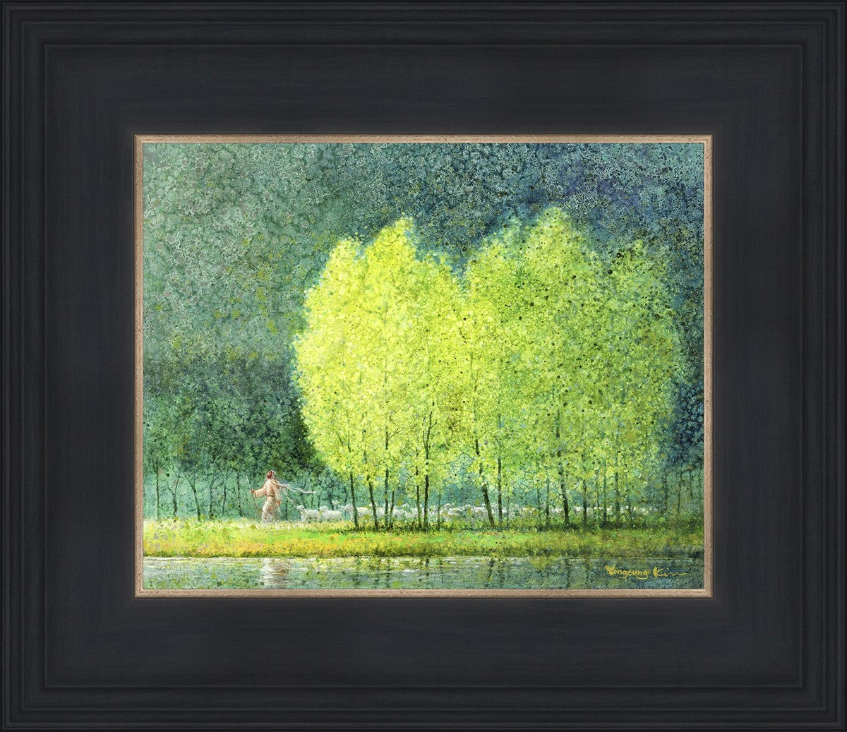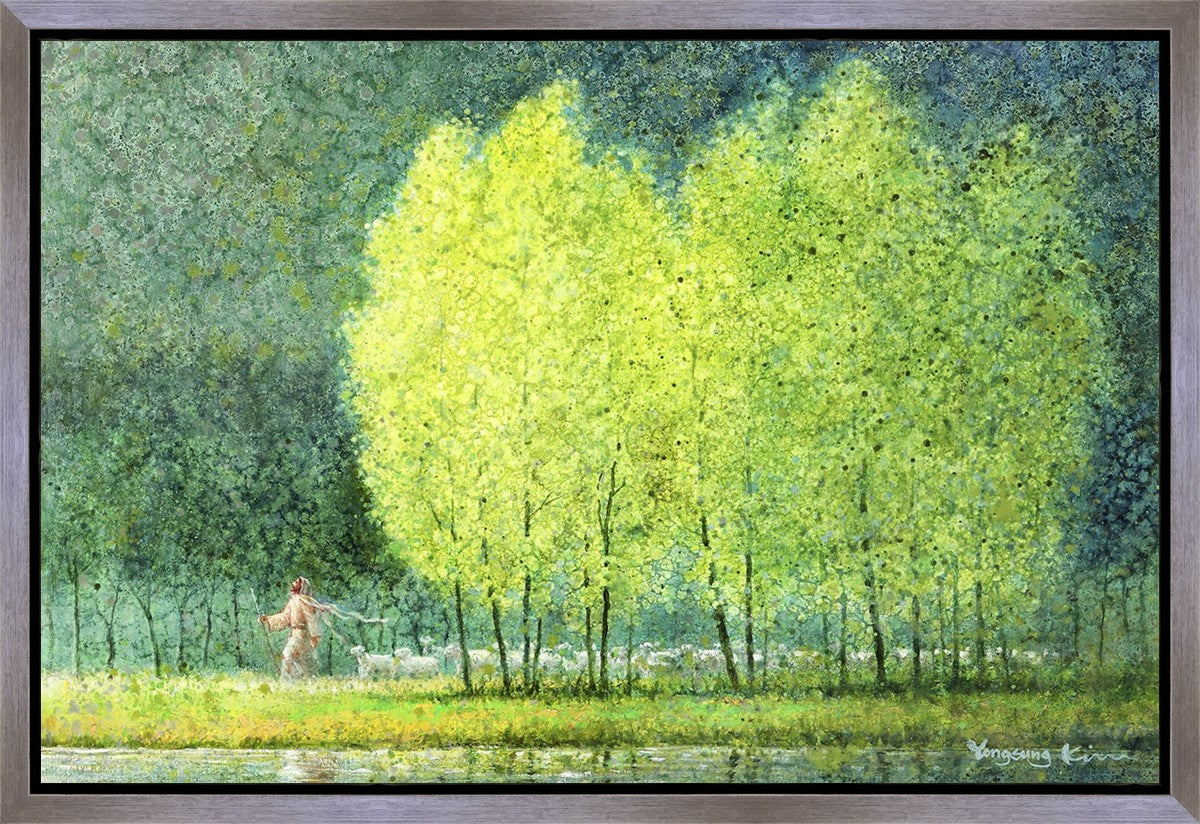 Painting of Follow In His Footsteps by Yongsung Kim featuring Jesus Christ guiding his flock of sheep through a grove of greens and blues