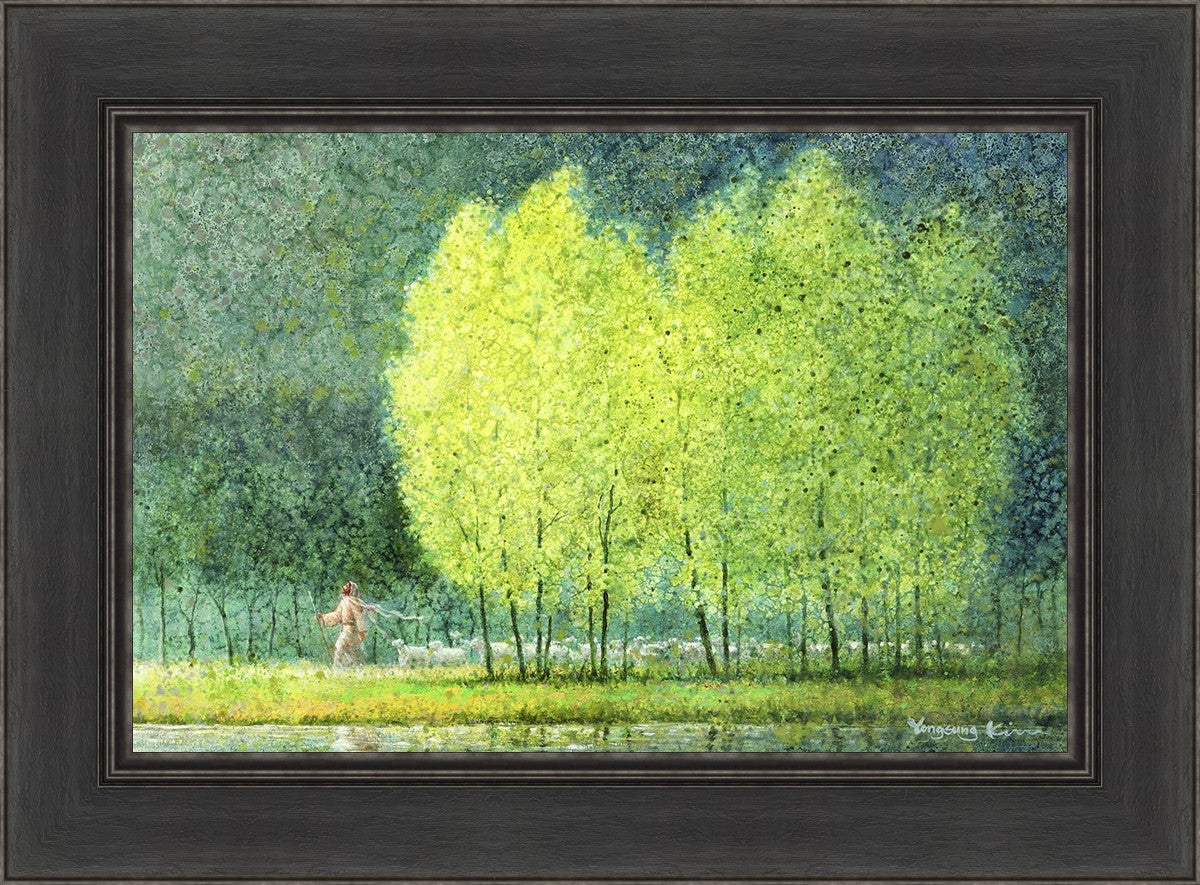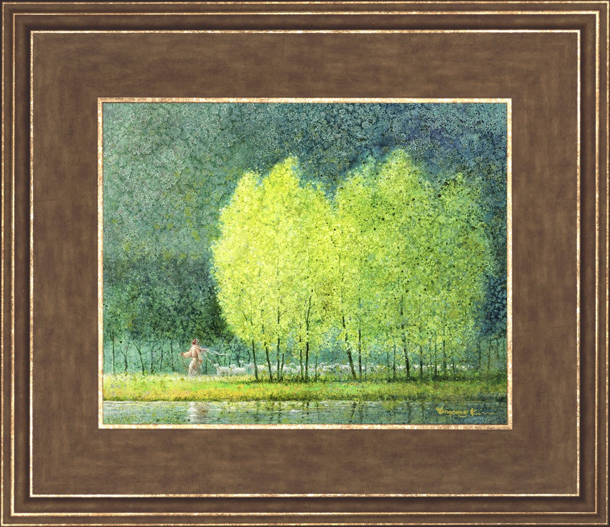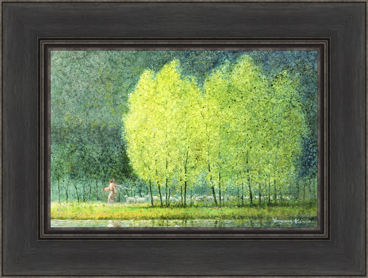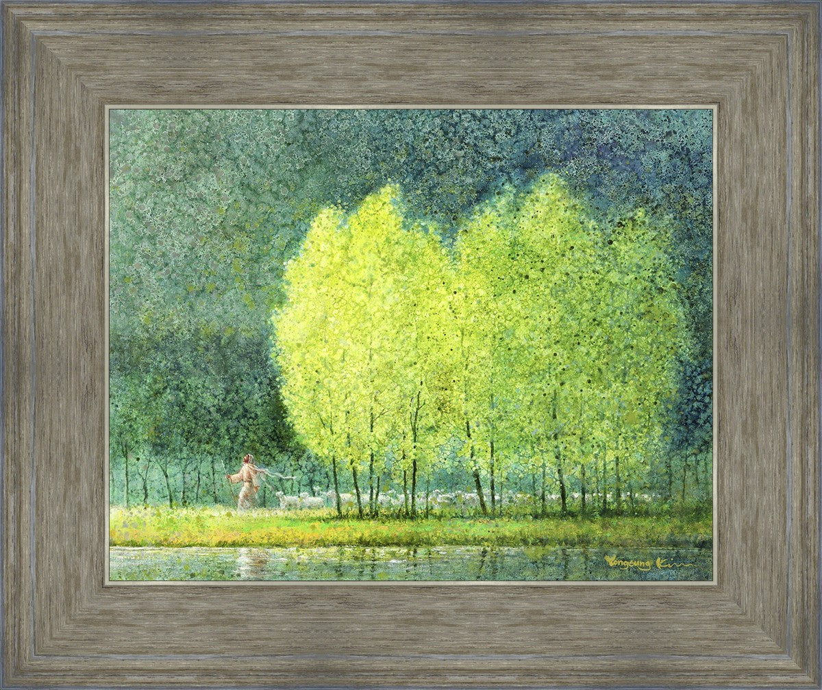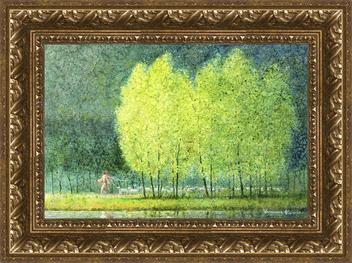 Painting of Follow In His Footsteps by Yongsung Kim featuring Jesus Christ guiding his flock of sheep through a grove of greens and blues
