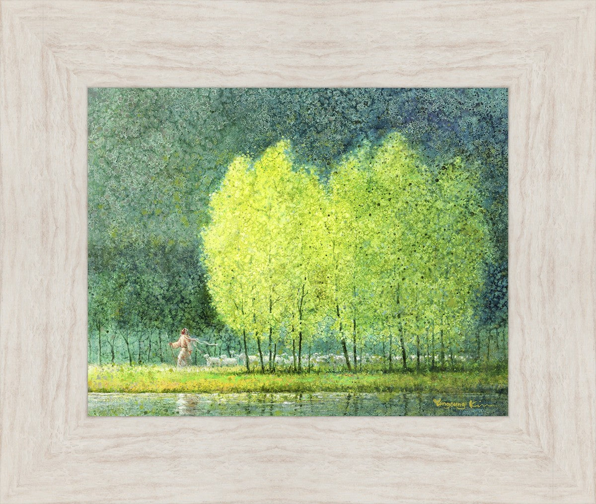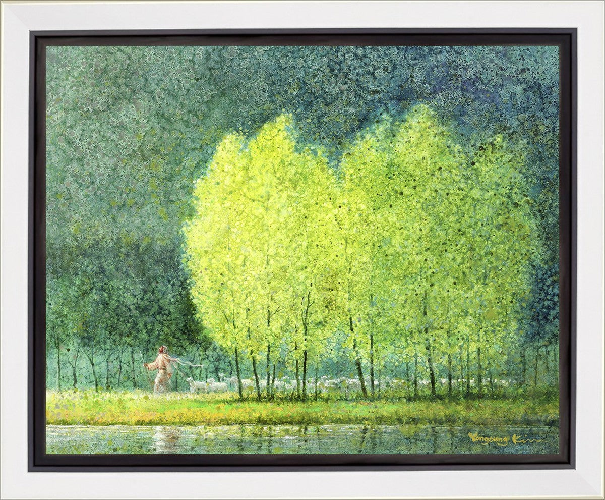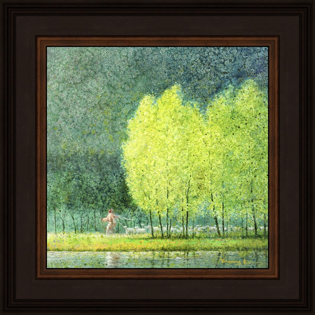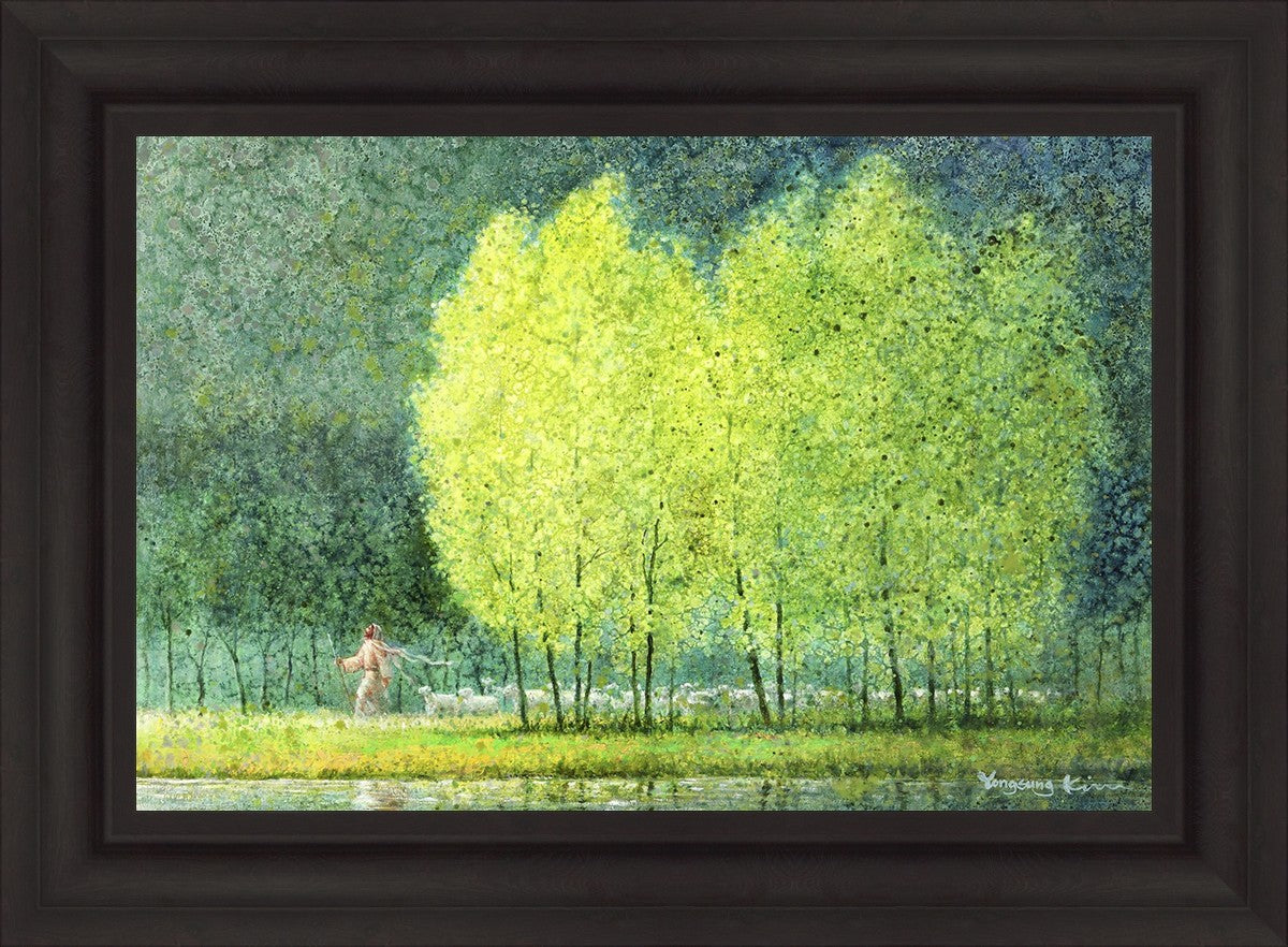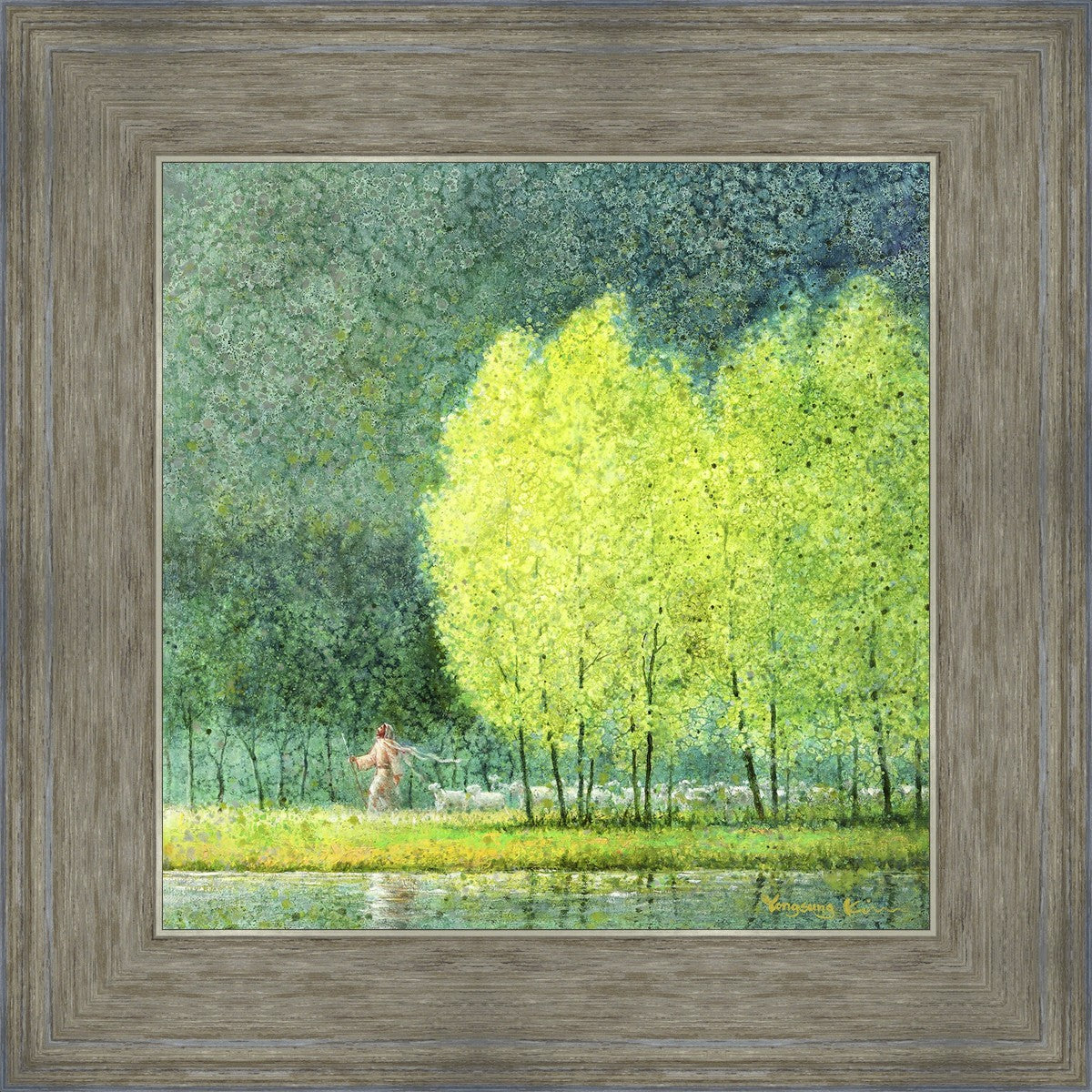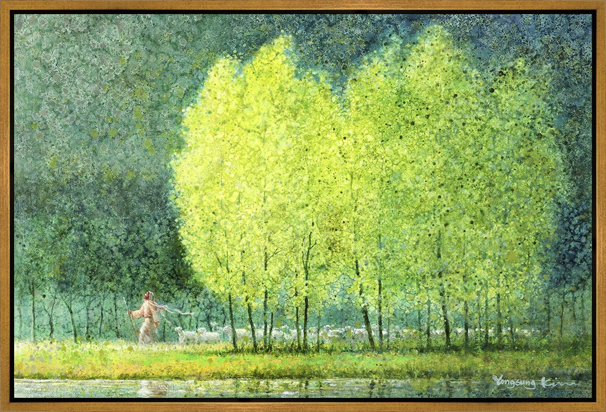 Painting of Follow In His Footsteps by Yongsung Kim featuring Jesus Christ guiding his flock of sheep through a grove of greens and blues