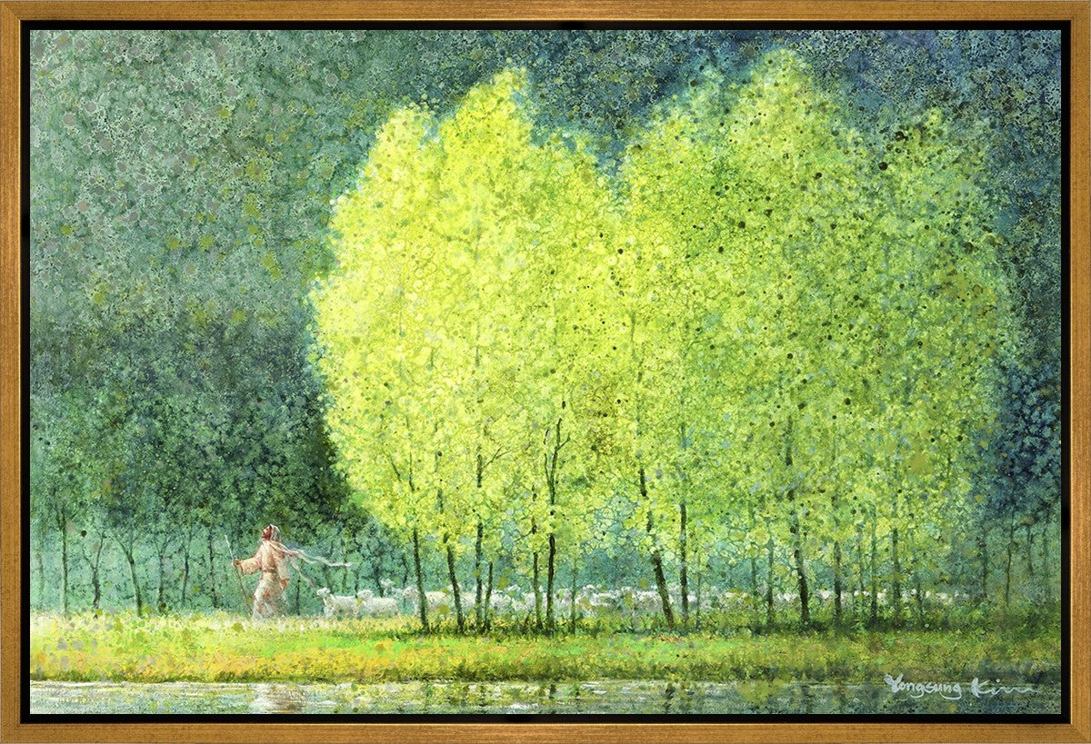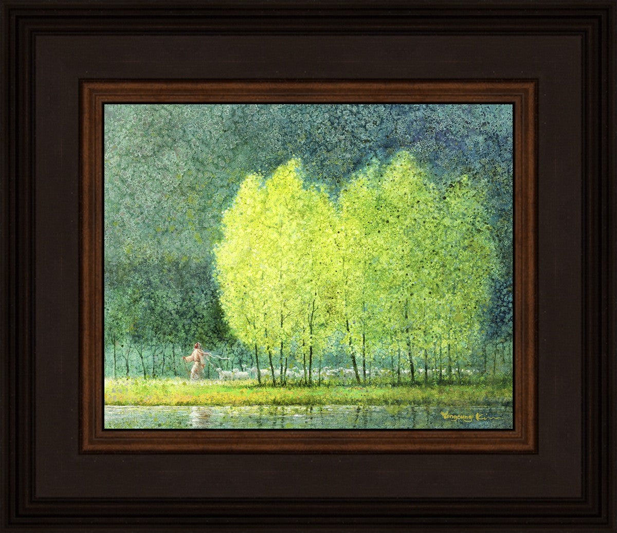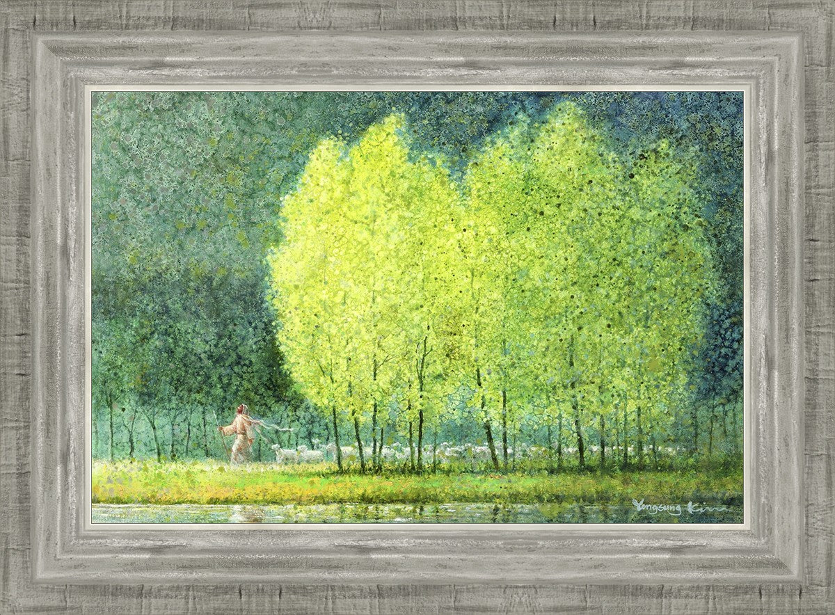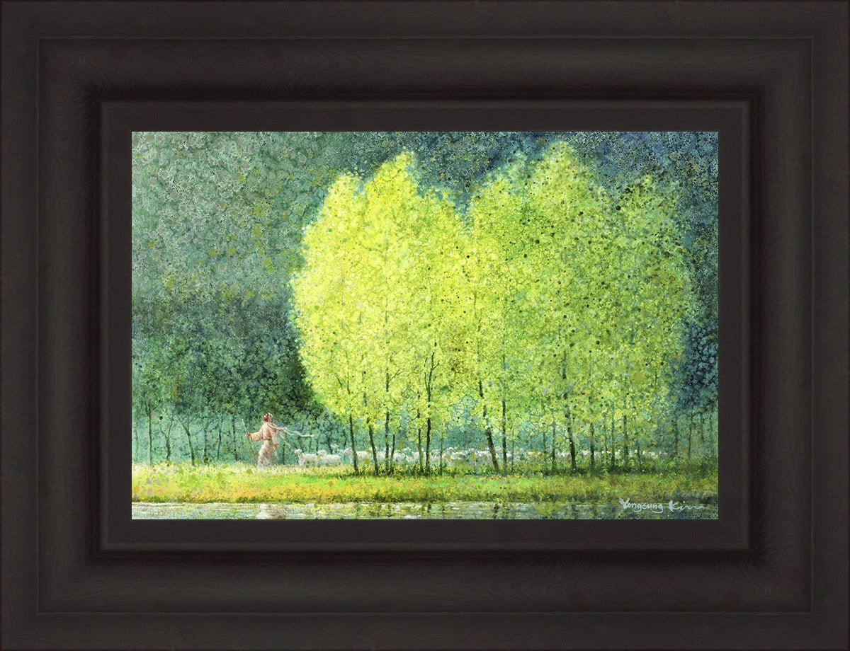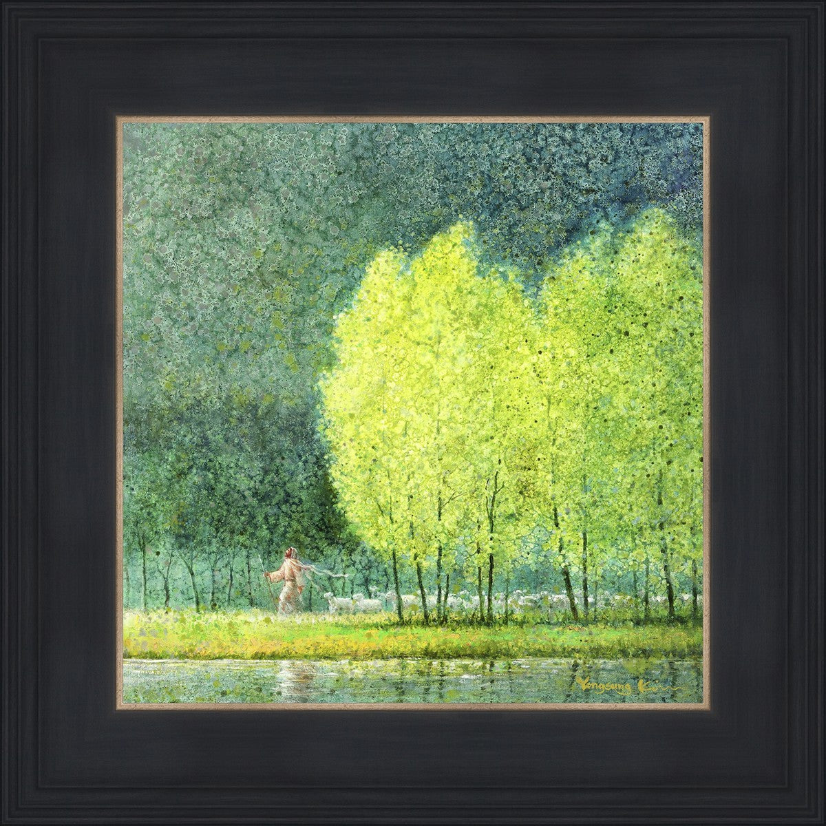 Painting of Follow In His Footsteps by Yongsung Kim featuring Jesus Christ guiding his flock of sheep through a grove of greens and blues