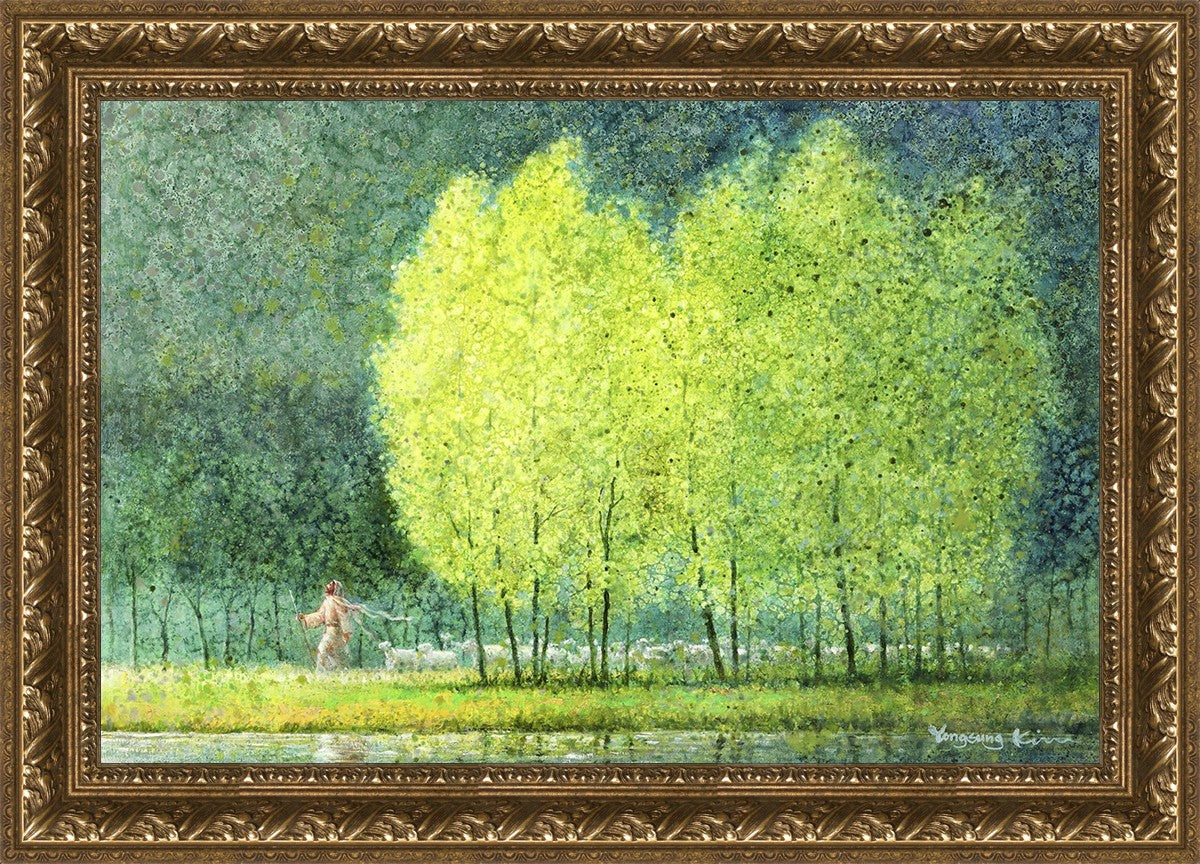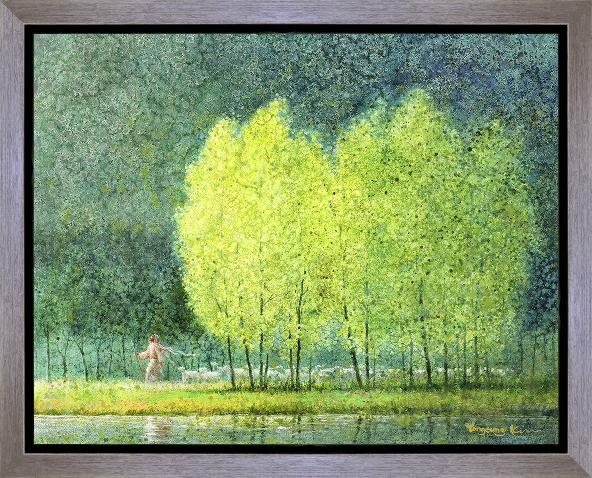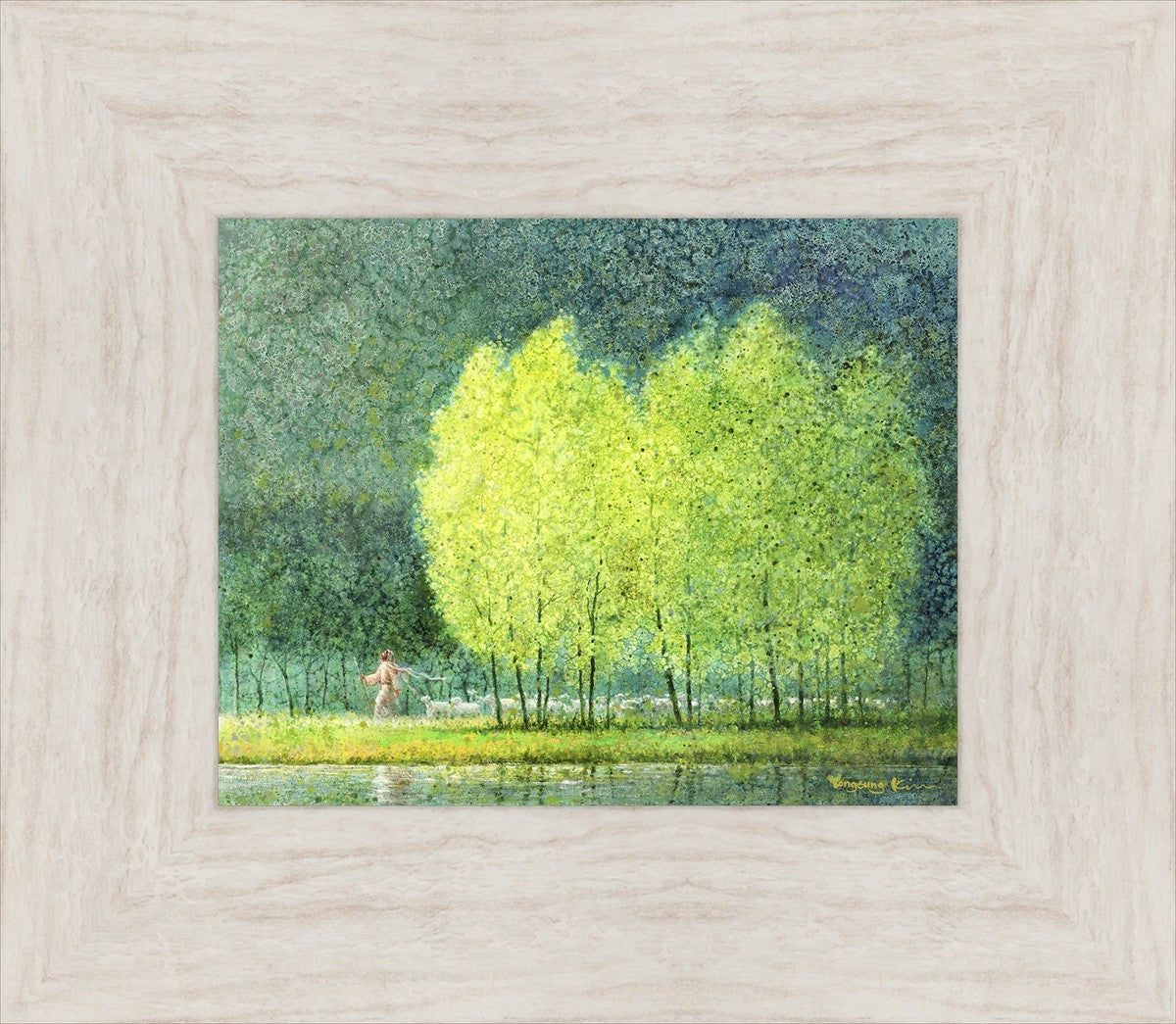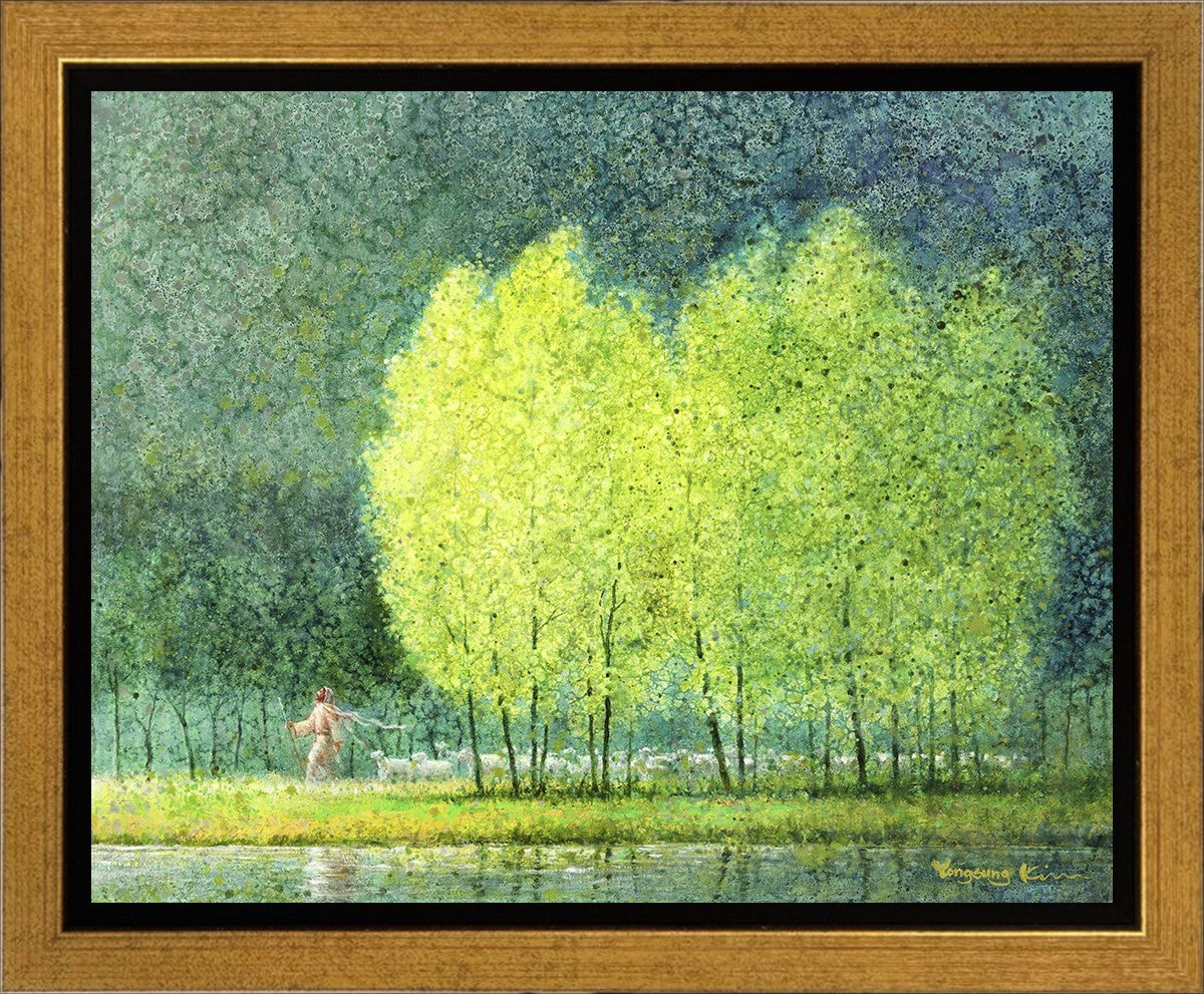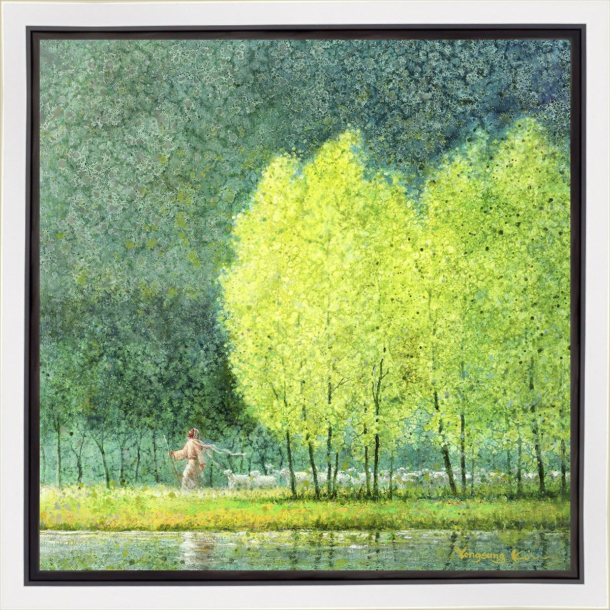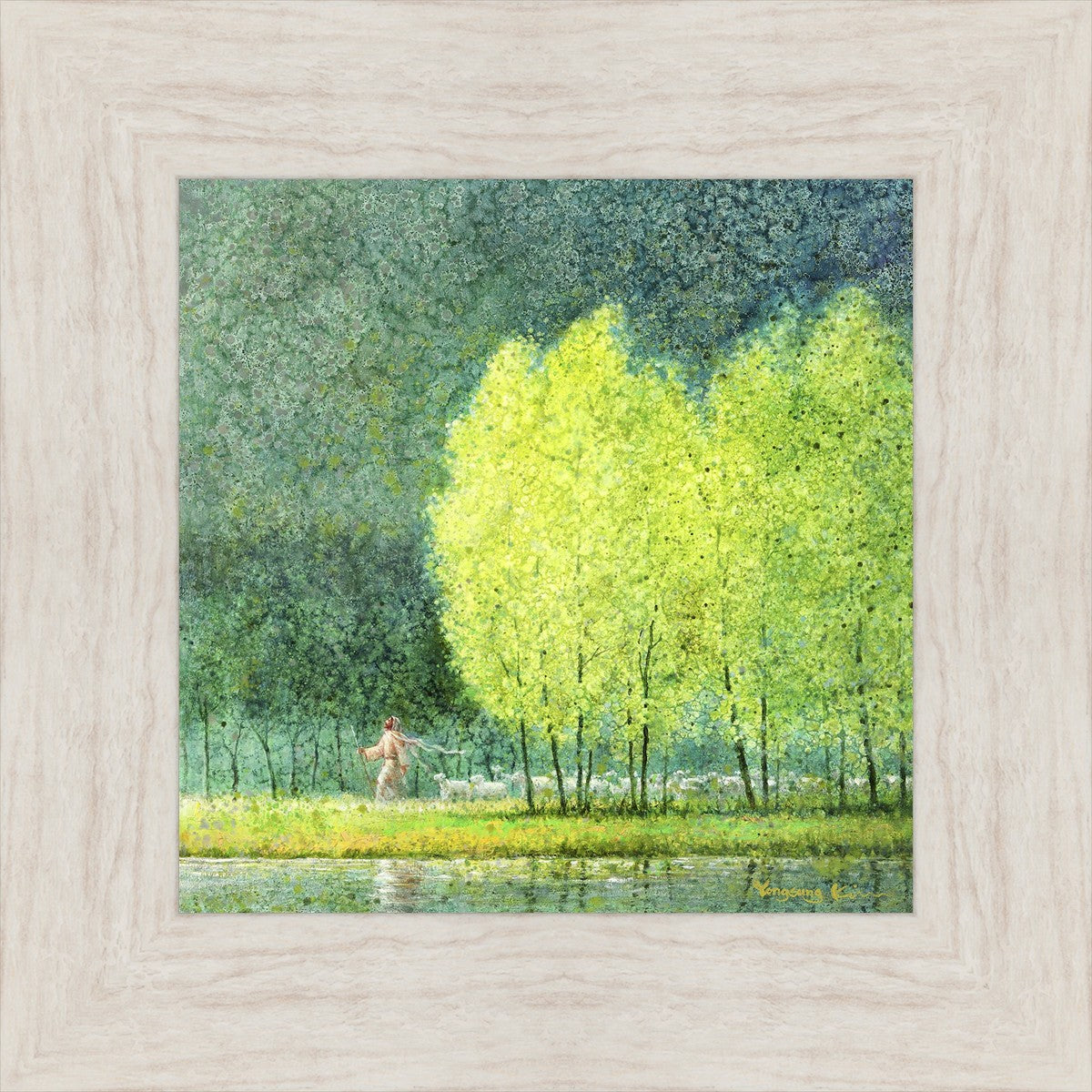Painting of Follow In His Footsteps by Yongsung Kim featuring Jesus Christ guiding his flock of sheep through a grove of greens and blues
