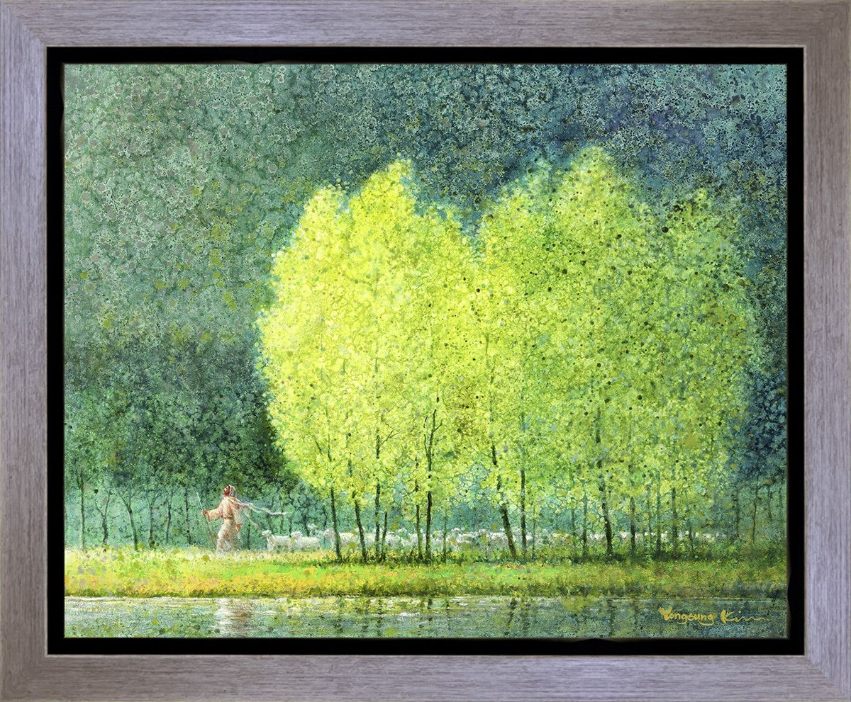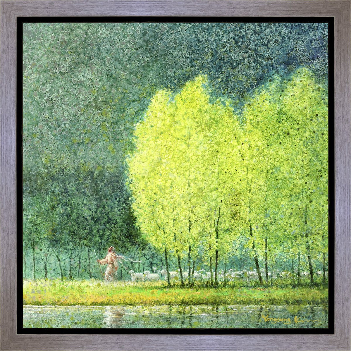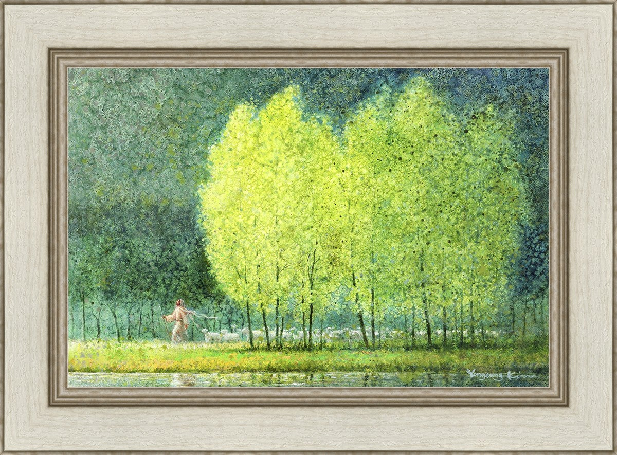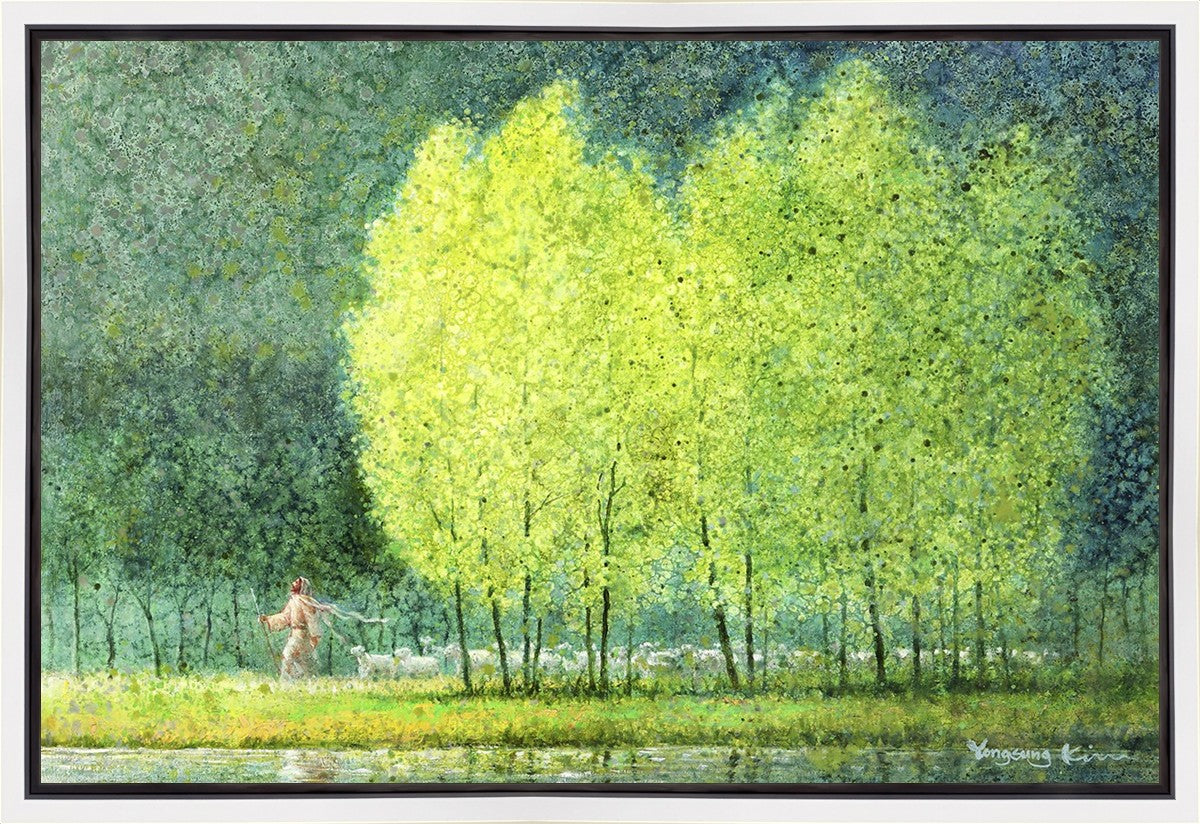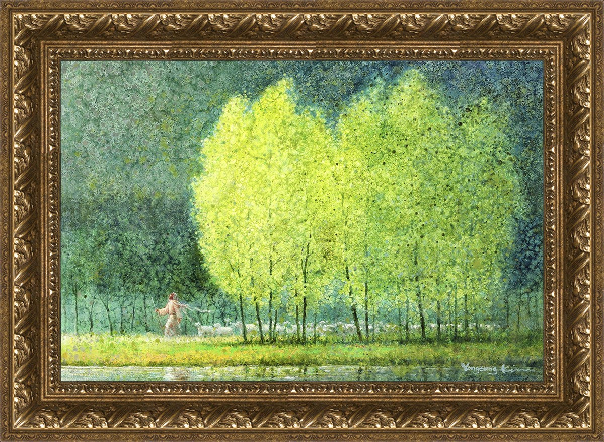 Painting of Follow In His Footsteps by Yongsung Kim featuring Jesus Christ guiding his flock of sheep through a grove of greens and blues