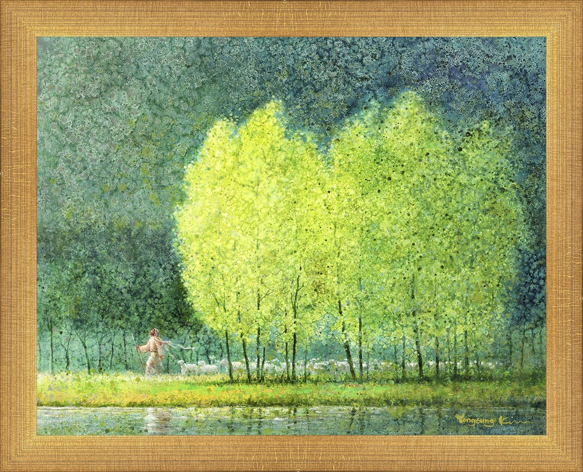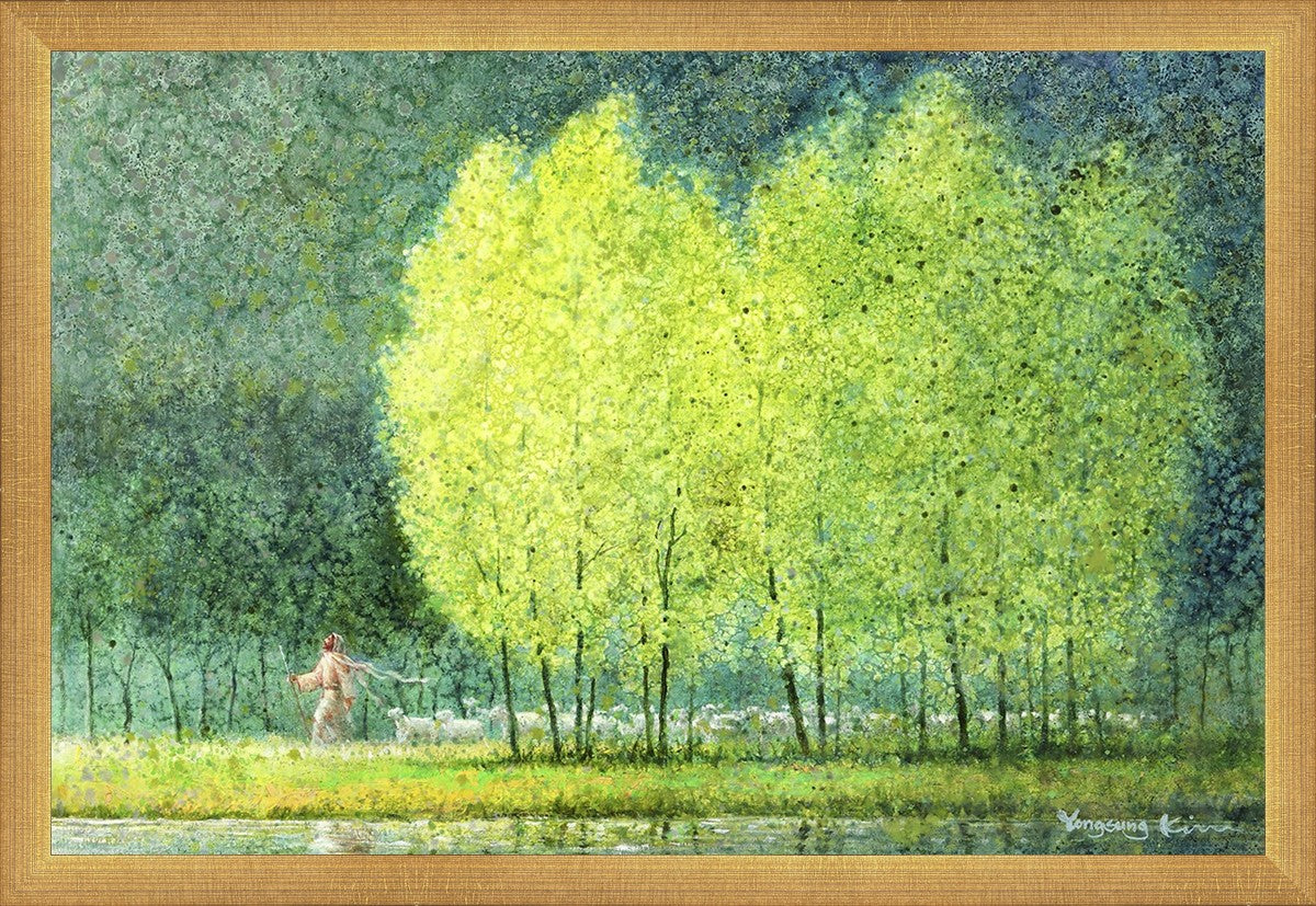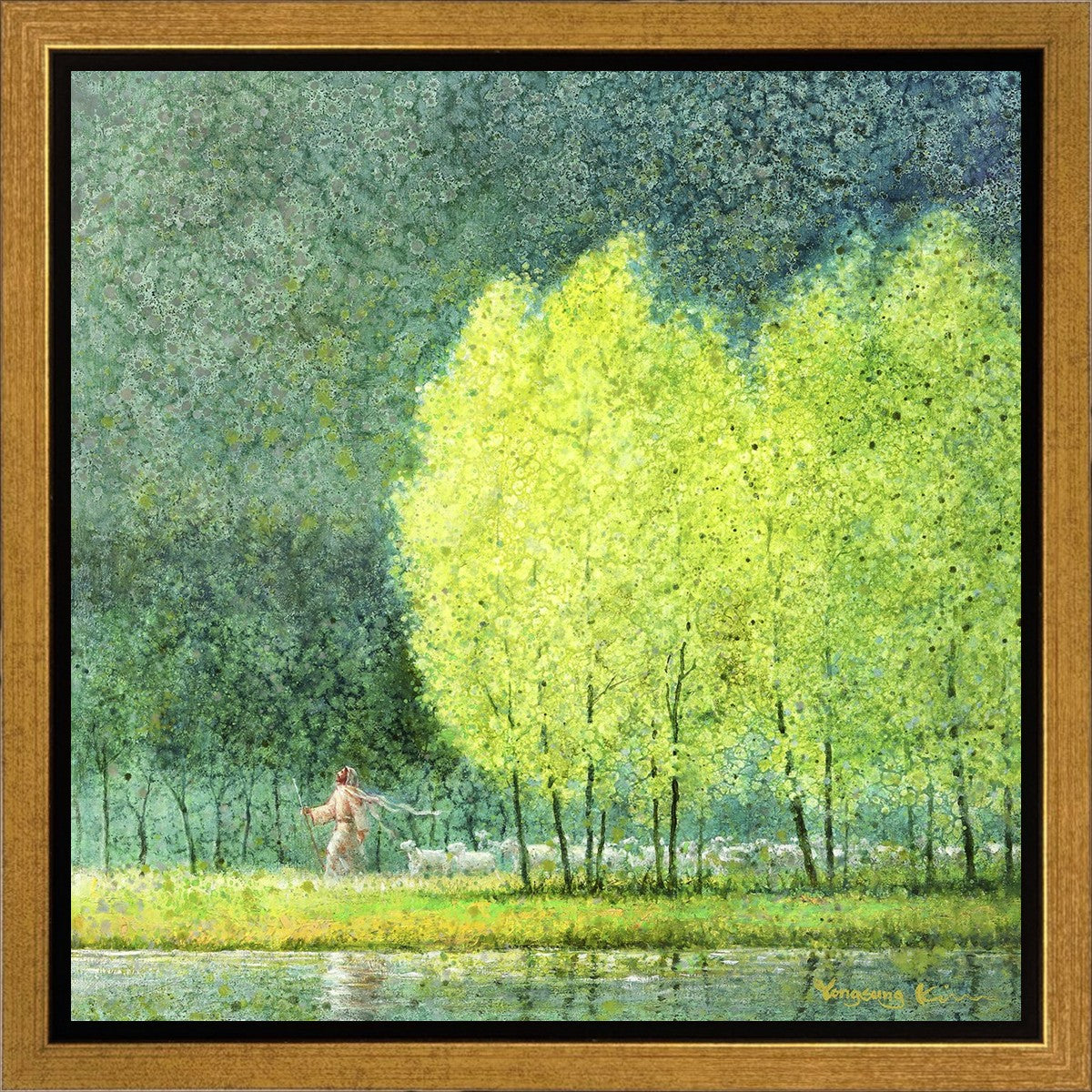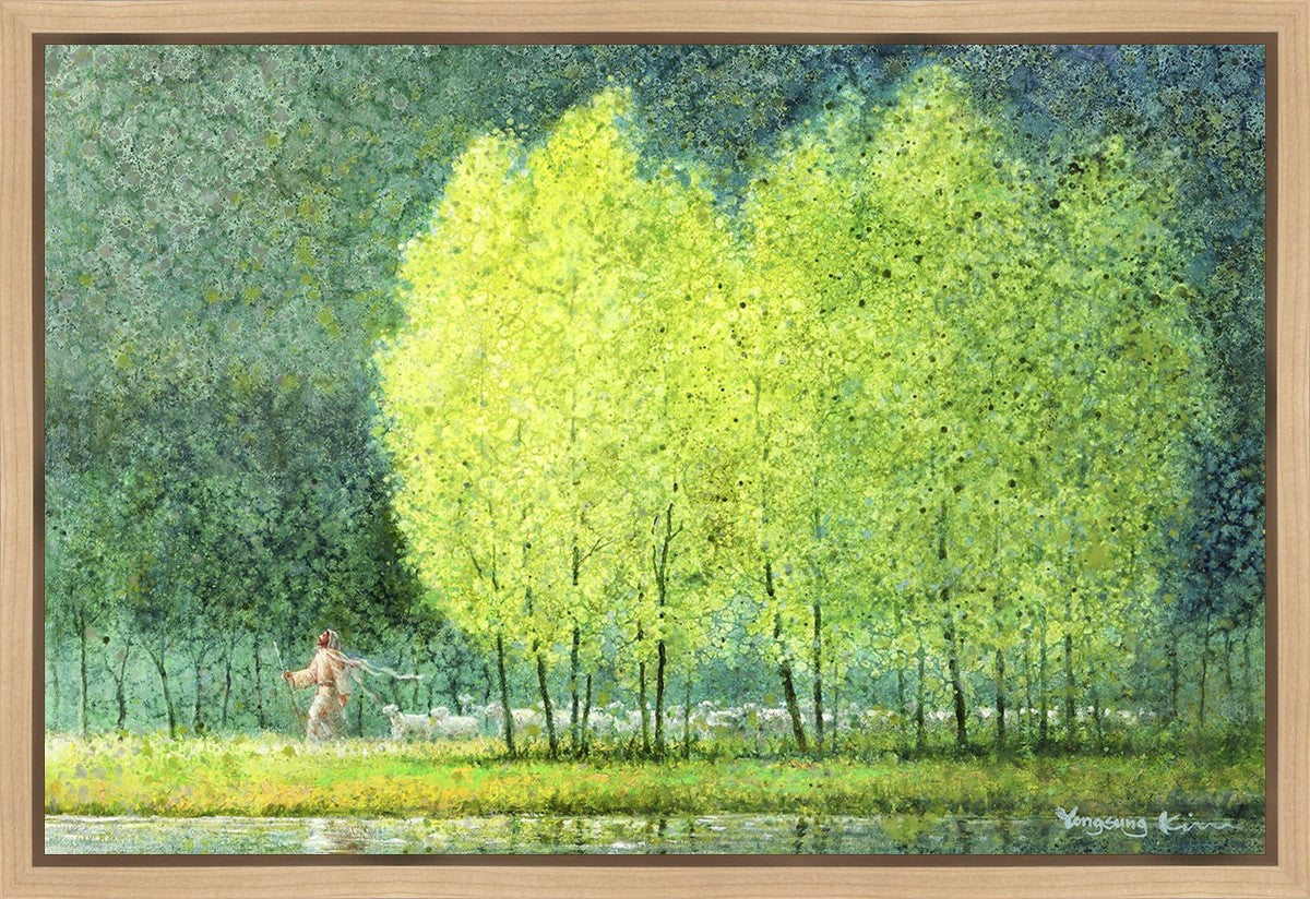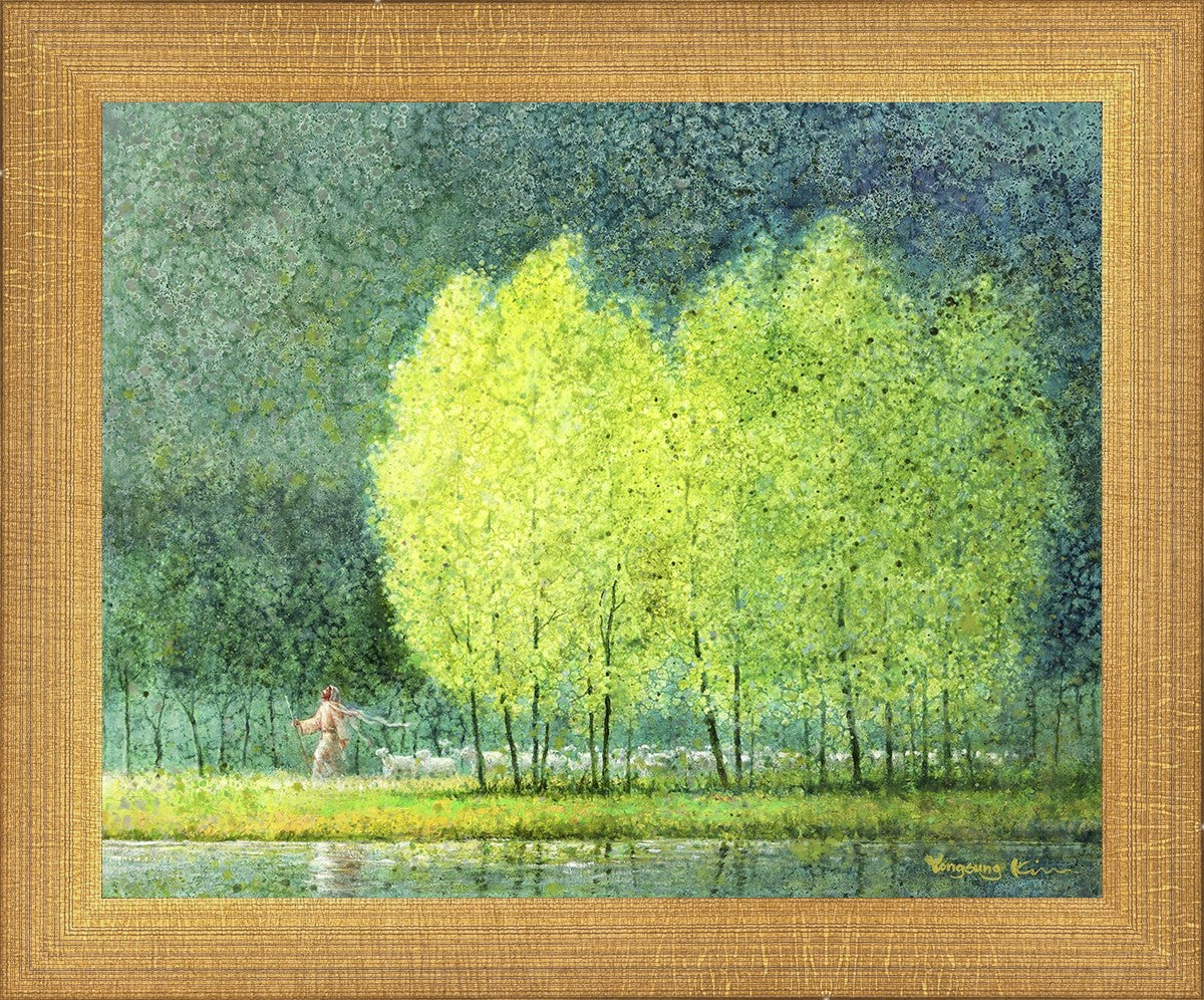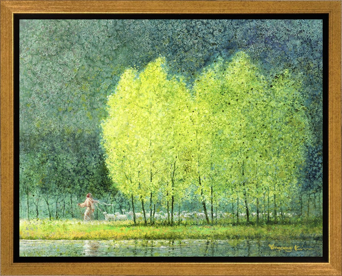 Painting of Follow In His Footsteps by Yongsung Kim featuring Jesus Christ guiding his flock of sheep through a grove of greens and blues