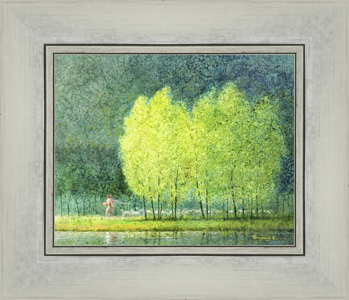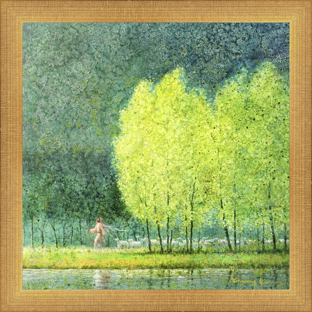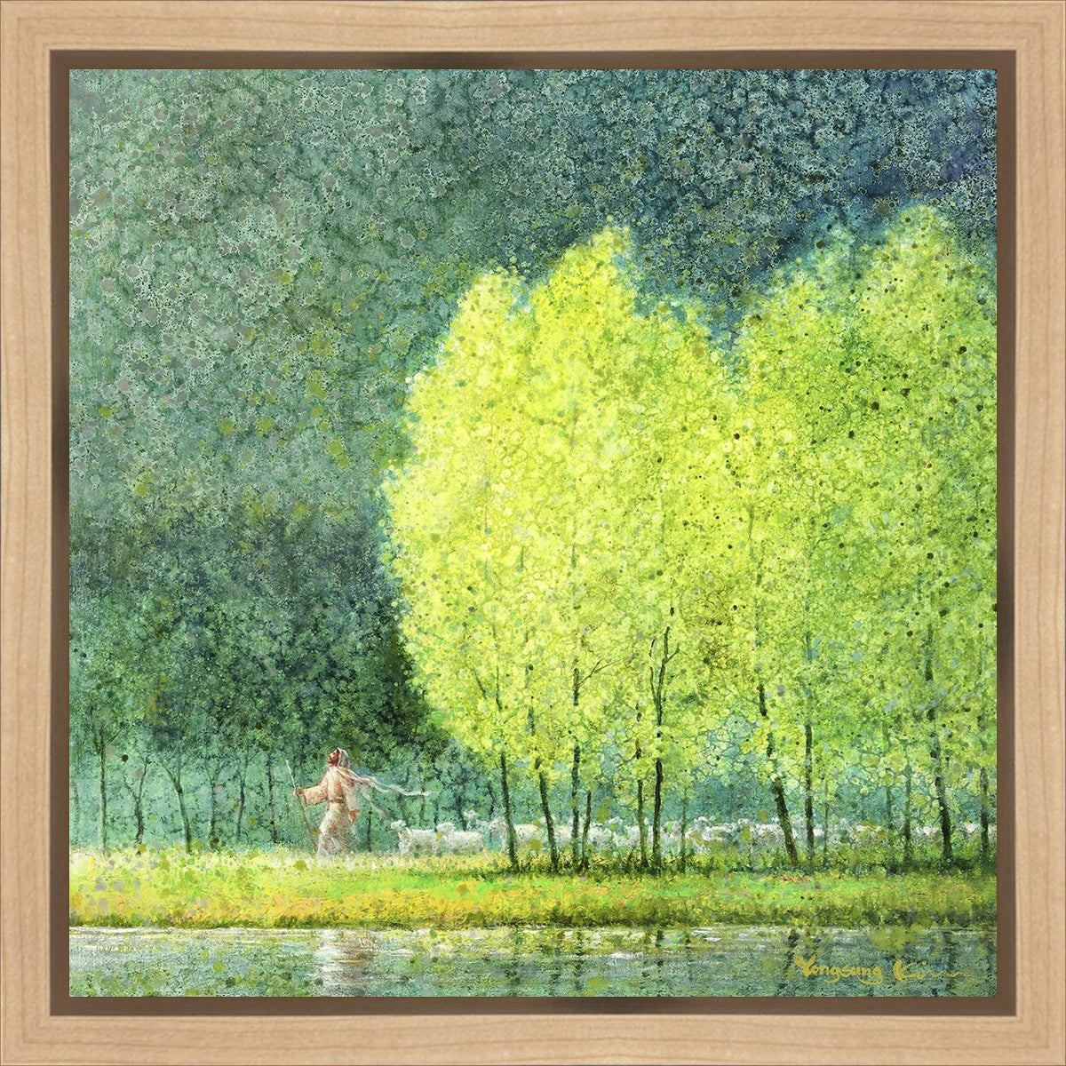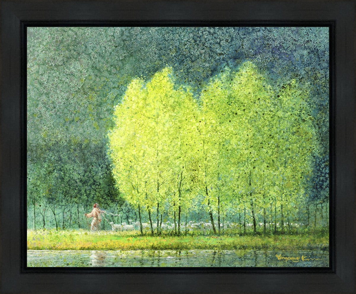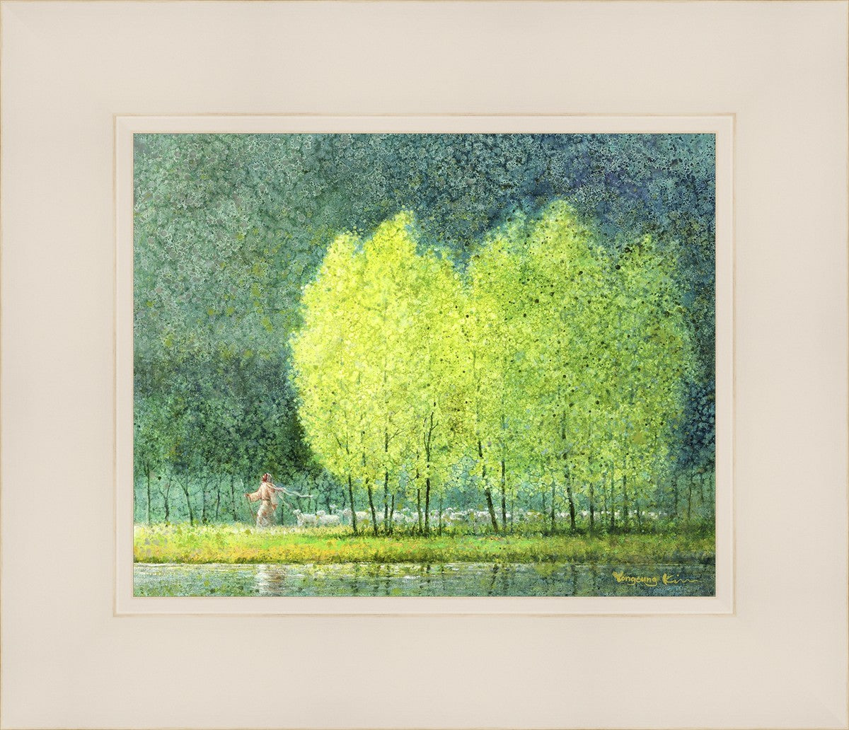 Painting of Follow In His Footsteps by Yongsung Kim featuring Jesus Christ guiding his flock of sheep through a grove of greens and blues