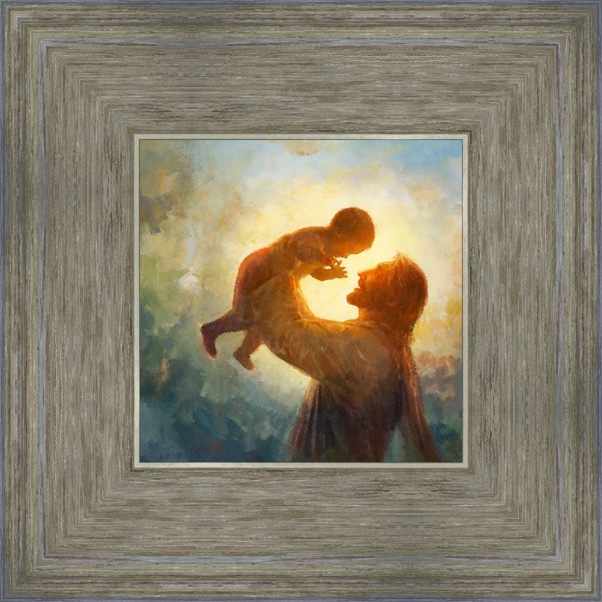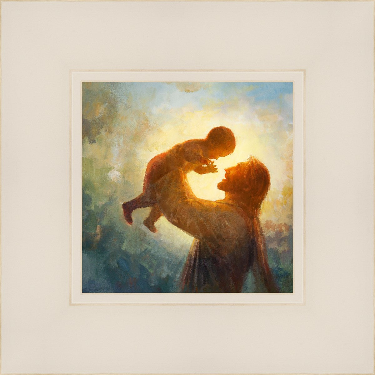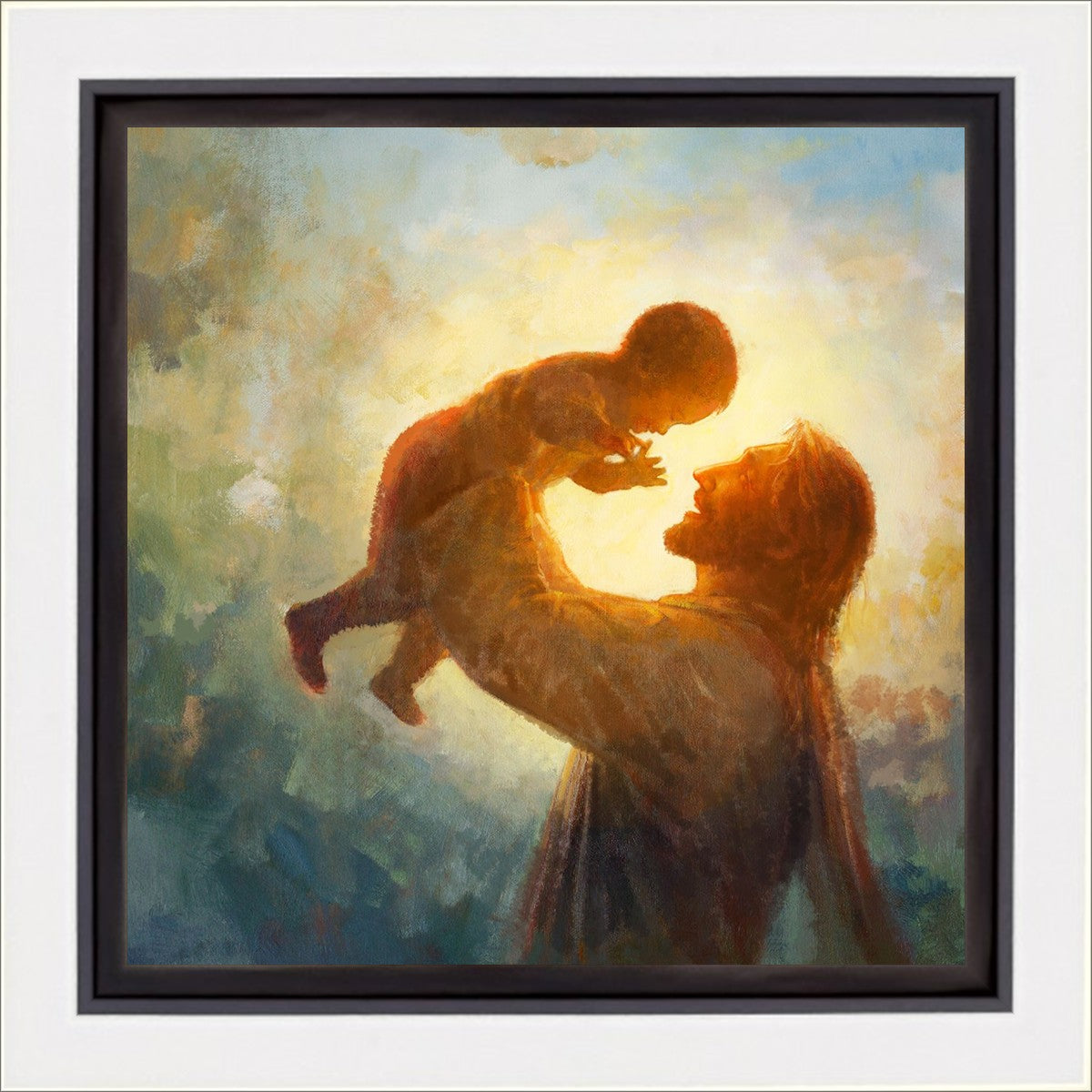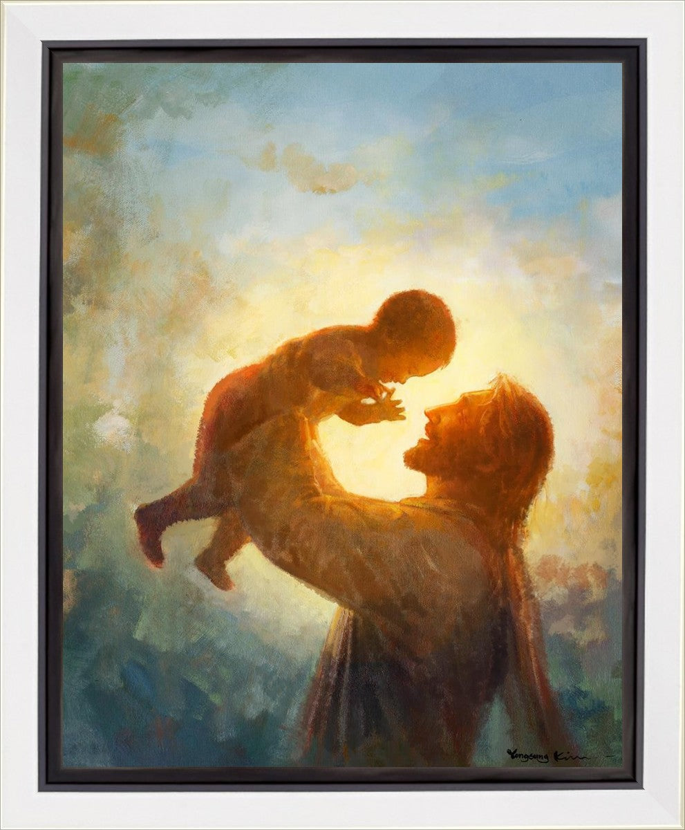 "Heaven's Gift" by Yongsung Kim is a touching painting depicting Christ lifting a child up and smiling, showcasing His love and compassion.