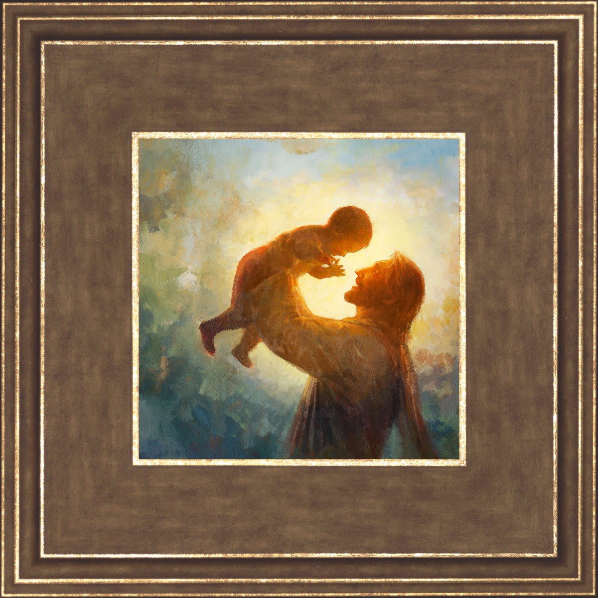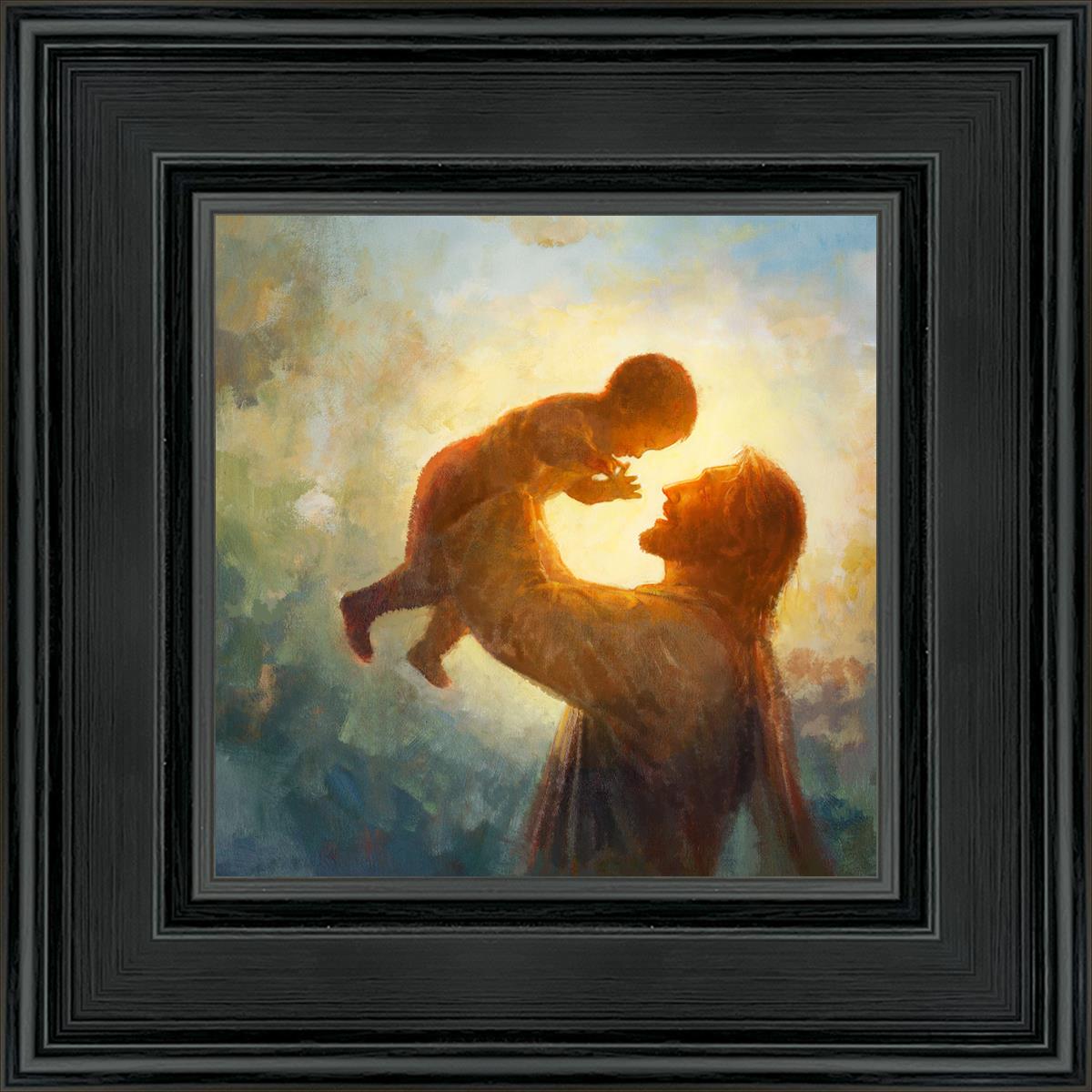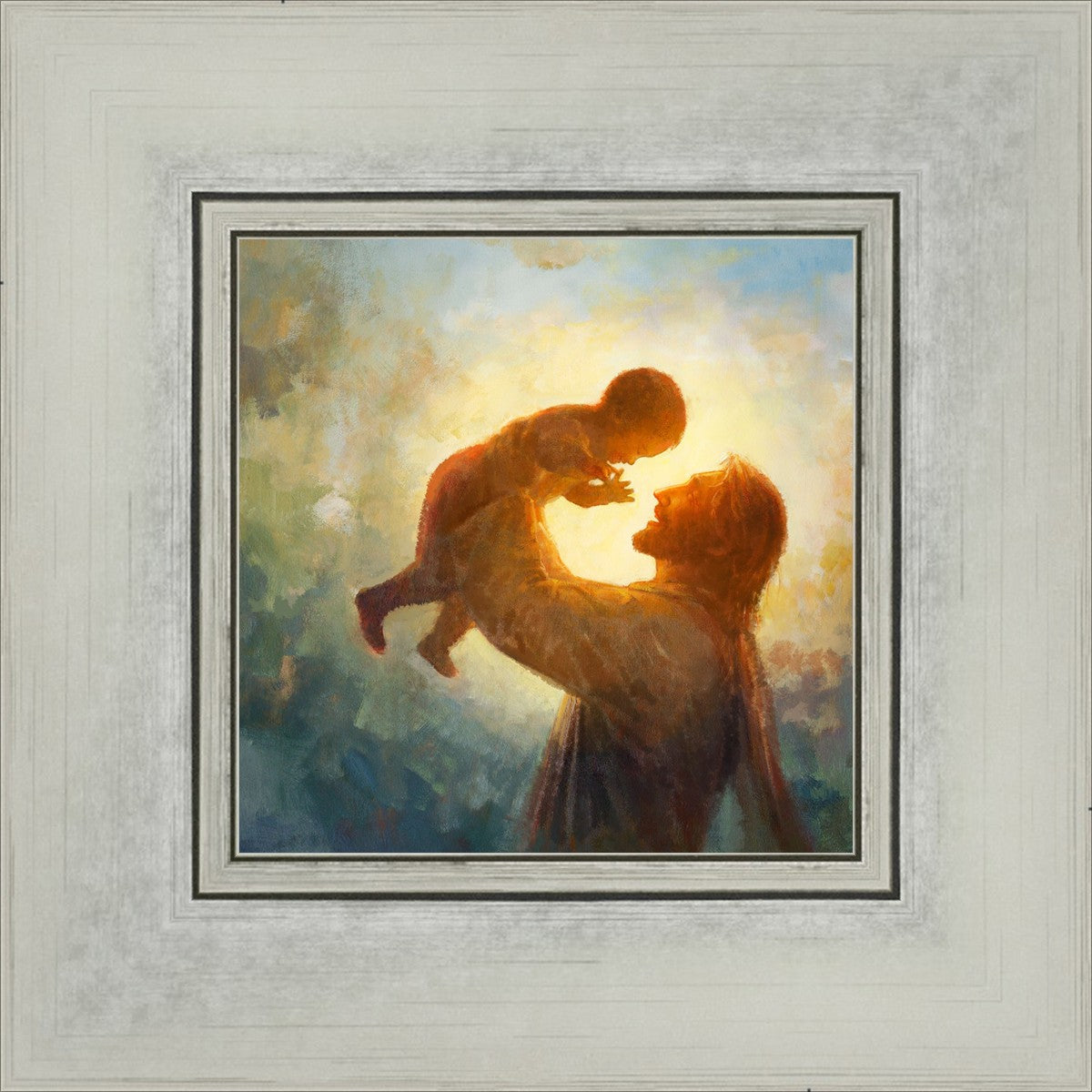 "Heaven's Gift" by Yongsung Kim is a touching painting depicting Christ lifting a child up and smiling, showcasing His love and compassion.