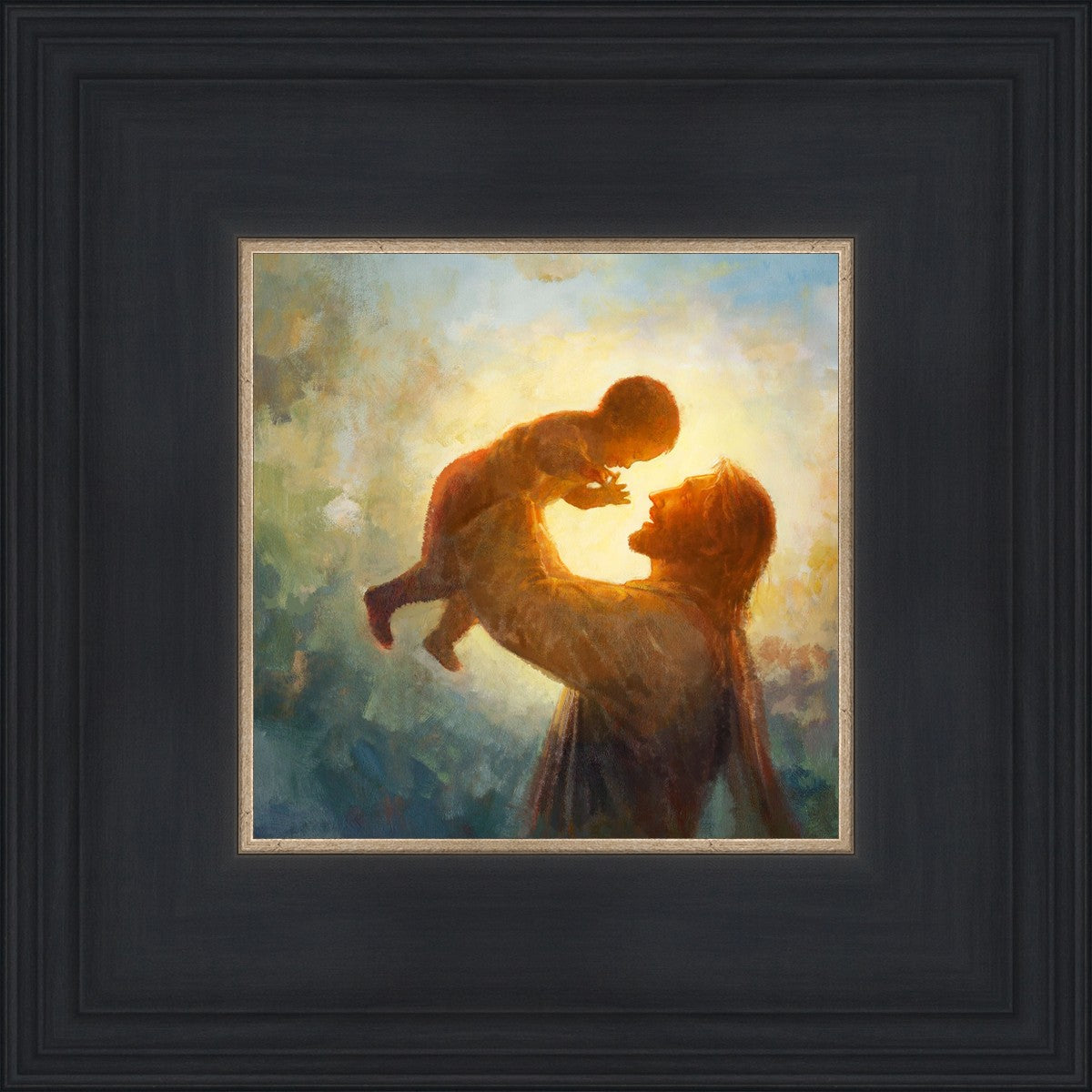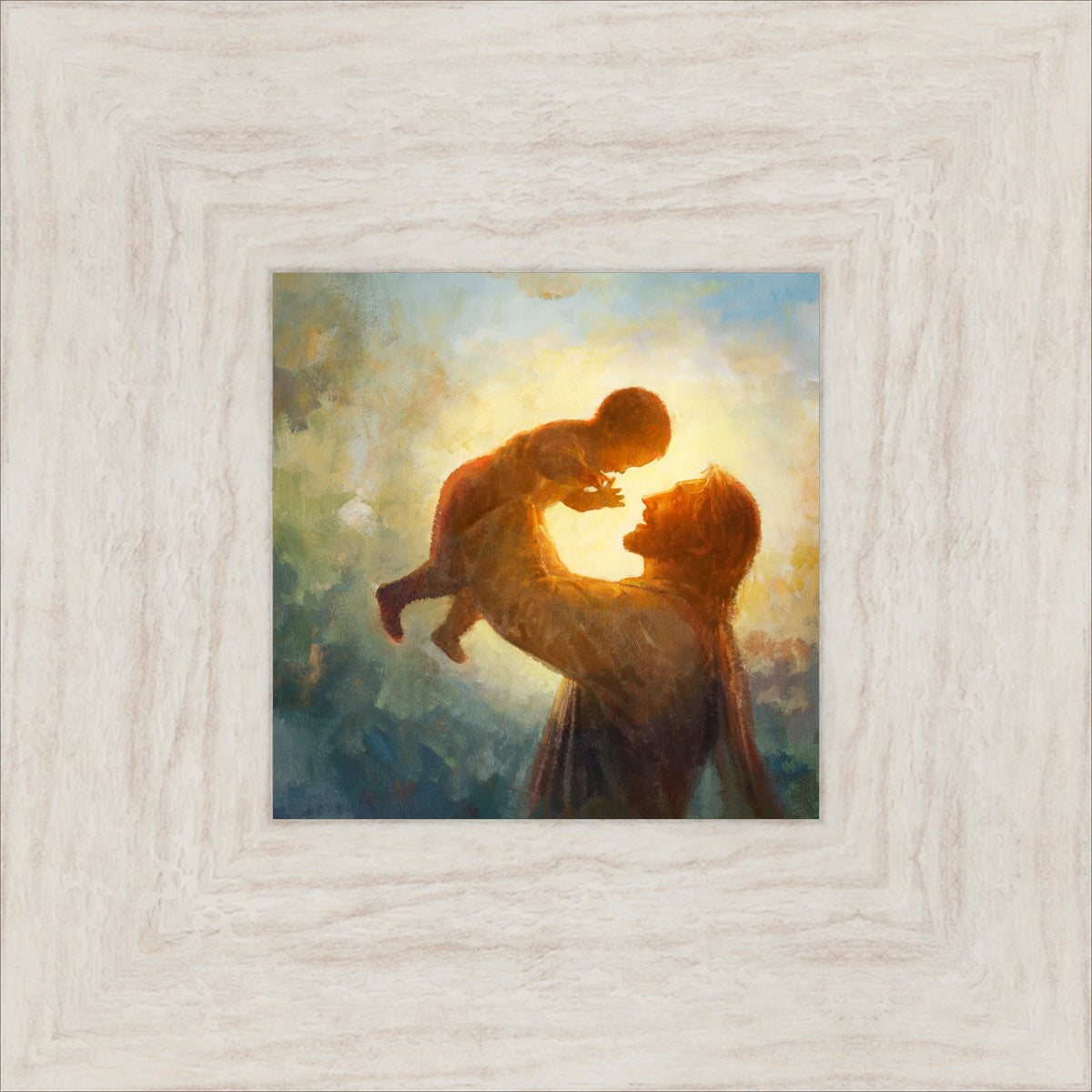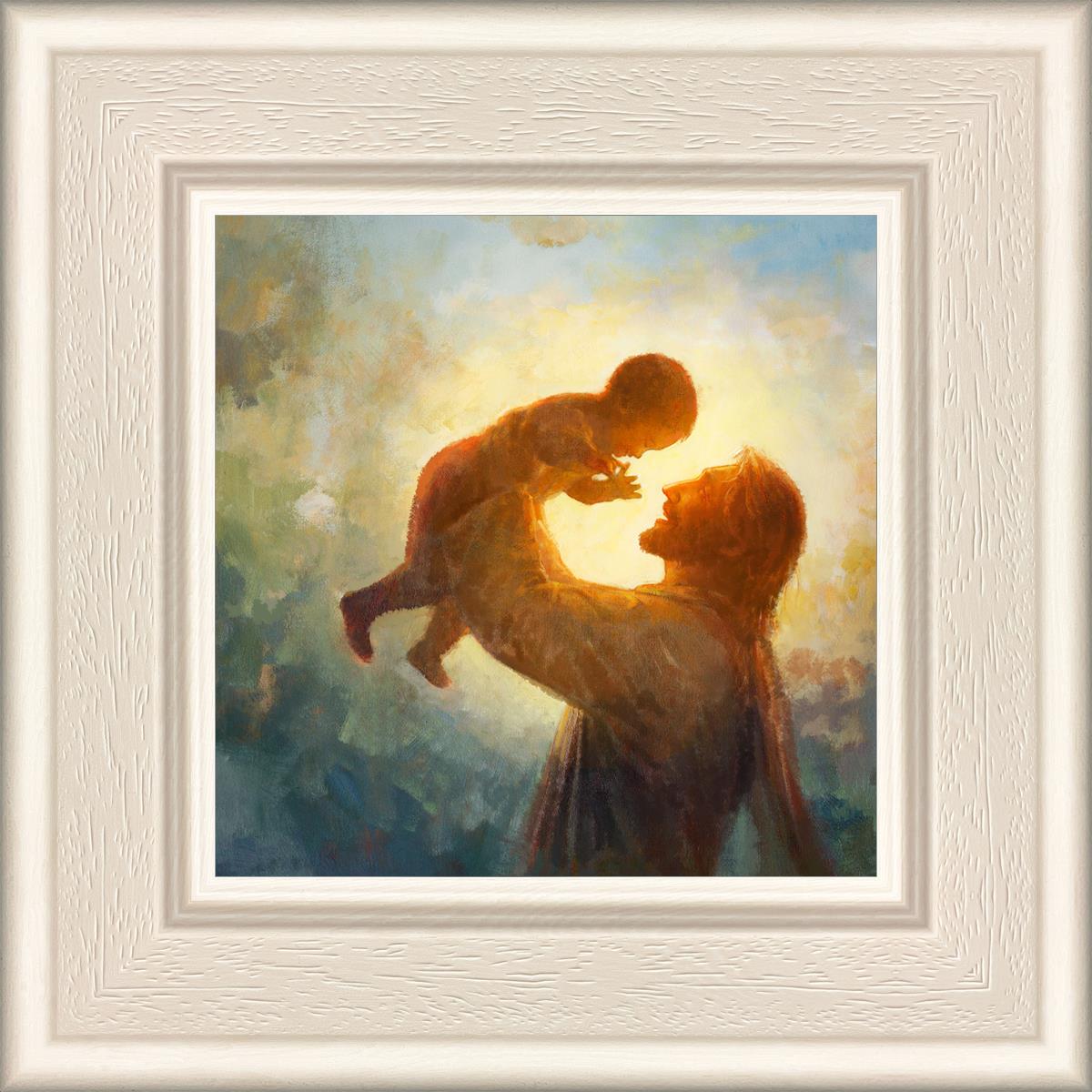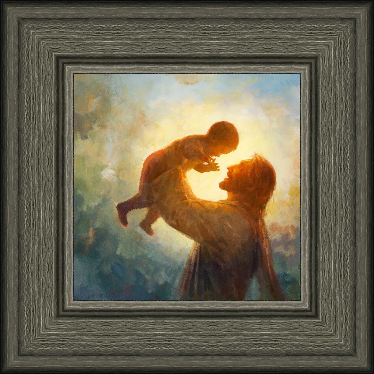 "Heaven's Gift" by Yongsung Kim is a touching painting depicting Christ lifting a child up and smiling, showcasing His love and compassion.