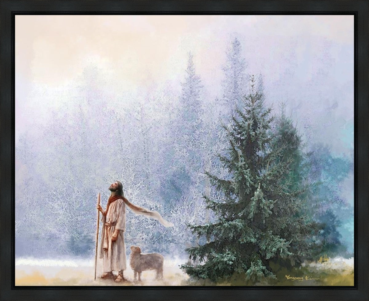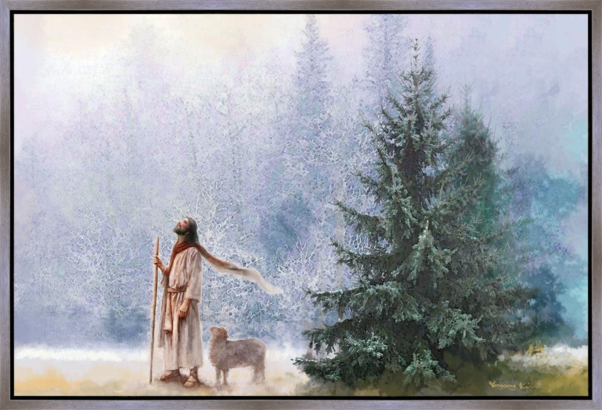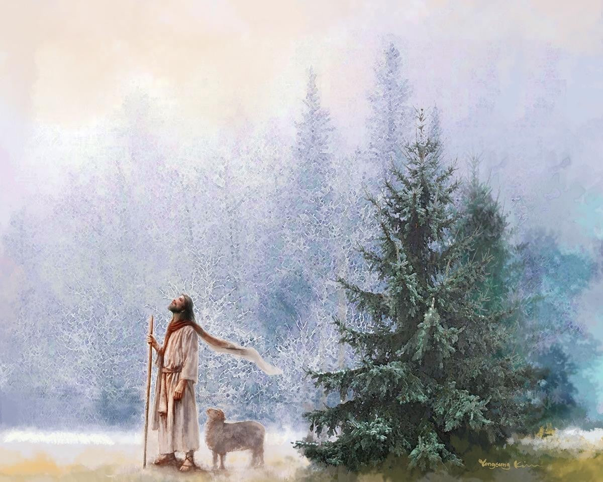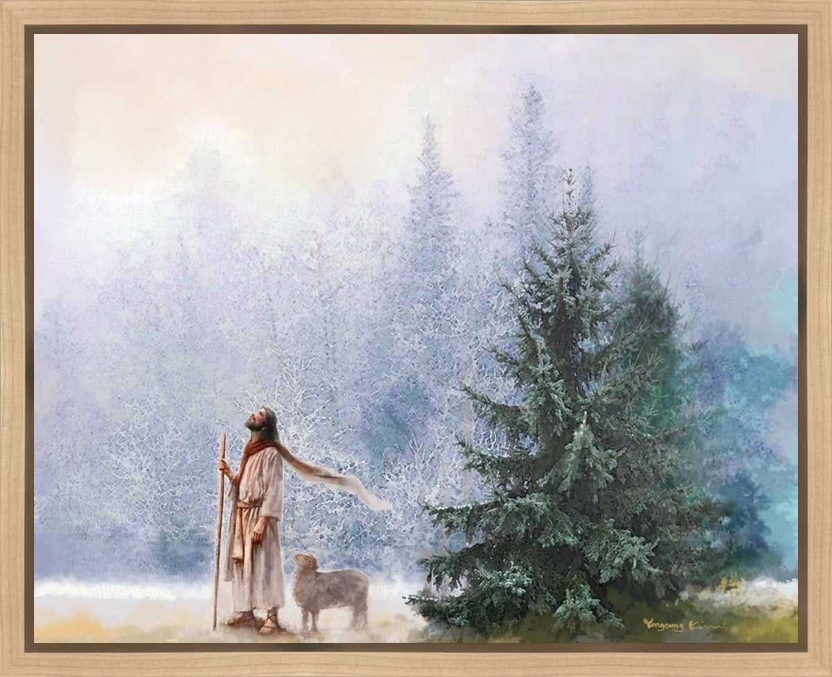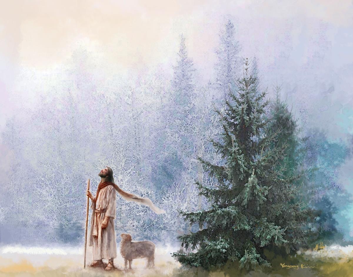 Heavenward by Yongsung Kim depicts Jesus, surrounded by trees, walking with a lamb and looking upward to the Heavens.