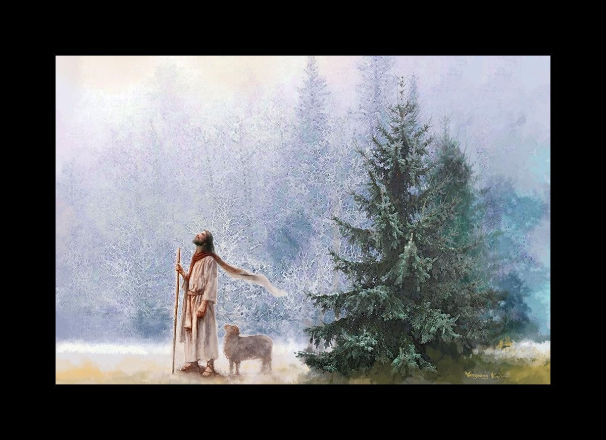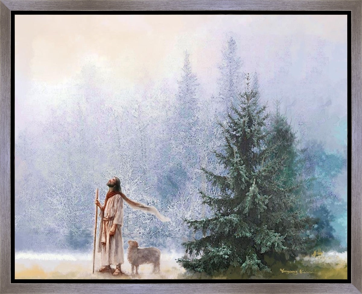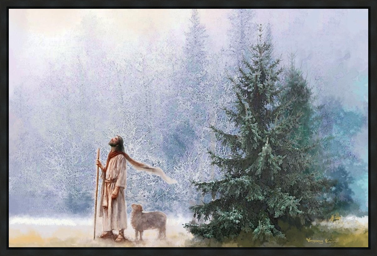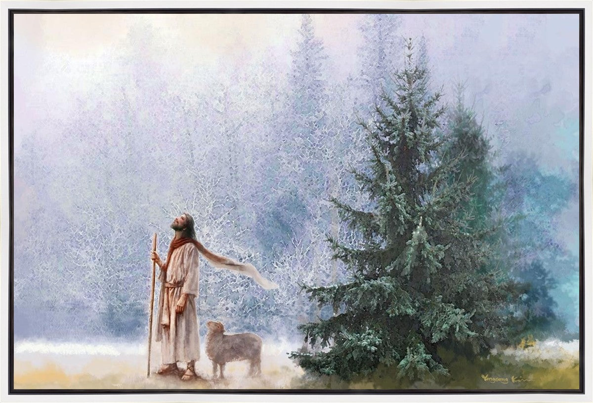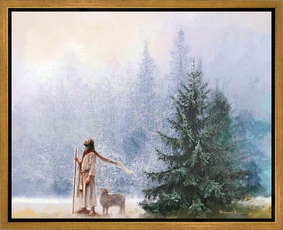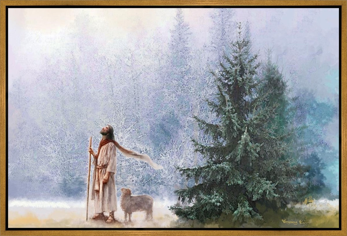 Heavenward by Yongsung Kim depicts Jesus, surrounded by trees, walking with a lamb and looking upward to the Heavens.