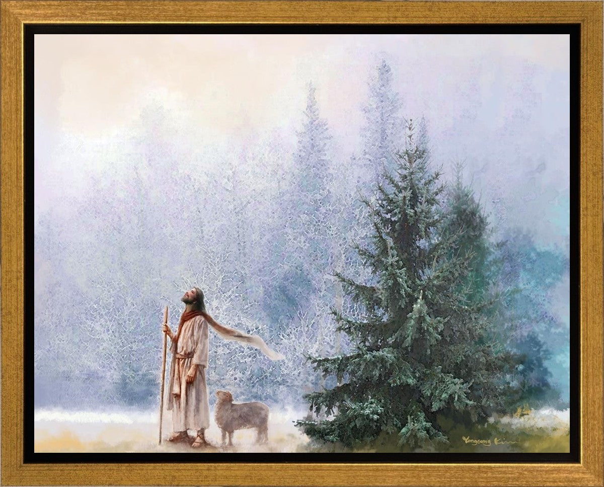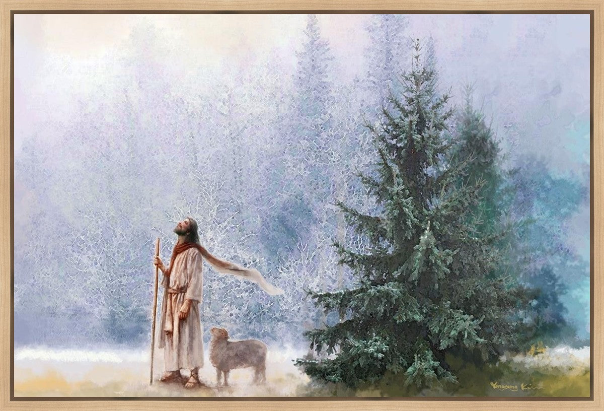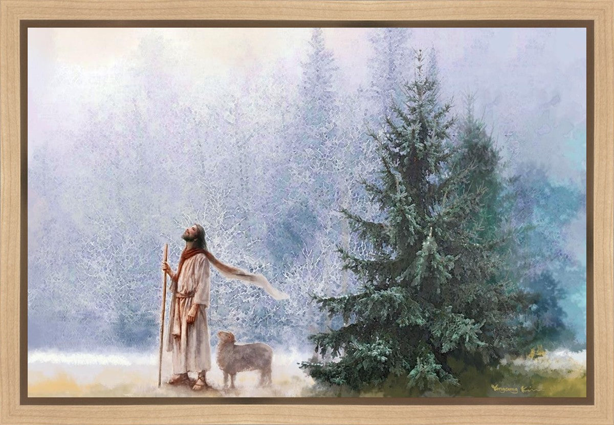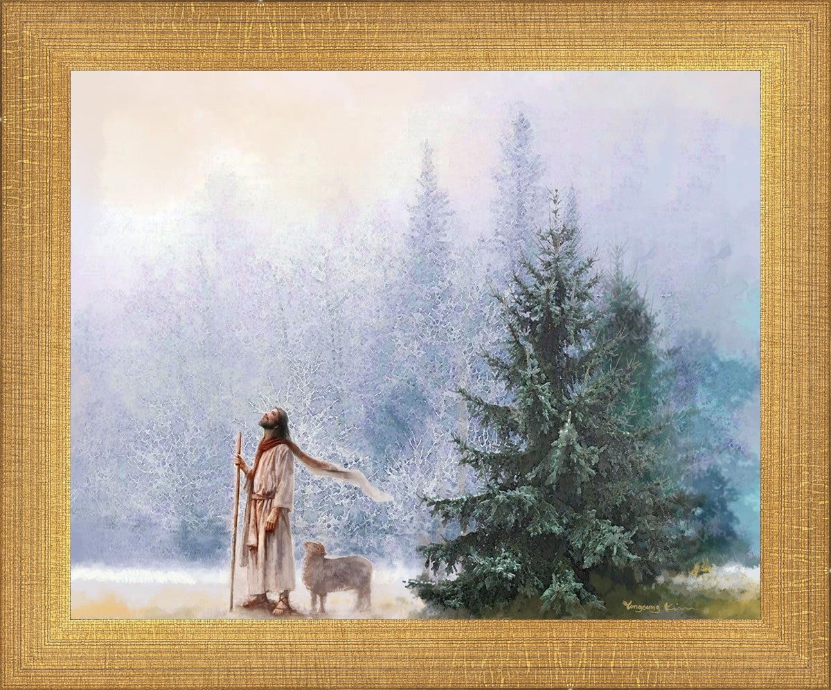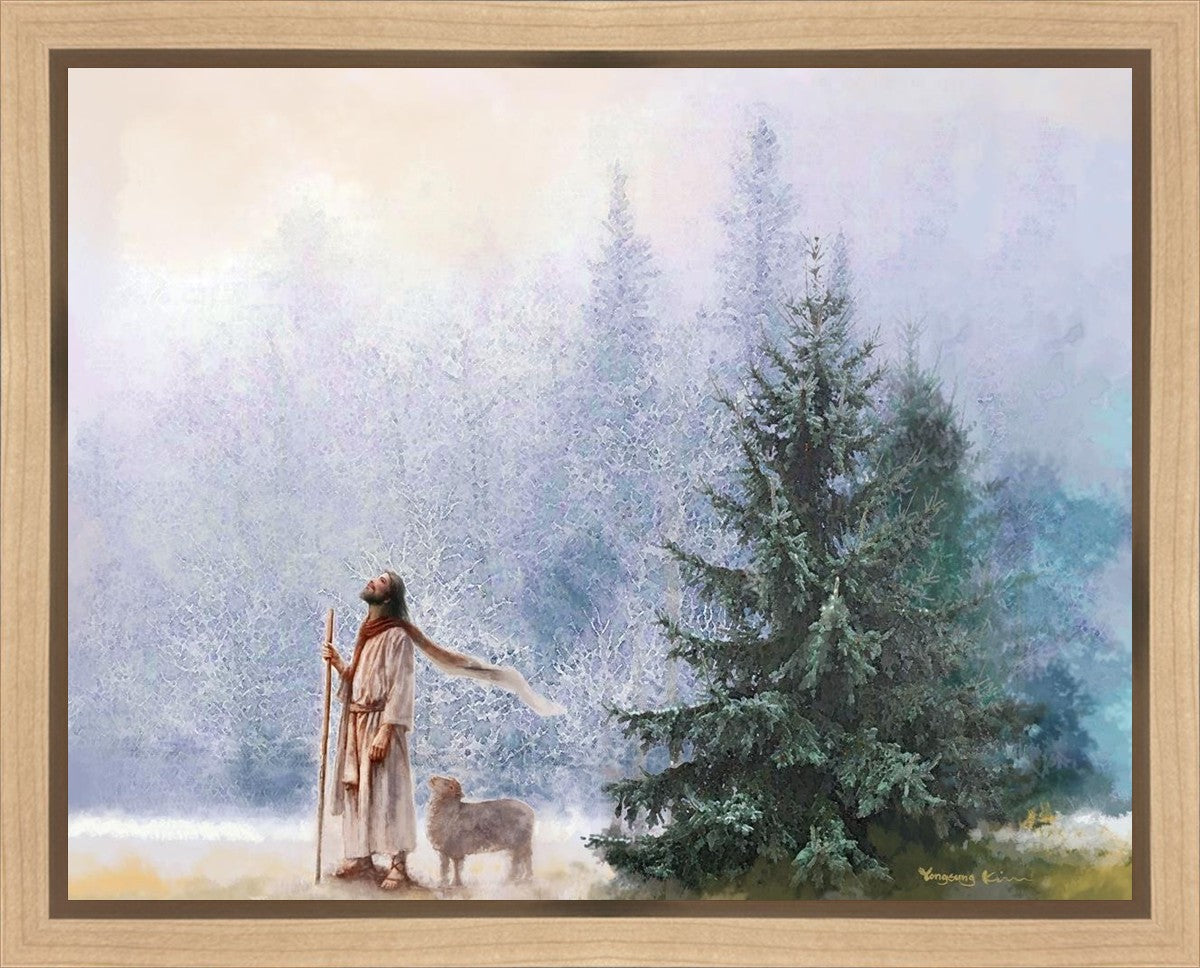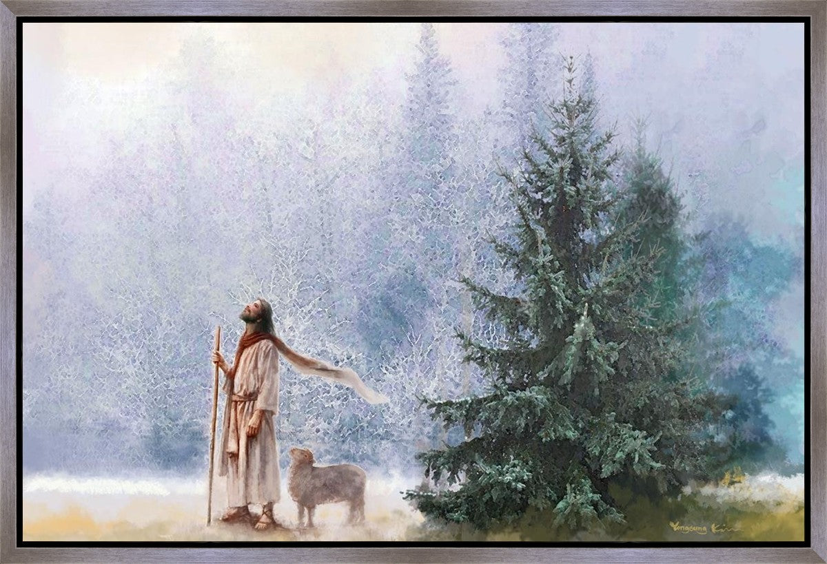 Heavenward by Yongsung Kim depicts Jesus, surrounded by trees, walking with a lamb and looking upward to the Heavens.
