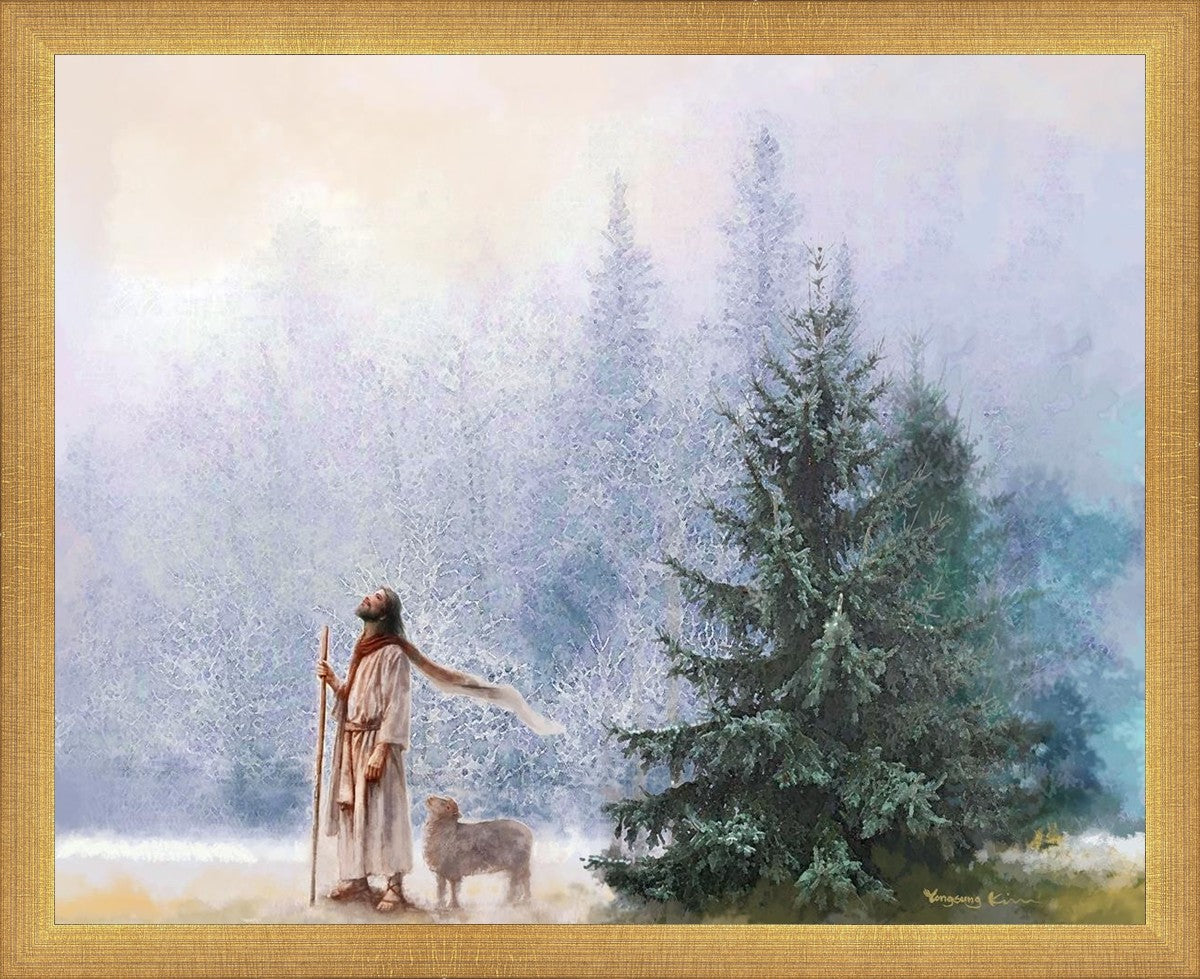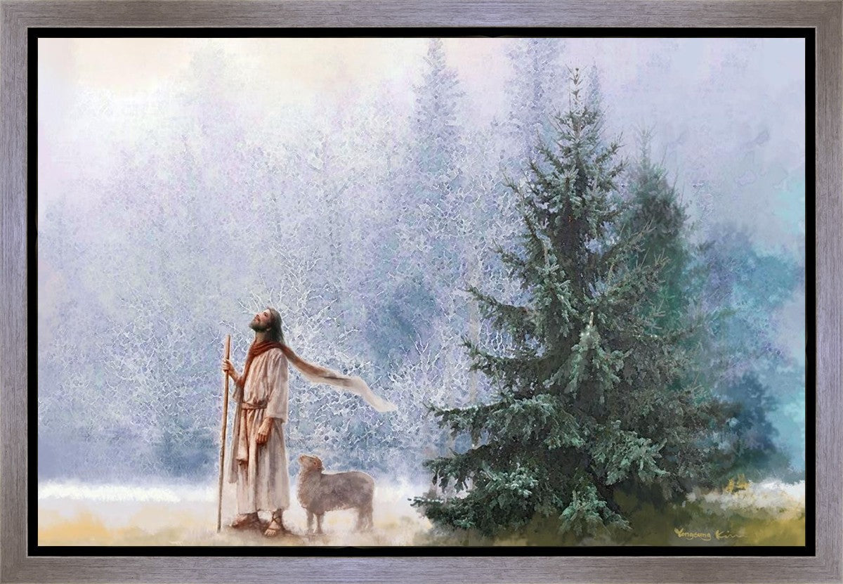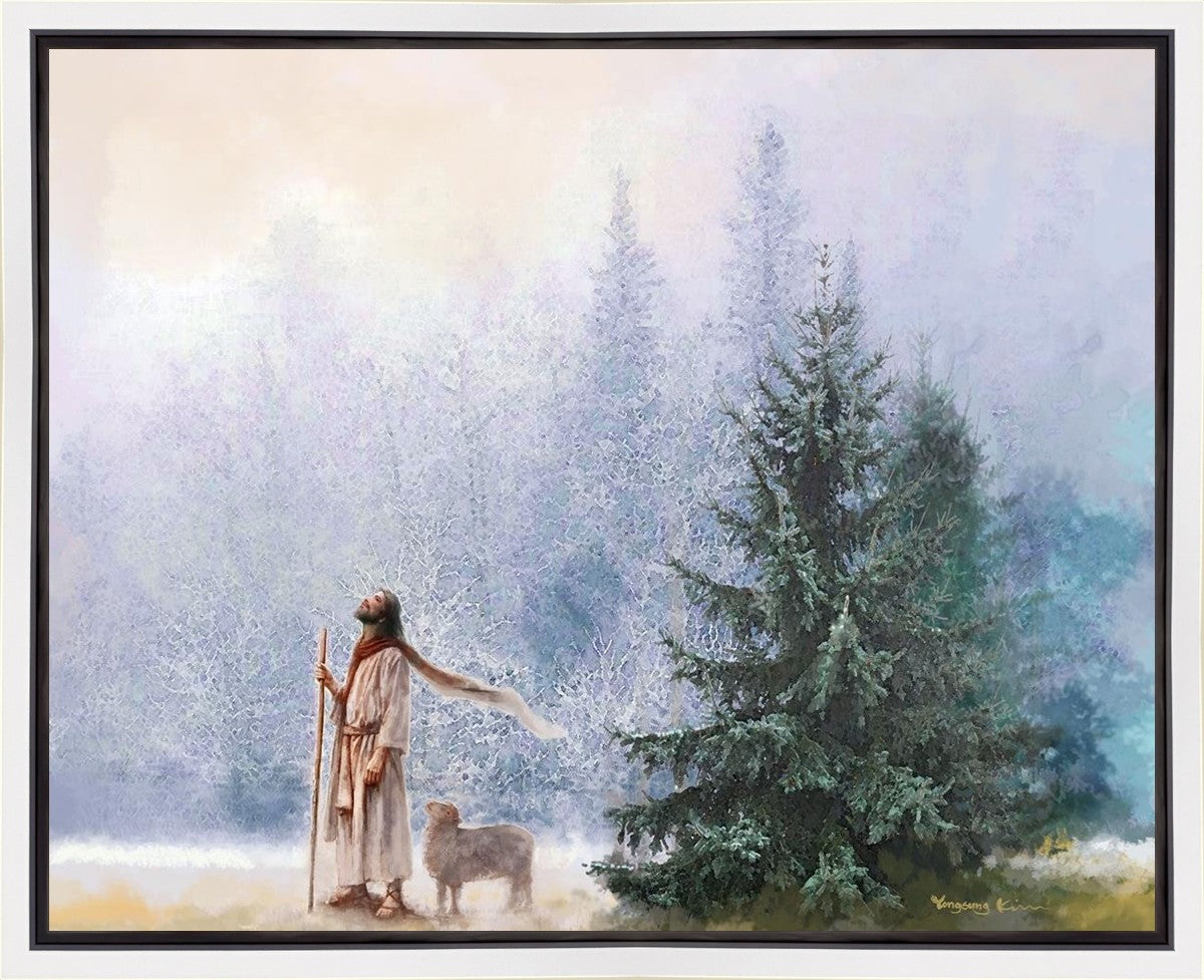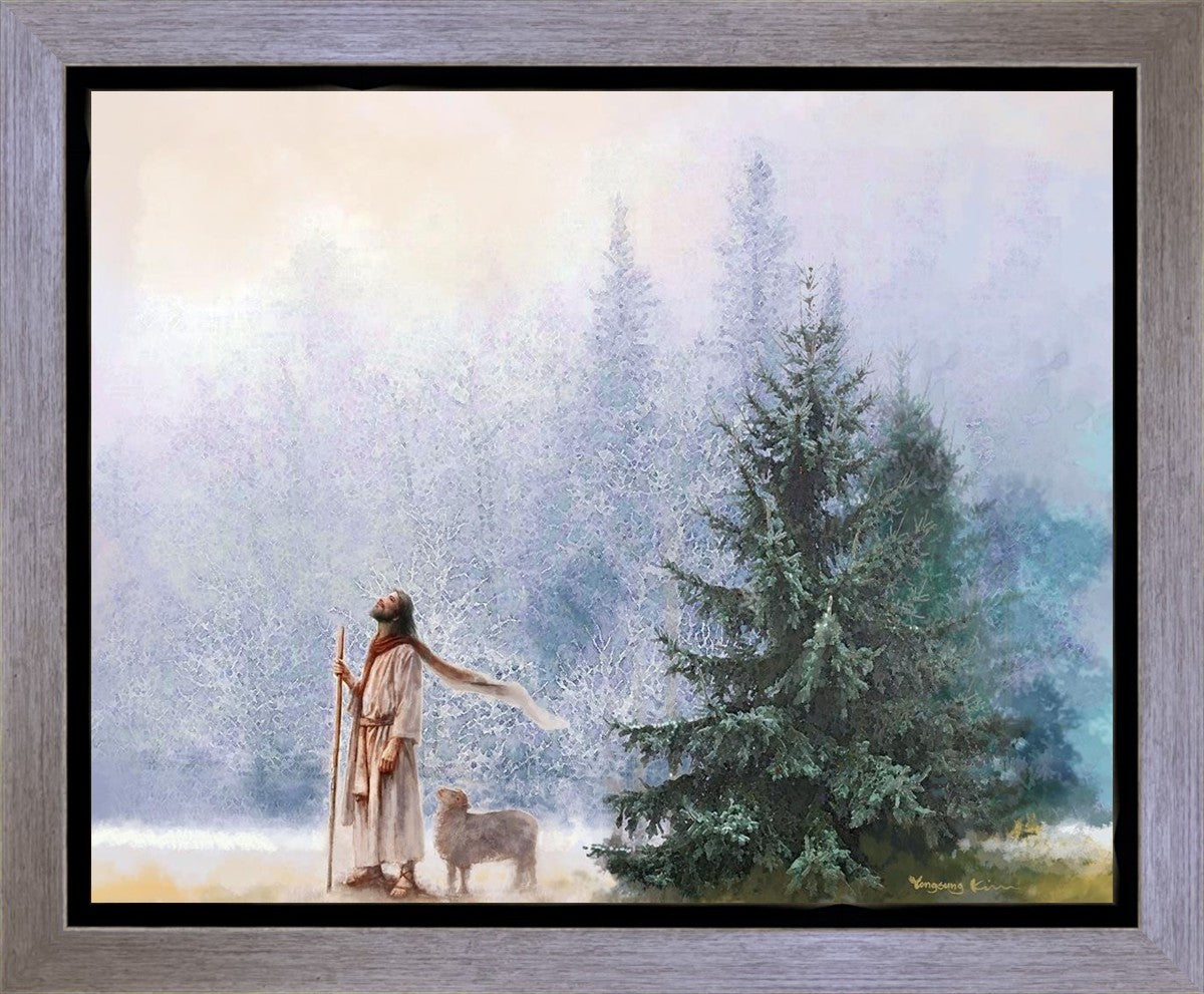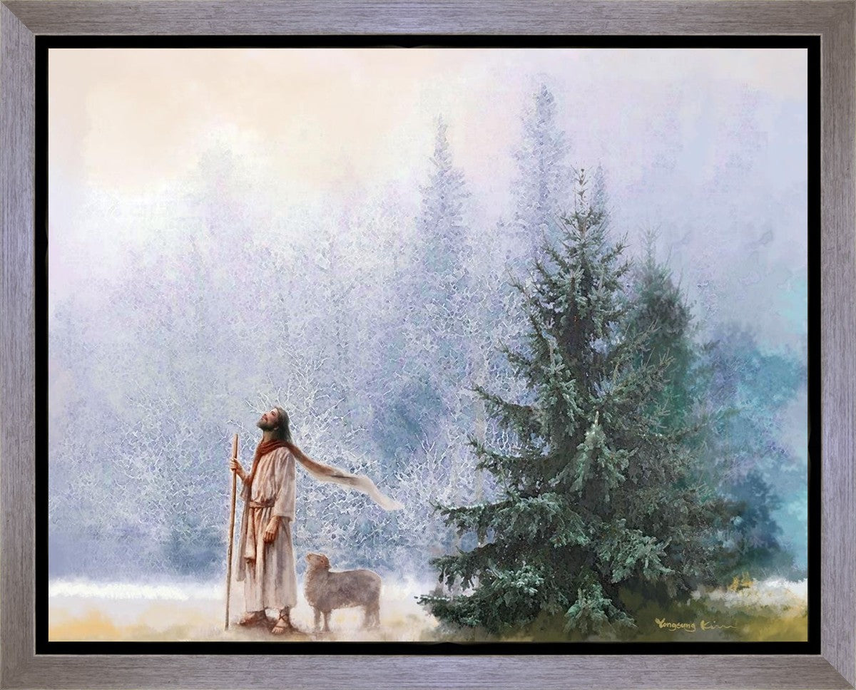 Heavenward by Yongsung Kim depicts Jesus, surrounded by trees, walking with a lamb and looking upward to the Heavens.