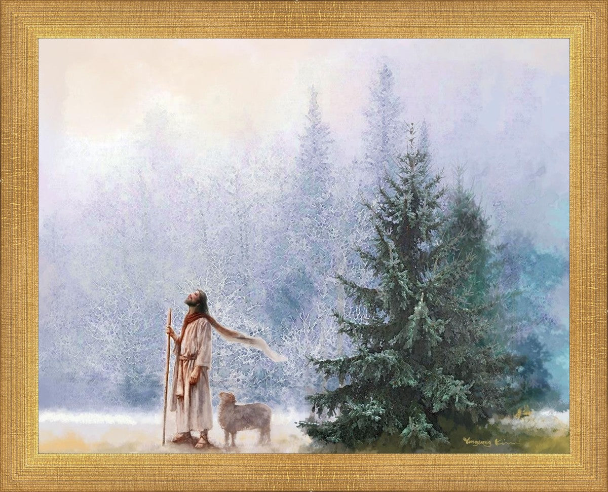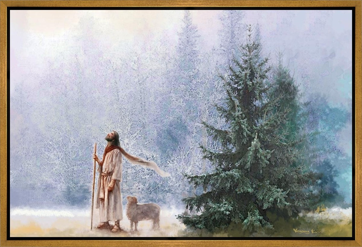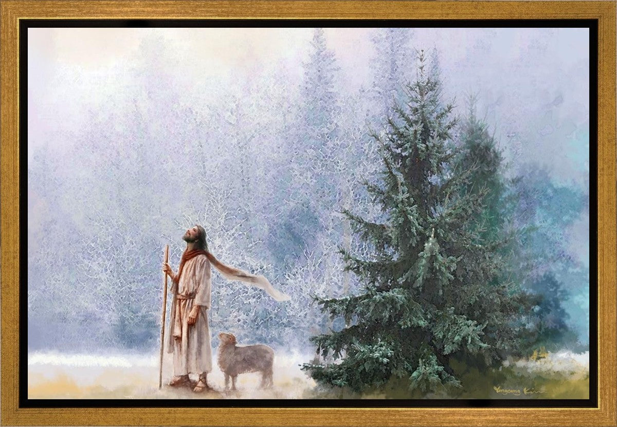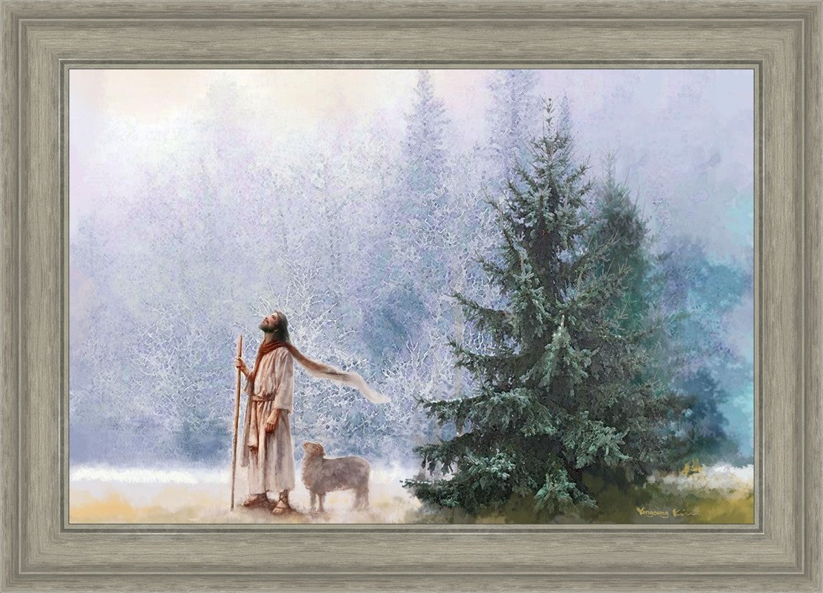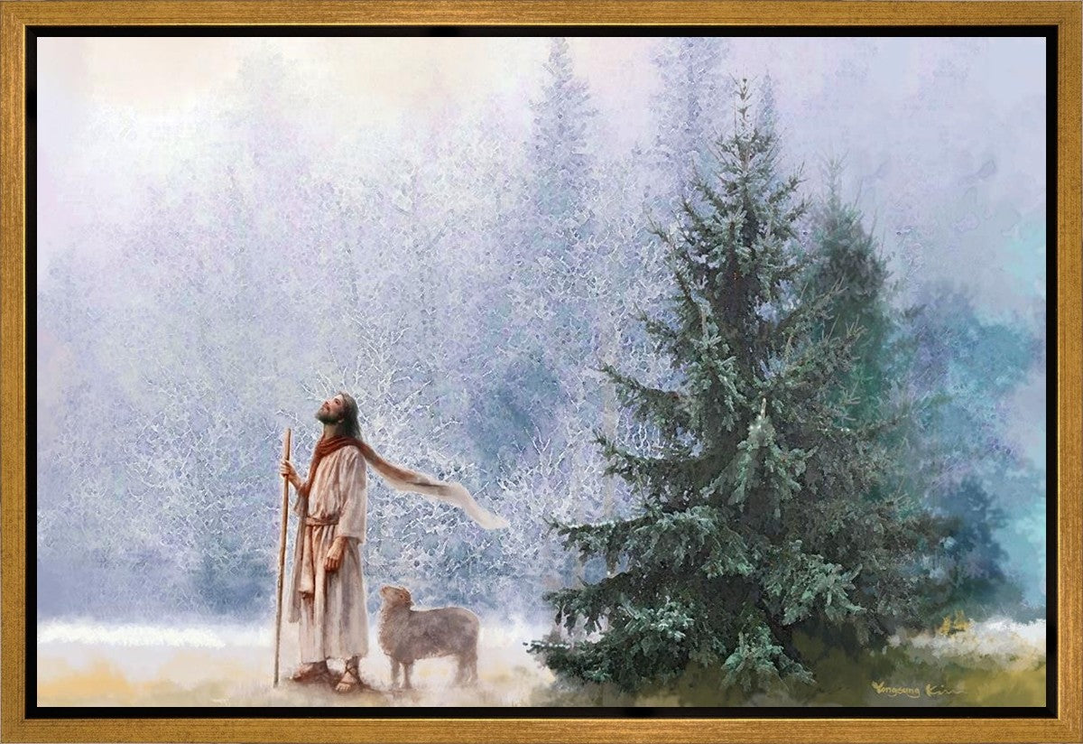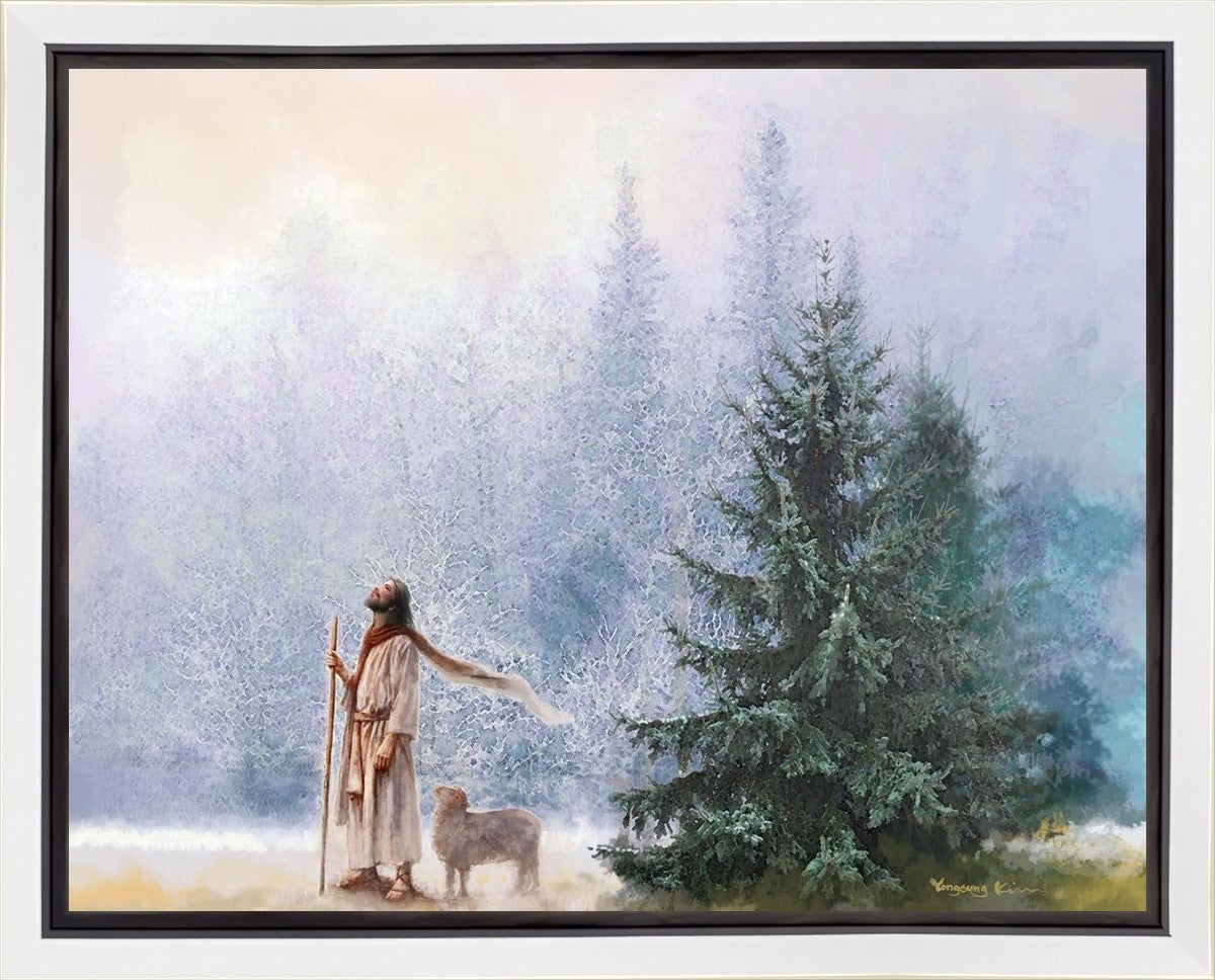 Heavenward by Yongsung Kim depicts Jesus, surrounded by trees, walking with a lamb and looking upward to the Heavens.