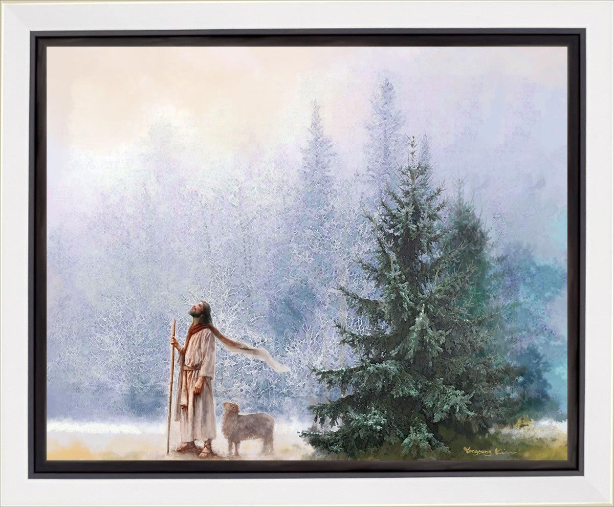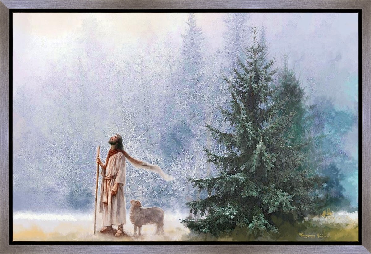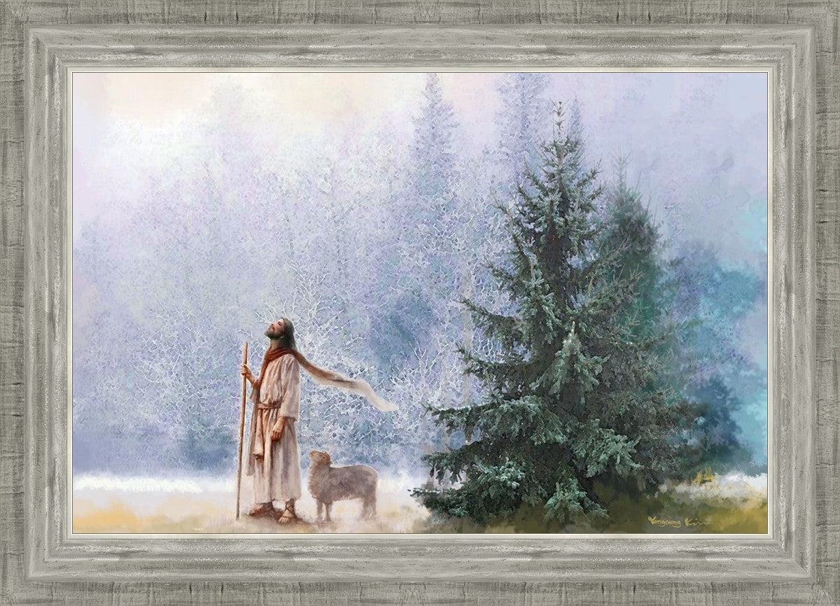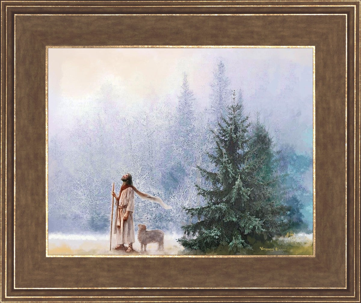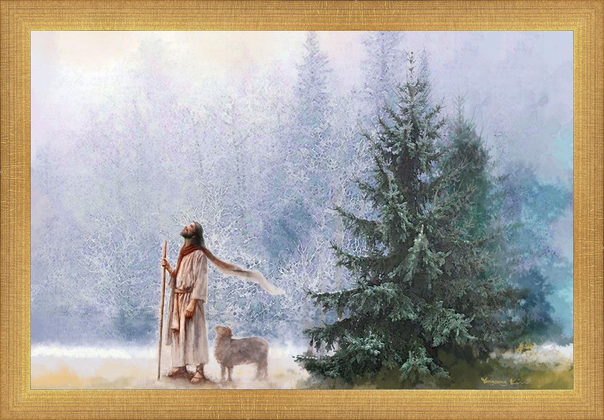 Heavenward by Yongsung Kim depicts Jesus, surrounded by trees, walking with a lamb and looking upward to the Heavens.