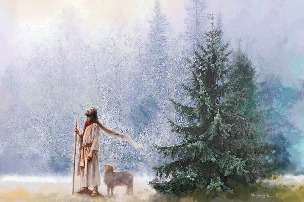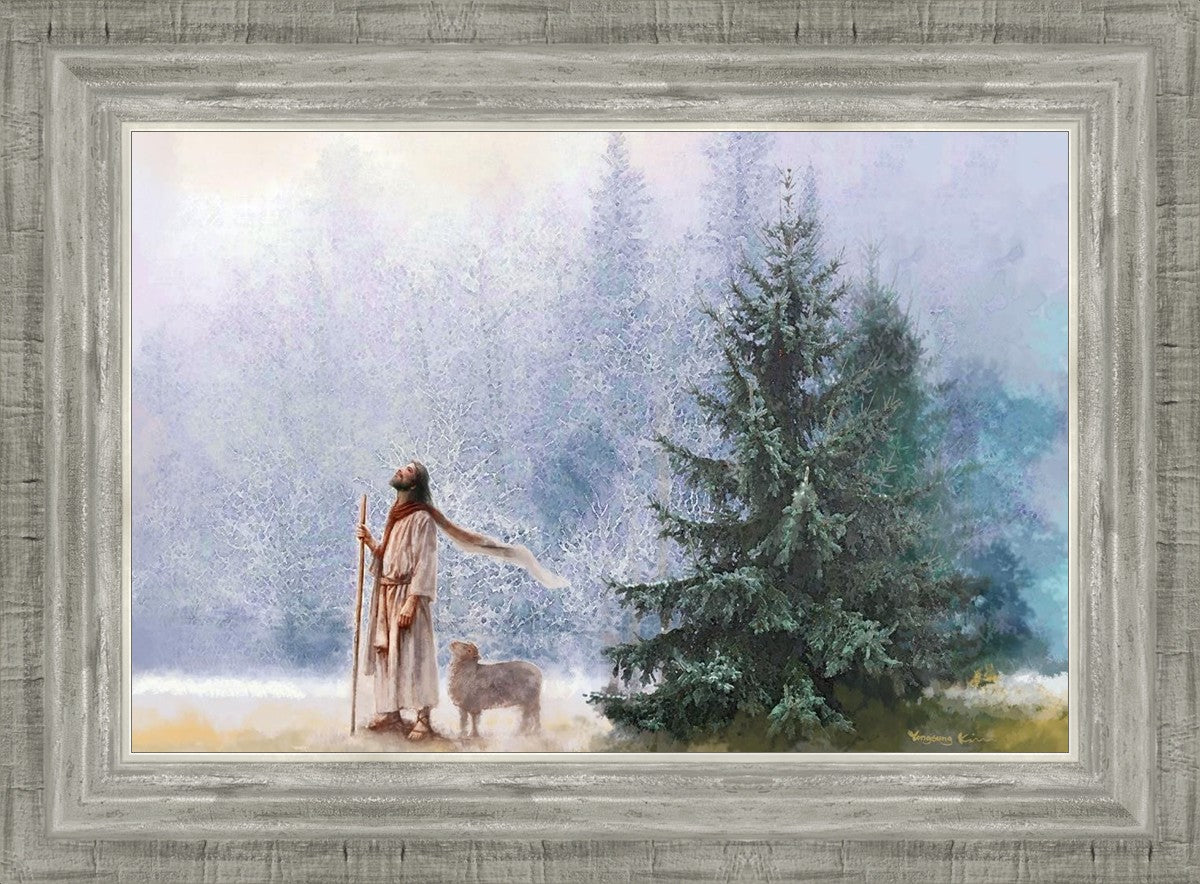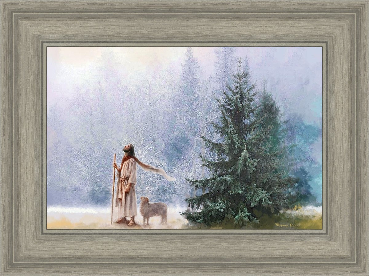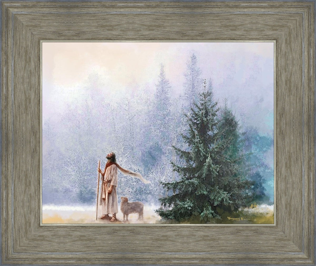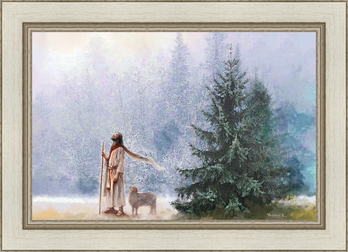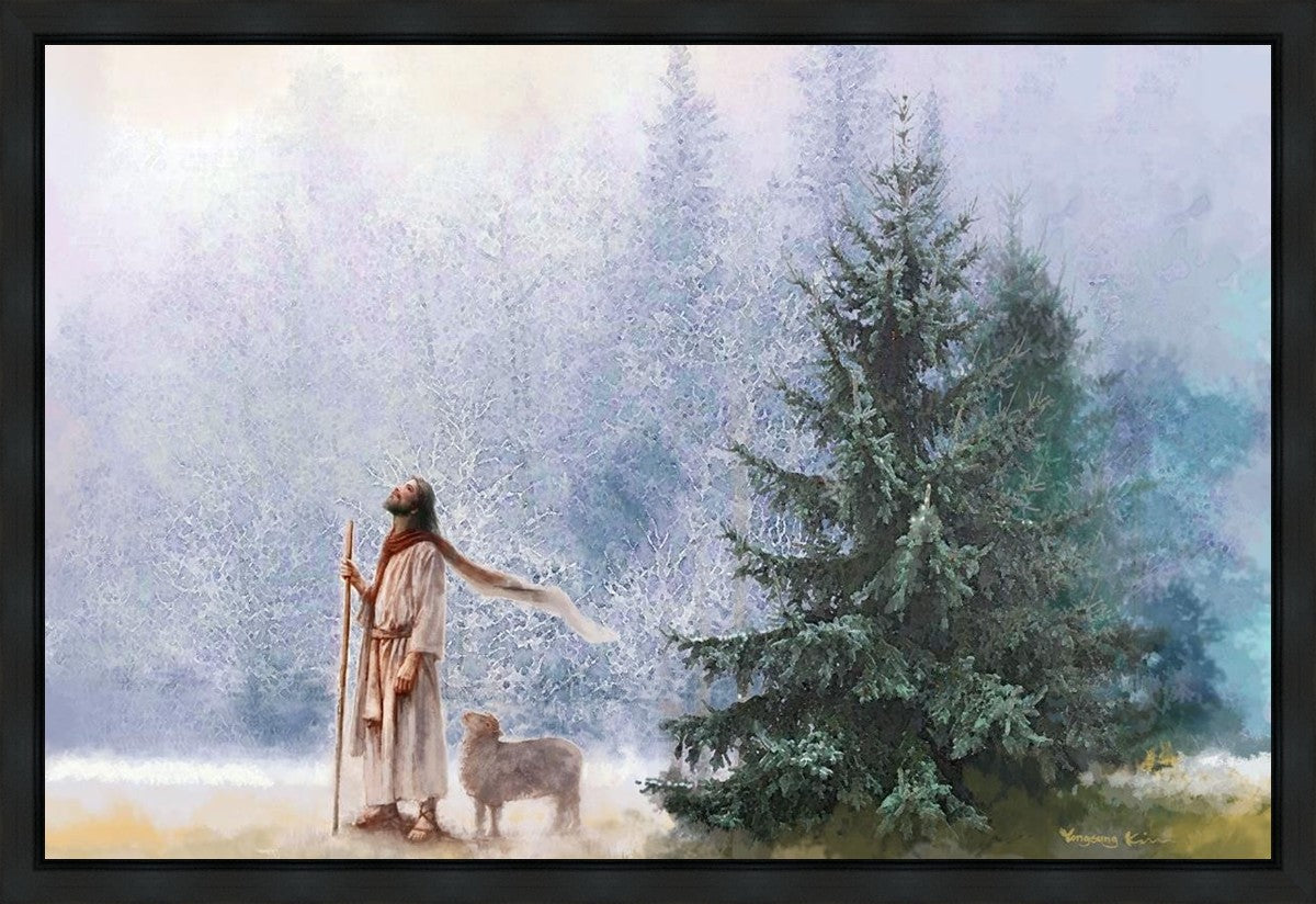 Heavenward by Yongsung Kim depicts Jesus, surrounded by trees, walking with a lamb and looking upward to the Heavens.