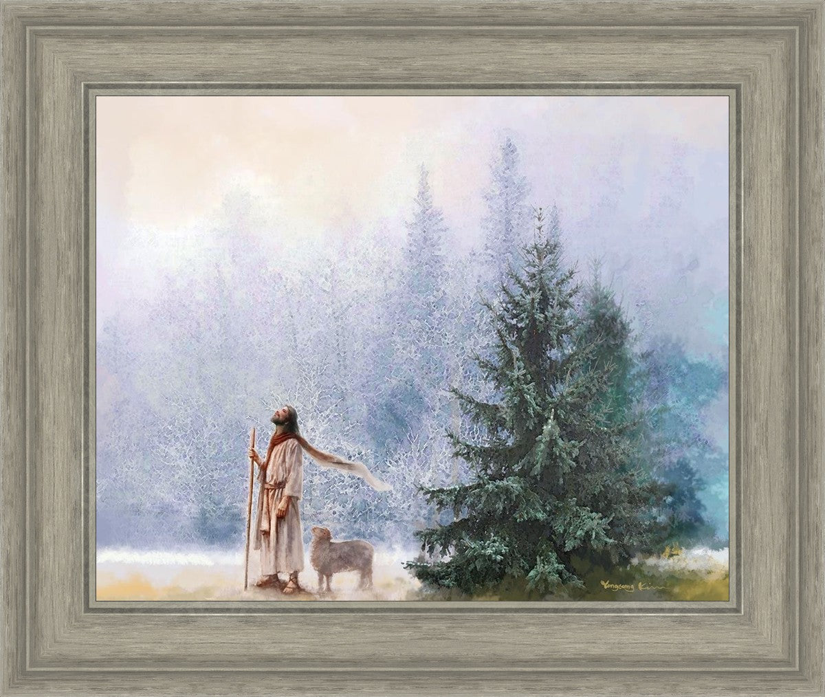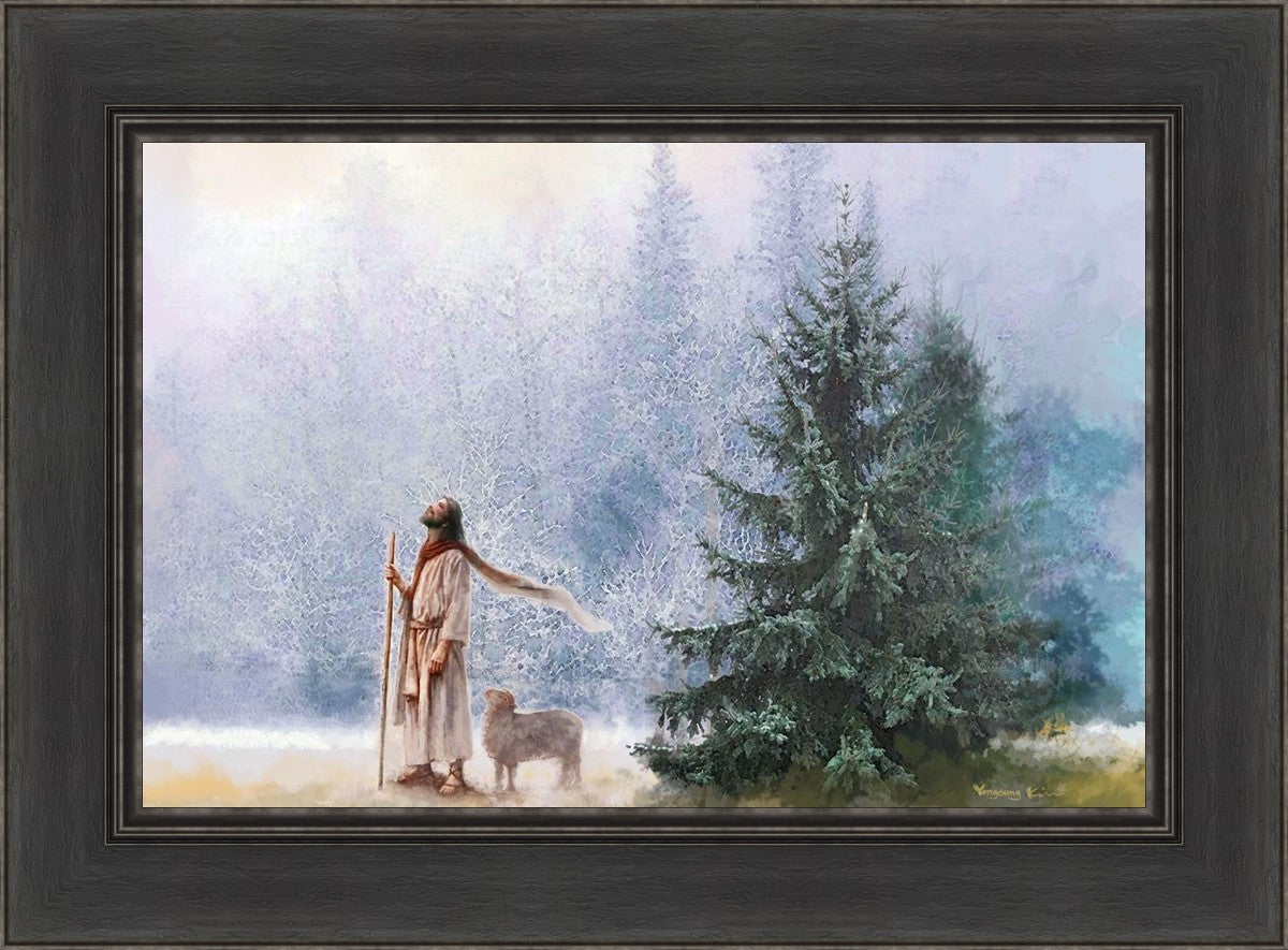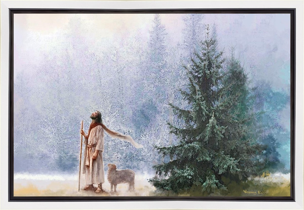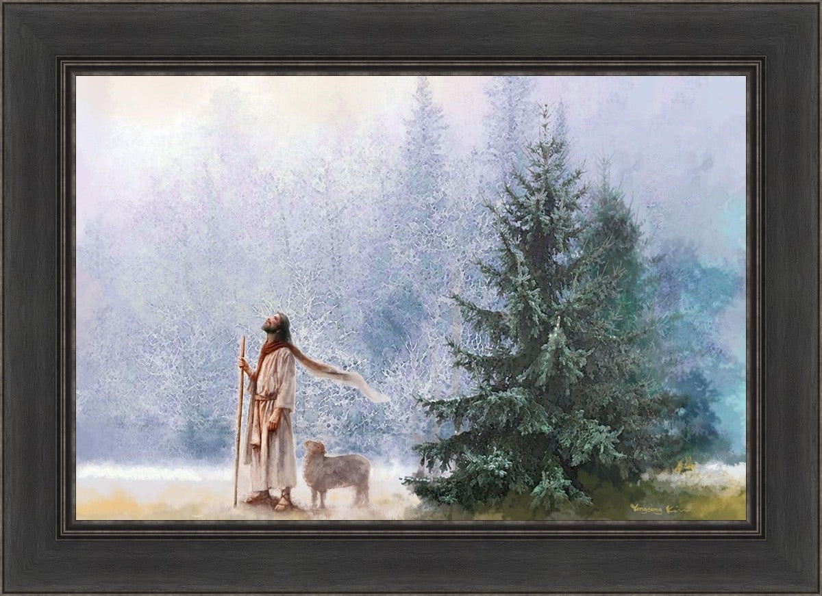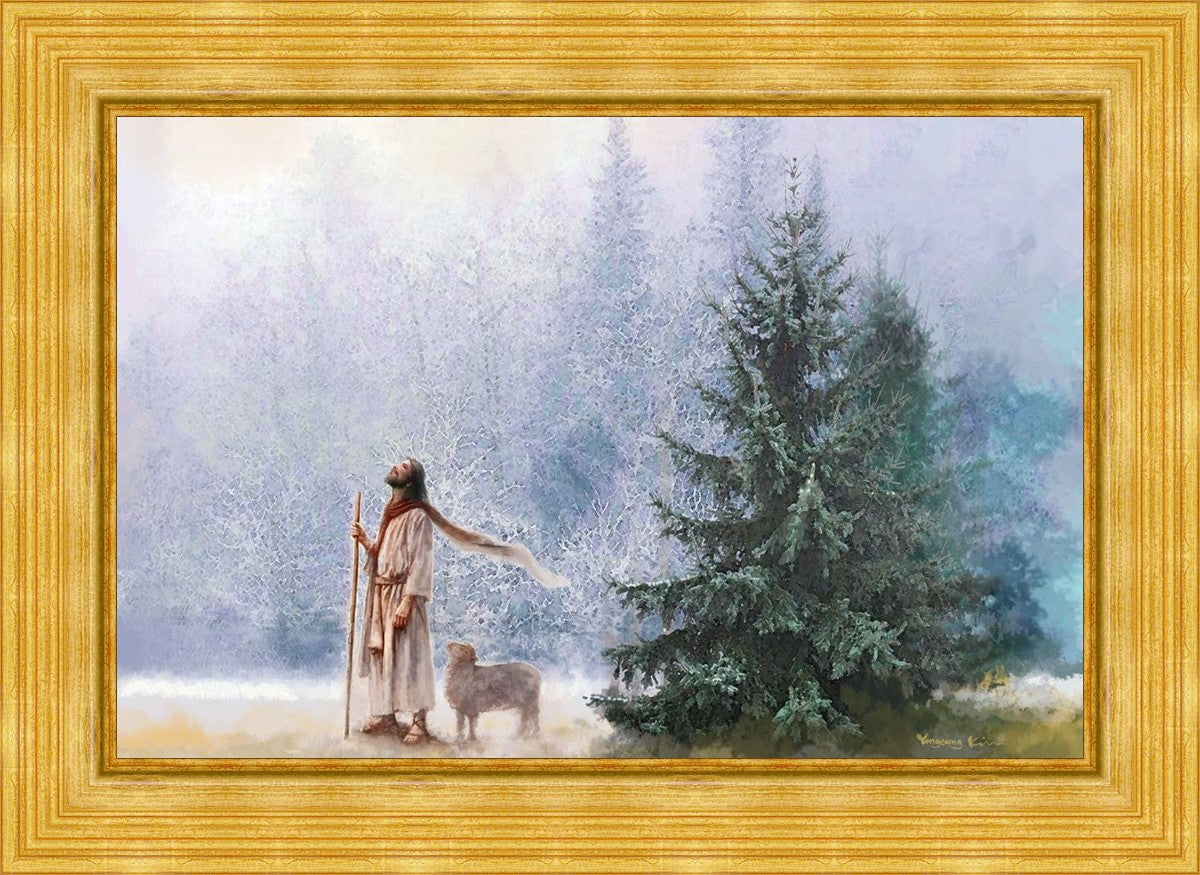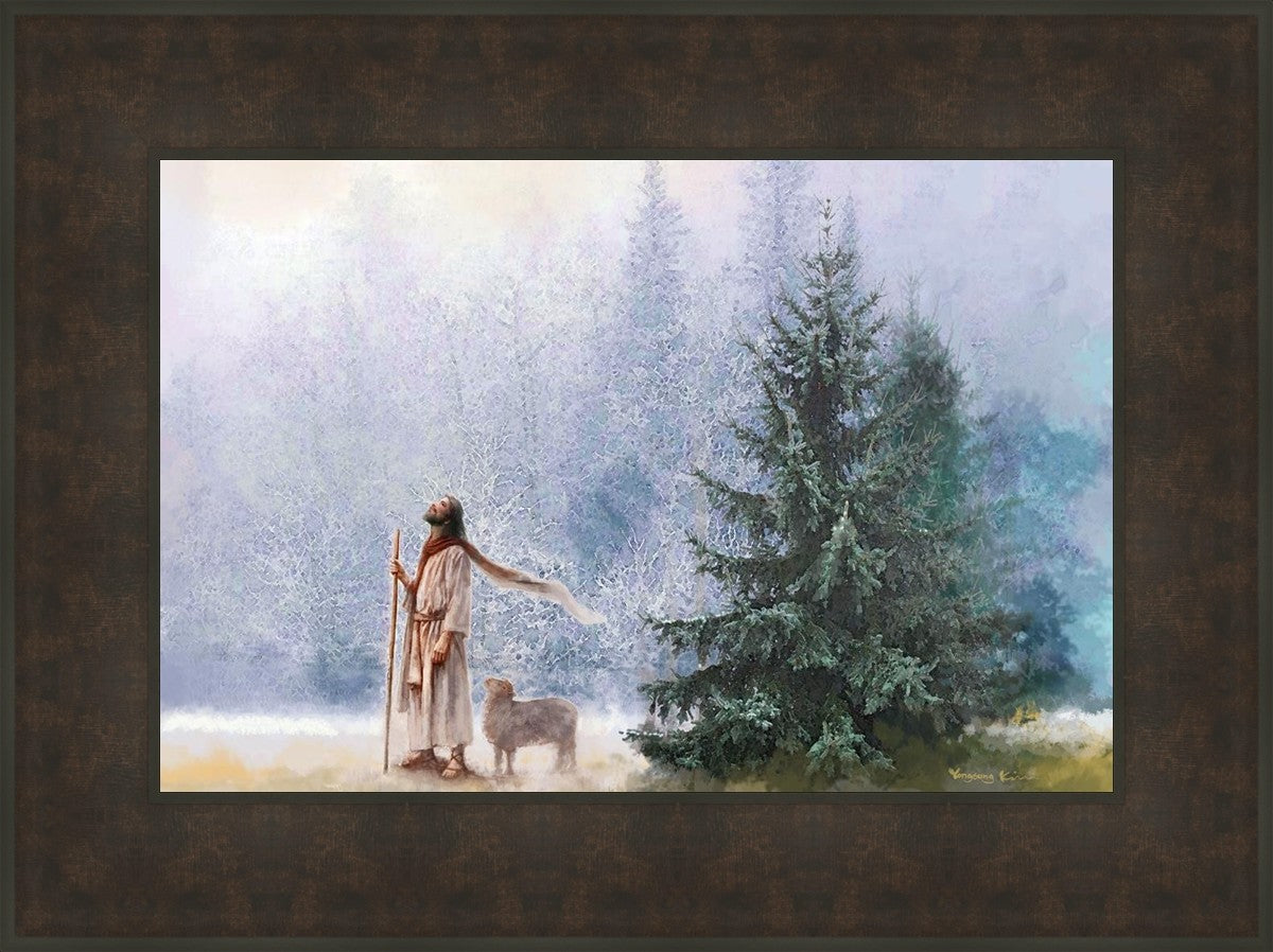 Heavenward by Yongsung Kim depicts Jesus, surrounded by trees, walking with a lamb and looking upward to the Heavens.