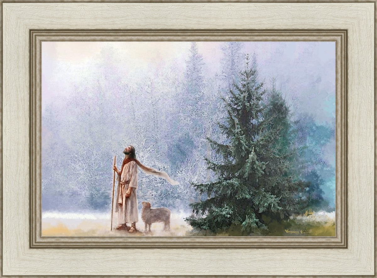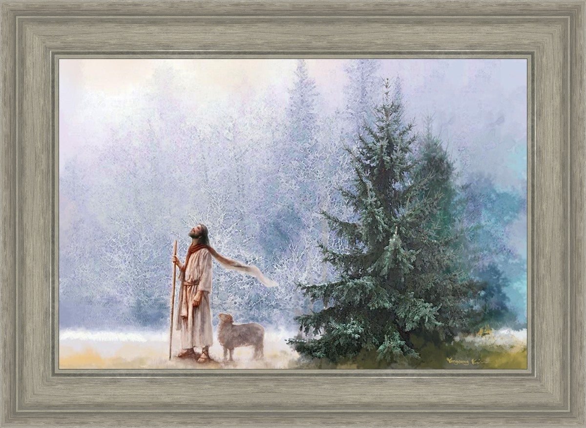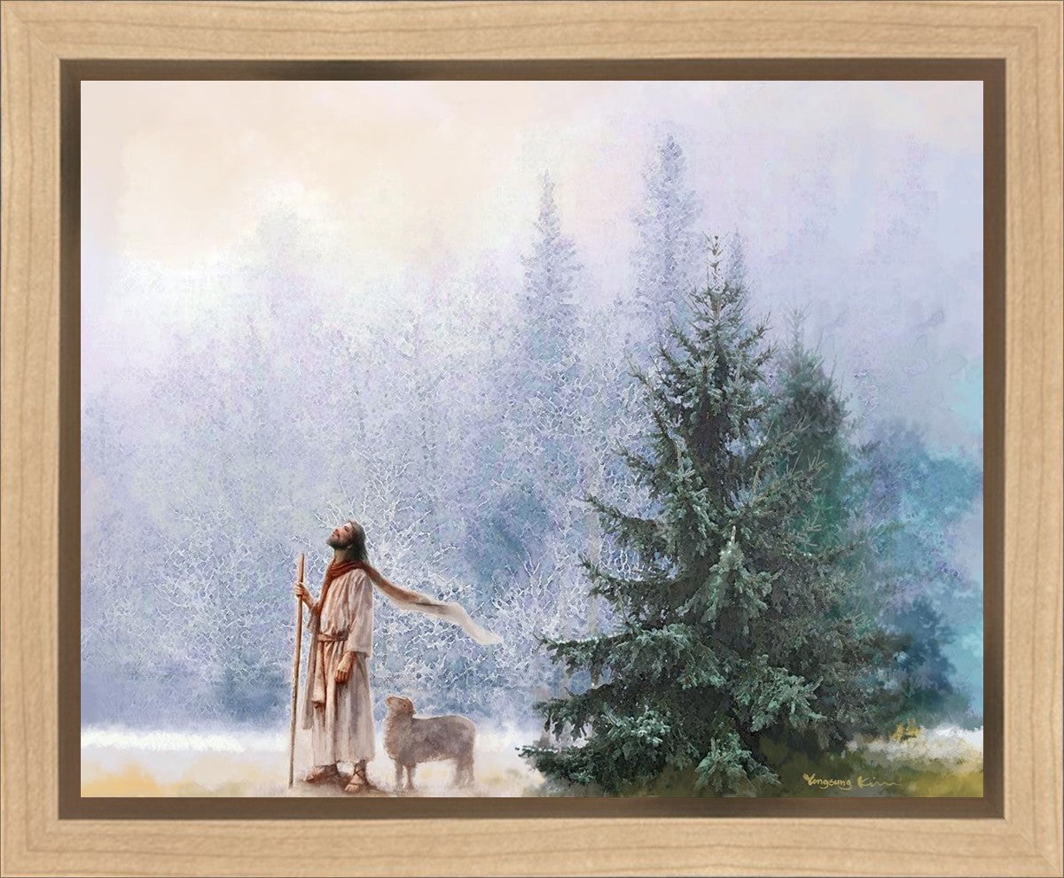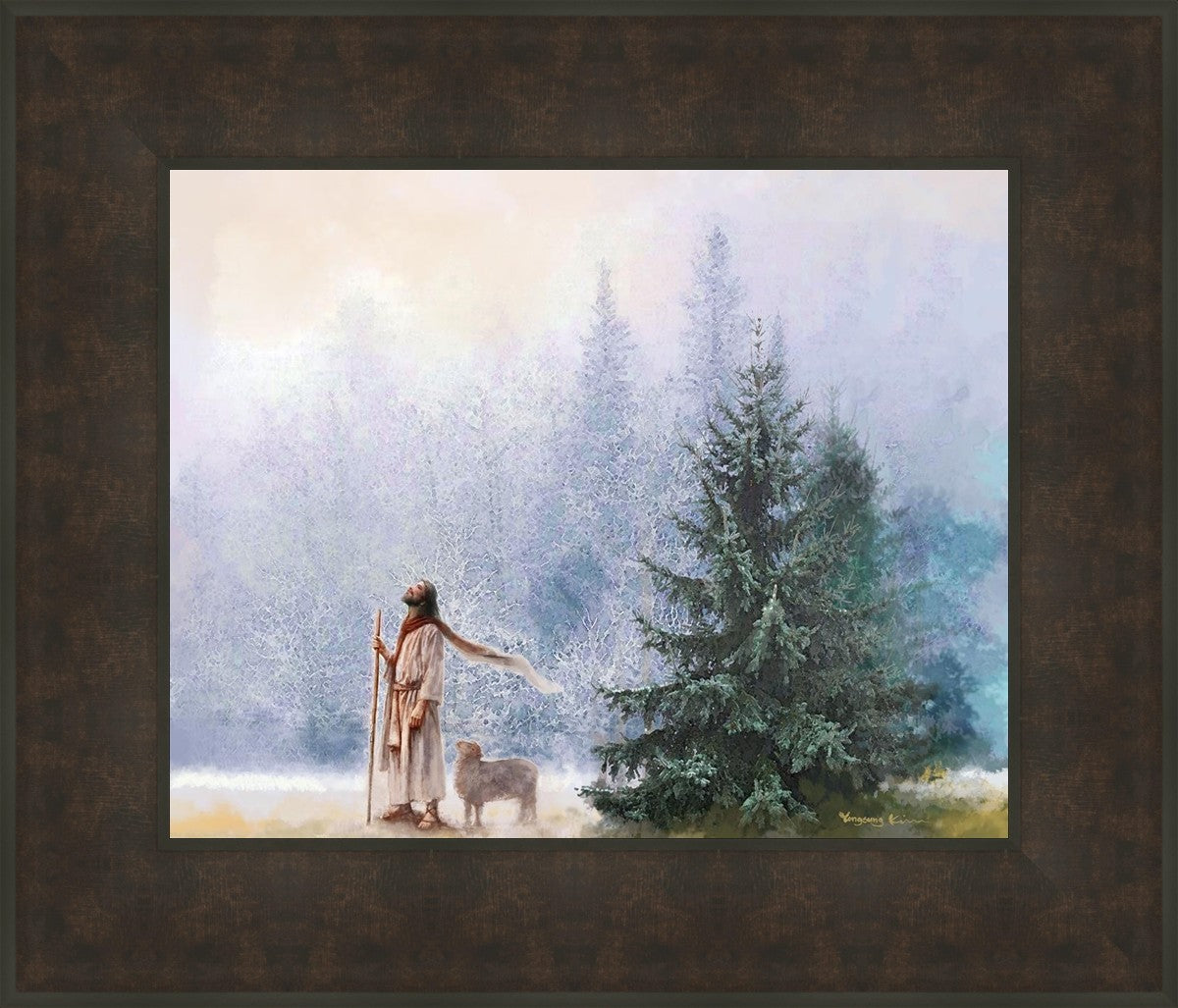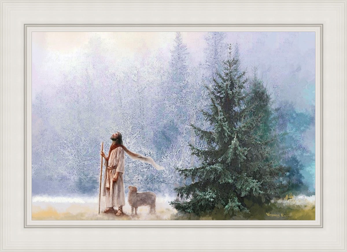 Heavenward by Yongsung Kim depicts Jesus, surrounded by trees, walking with a lamb and looking upward to the Heavens.