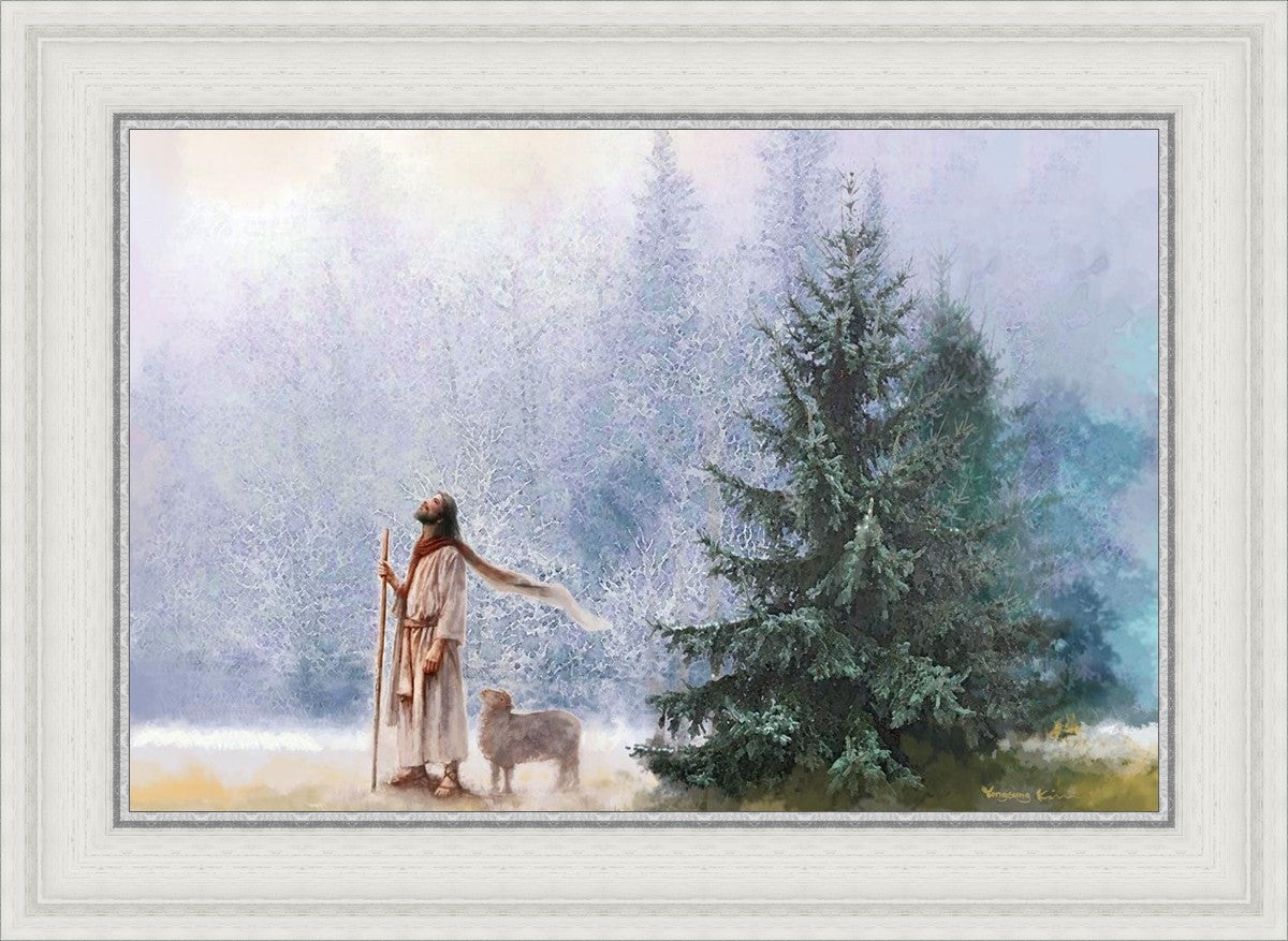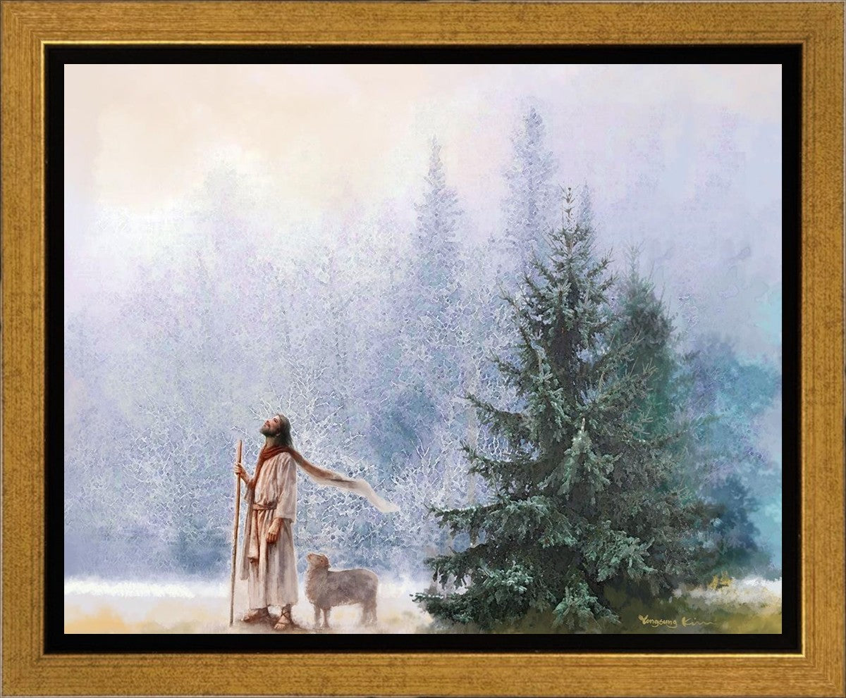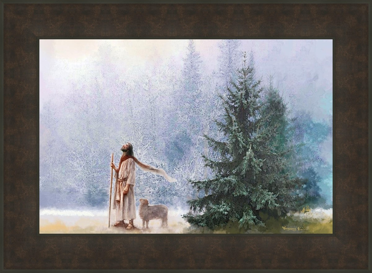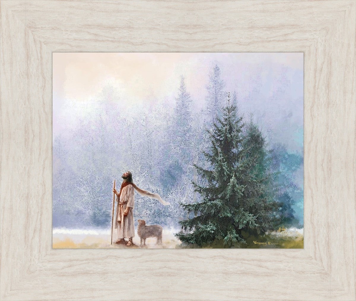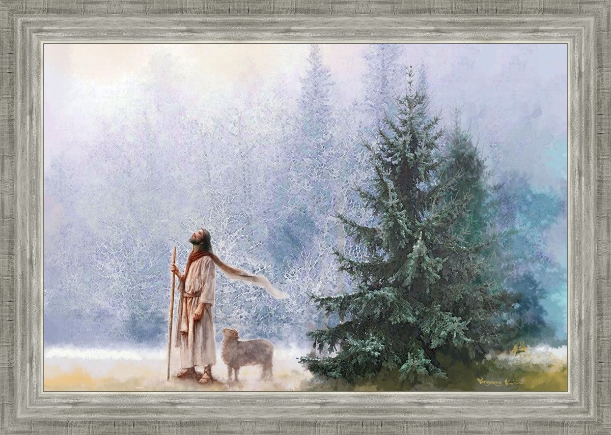 Heavenward by Yongsung Kim depicts Jesus, surrounded by trees, walking with a lamb and looking upward to the Heavens.