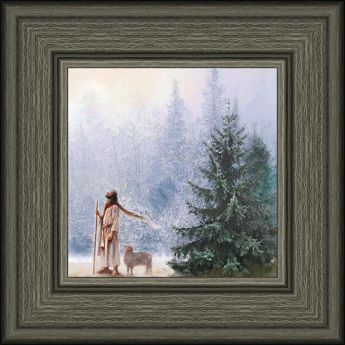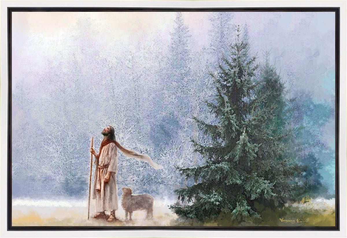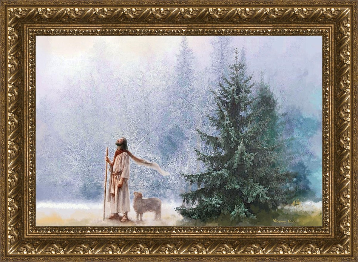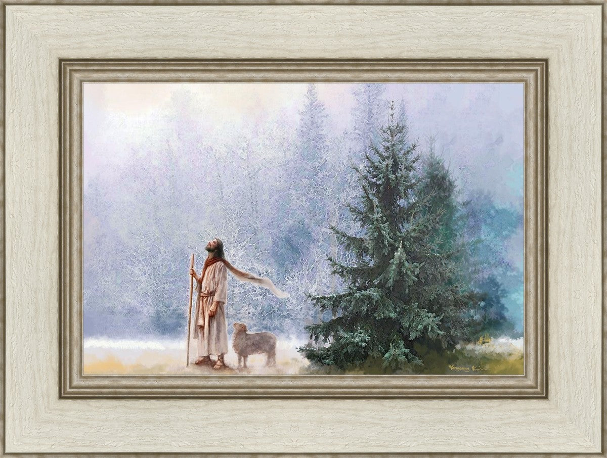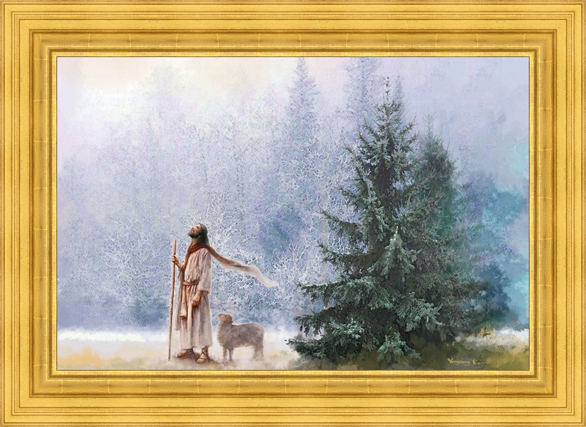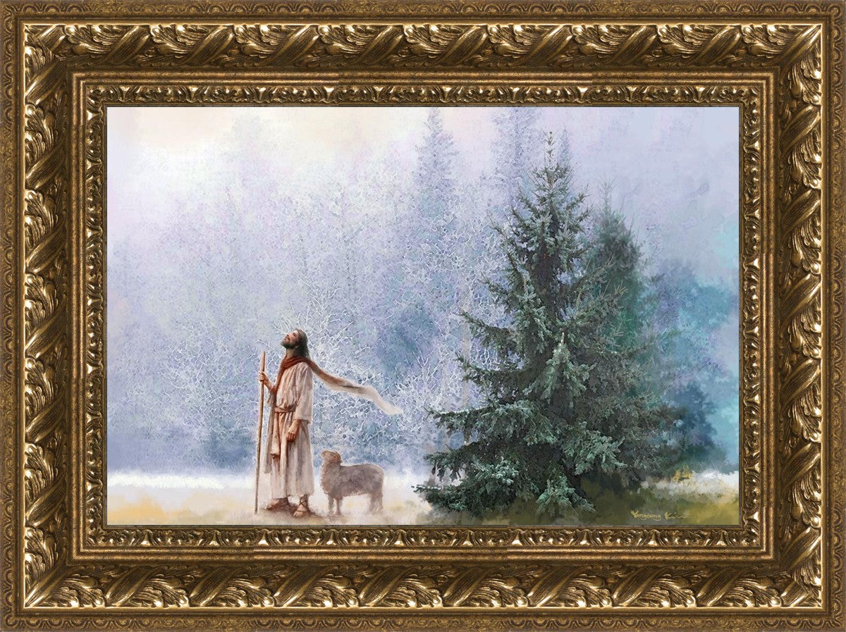 Heavenward by Yongsung Kim depicts Jesus, surrounded by trees, walking with a lamb and looking upward to the Heavens.