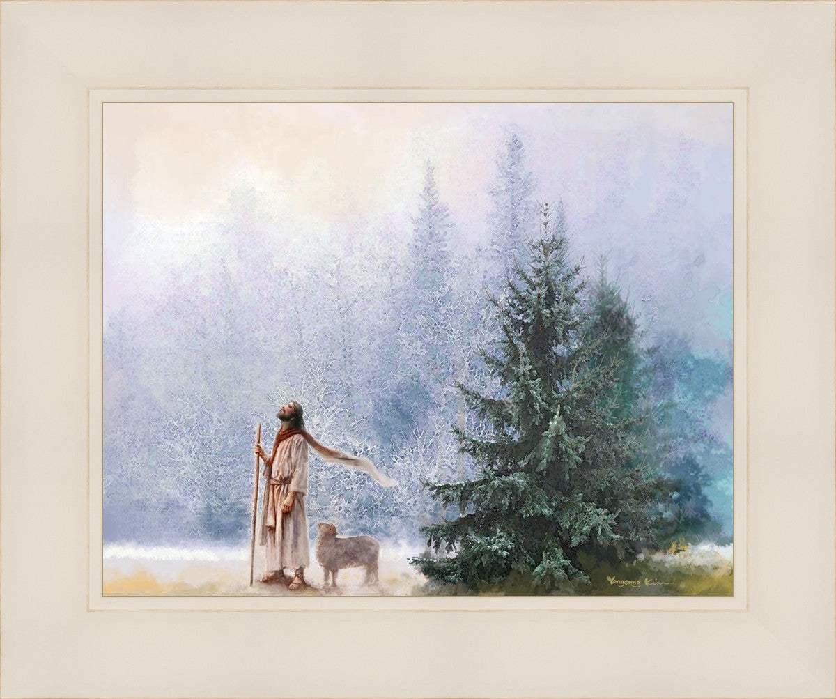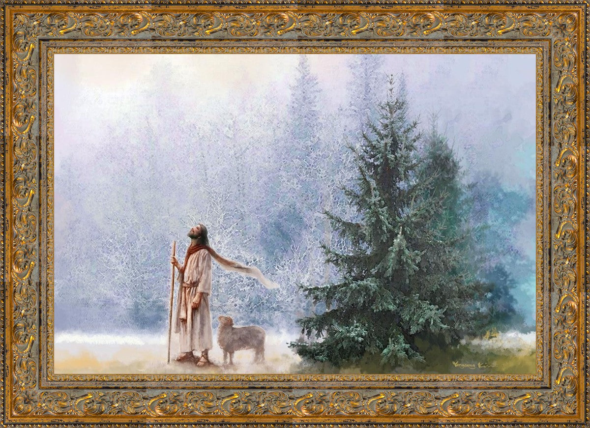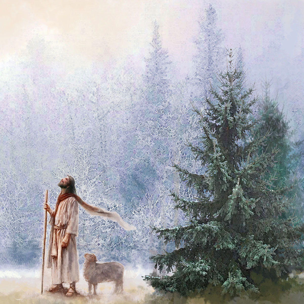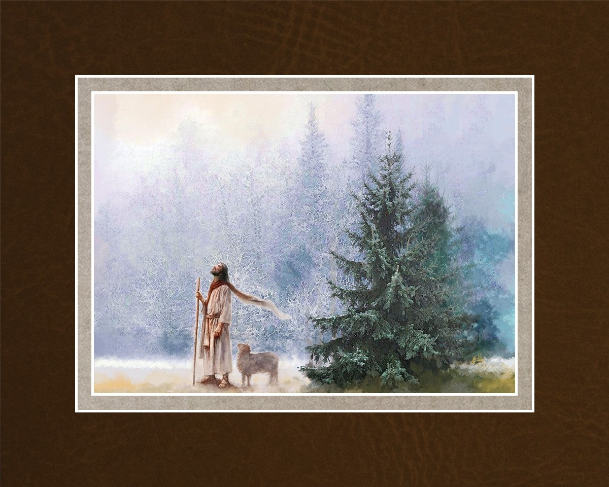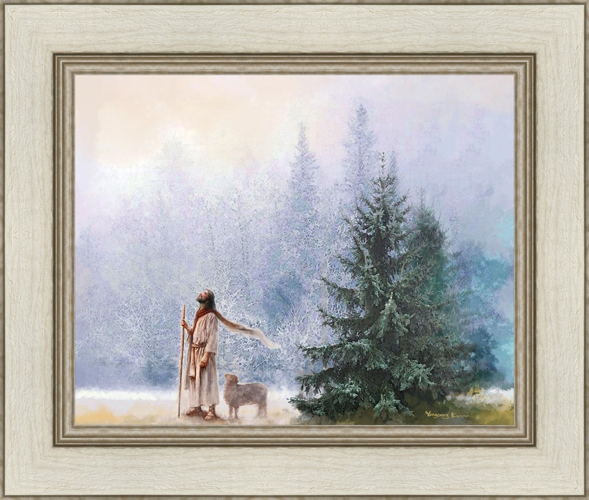 Heavenward by Yongsung Kim depicts Jesus, surrounded by trees, walking with a lamb and looking upward to the Heavens.