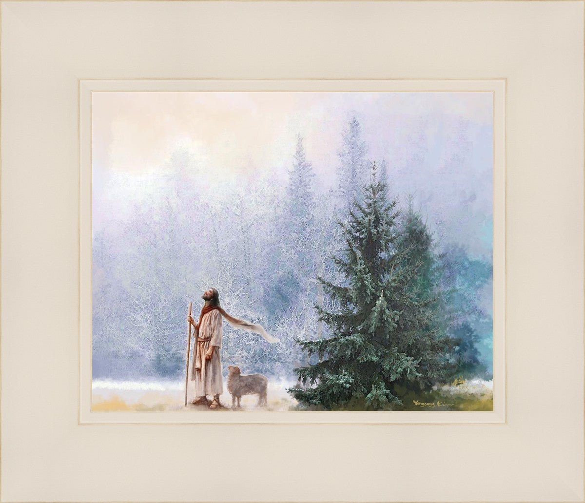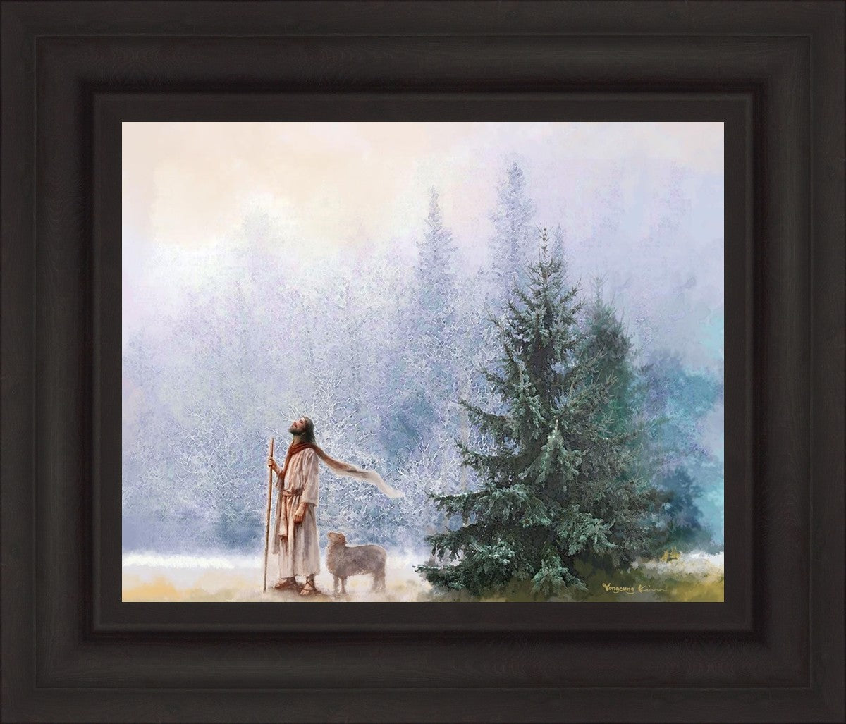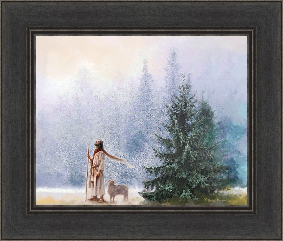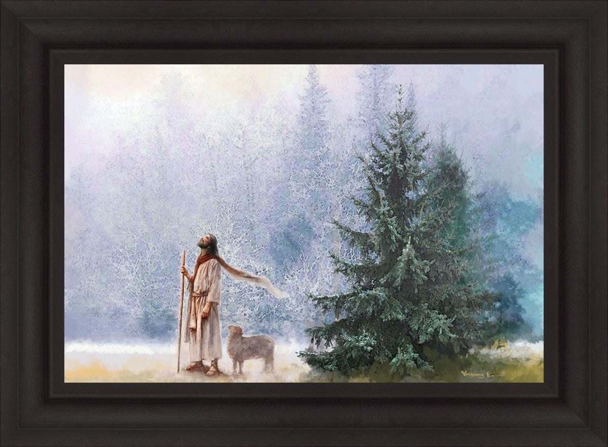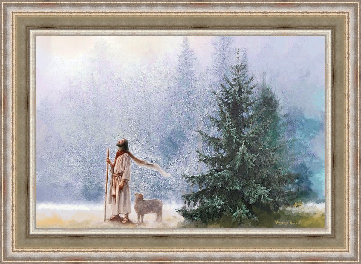 Heavenward by Yongsung Kim depicts Jesus, surrounded by trees, walking with a lamb and looking upward to the Heavens.