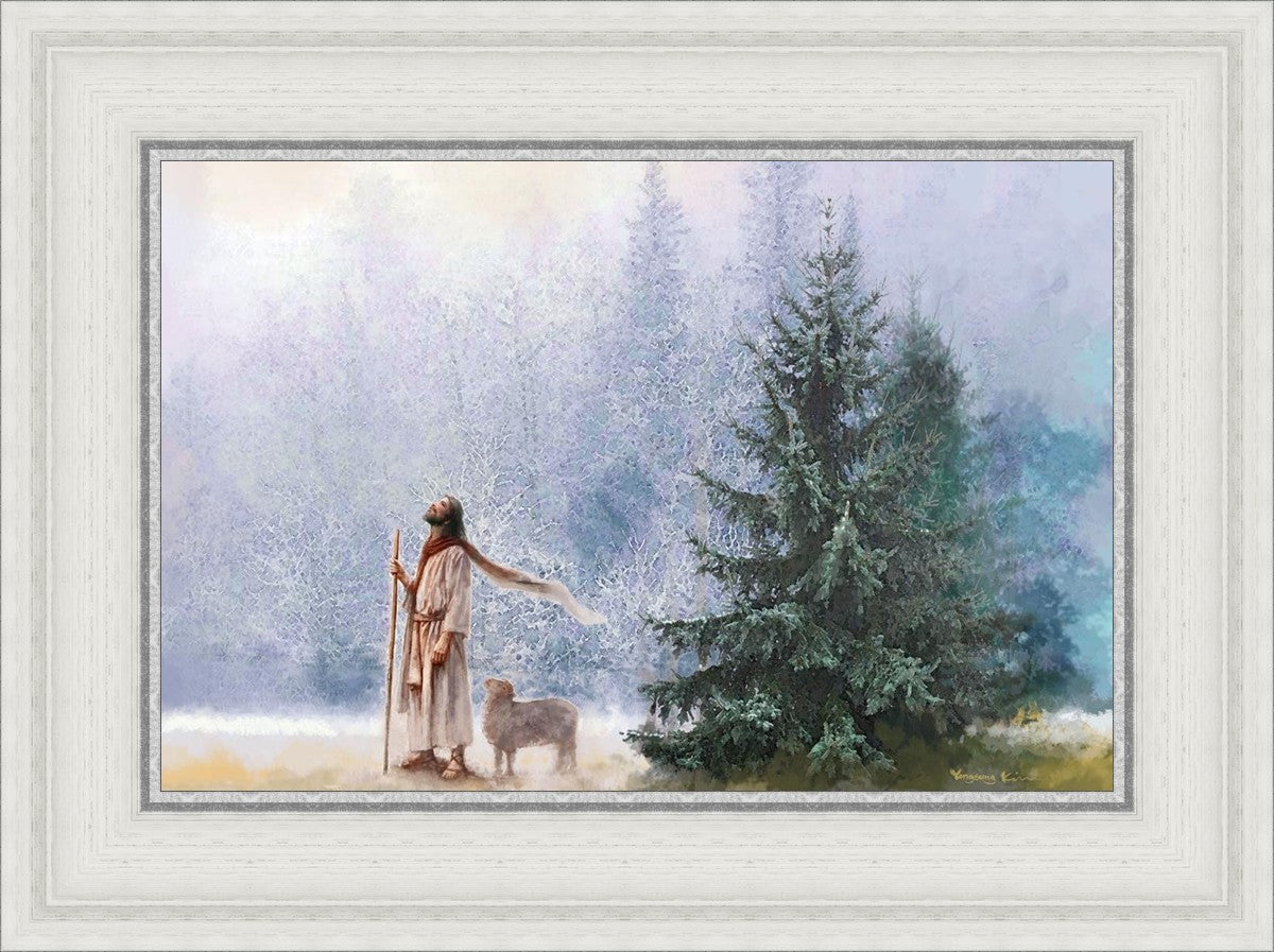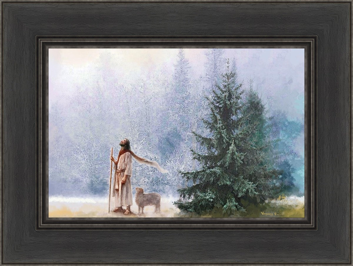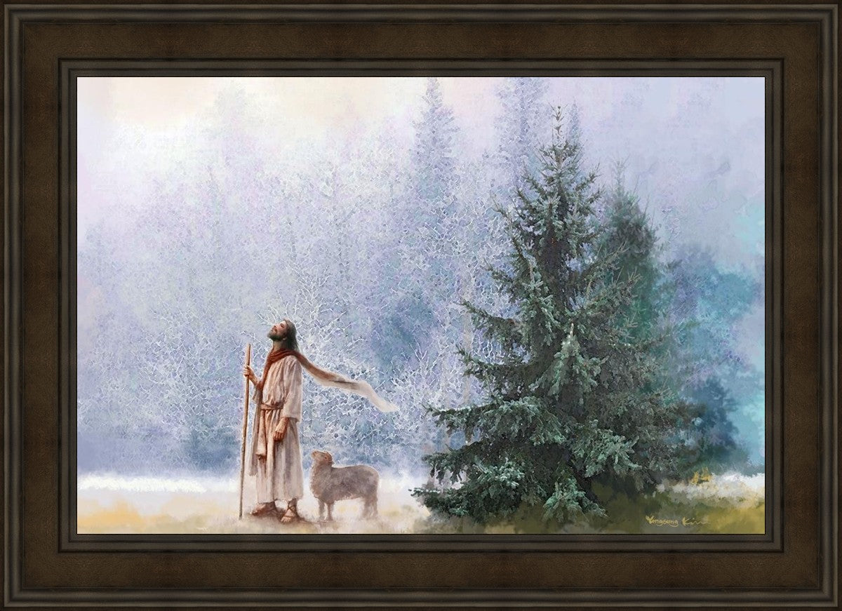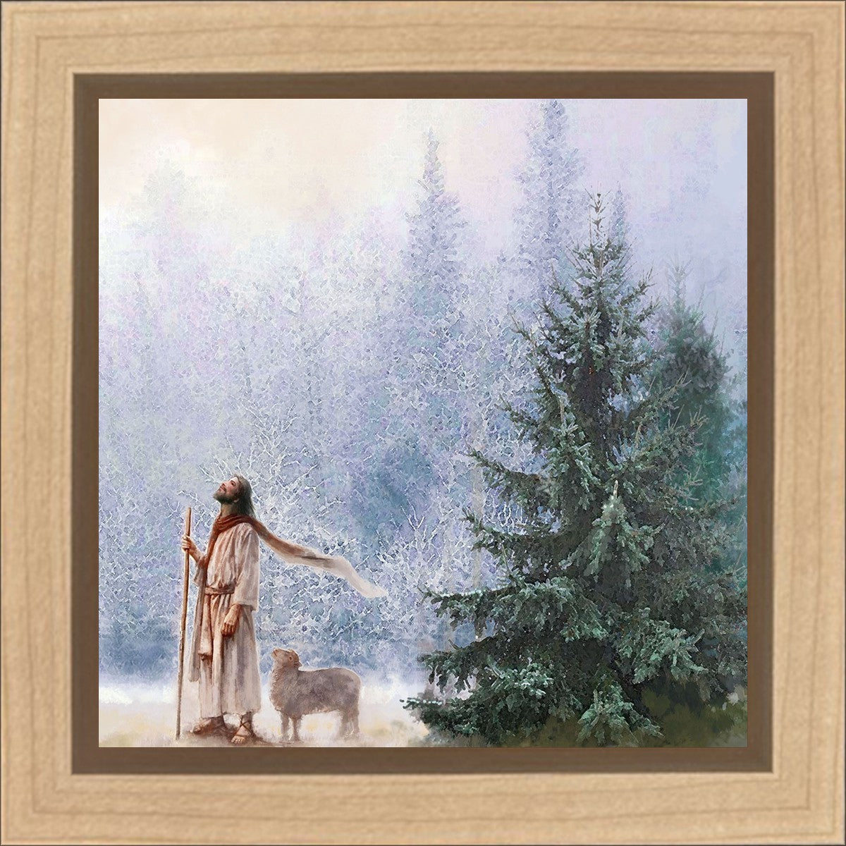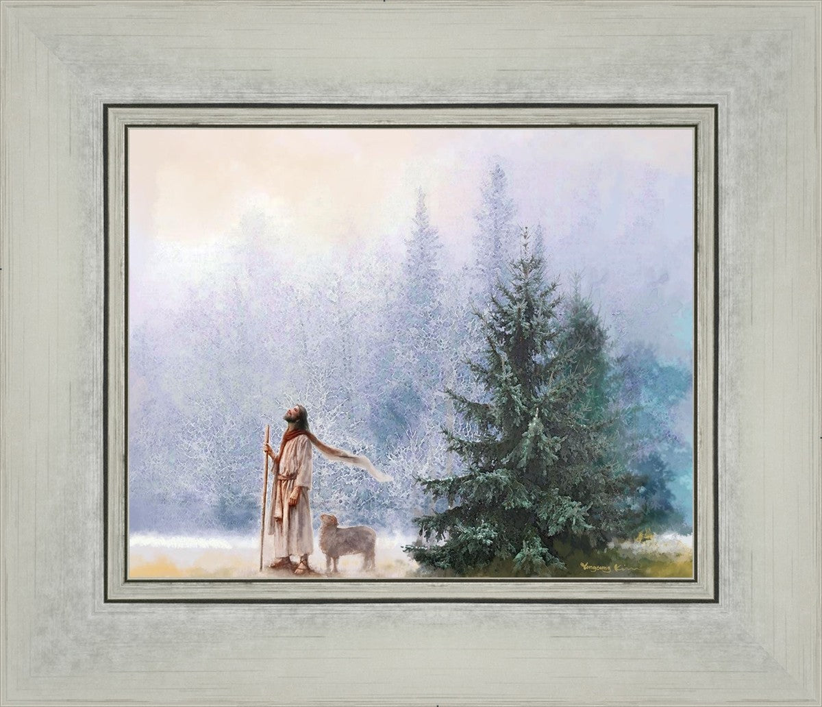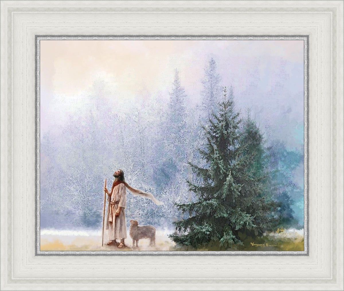 Heavenward by Yongsung Kim depicts Jesus, surrounded by trees, walking with a lamb and looking upward to the Heavens.