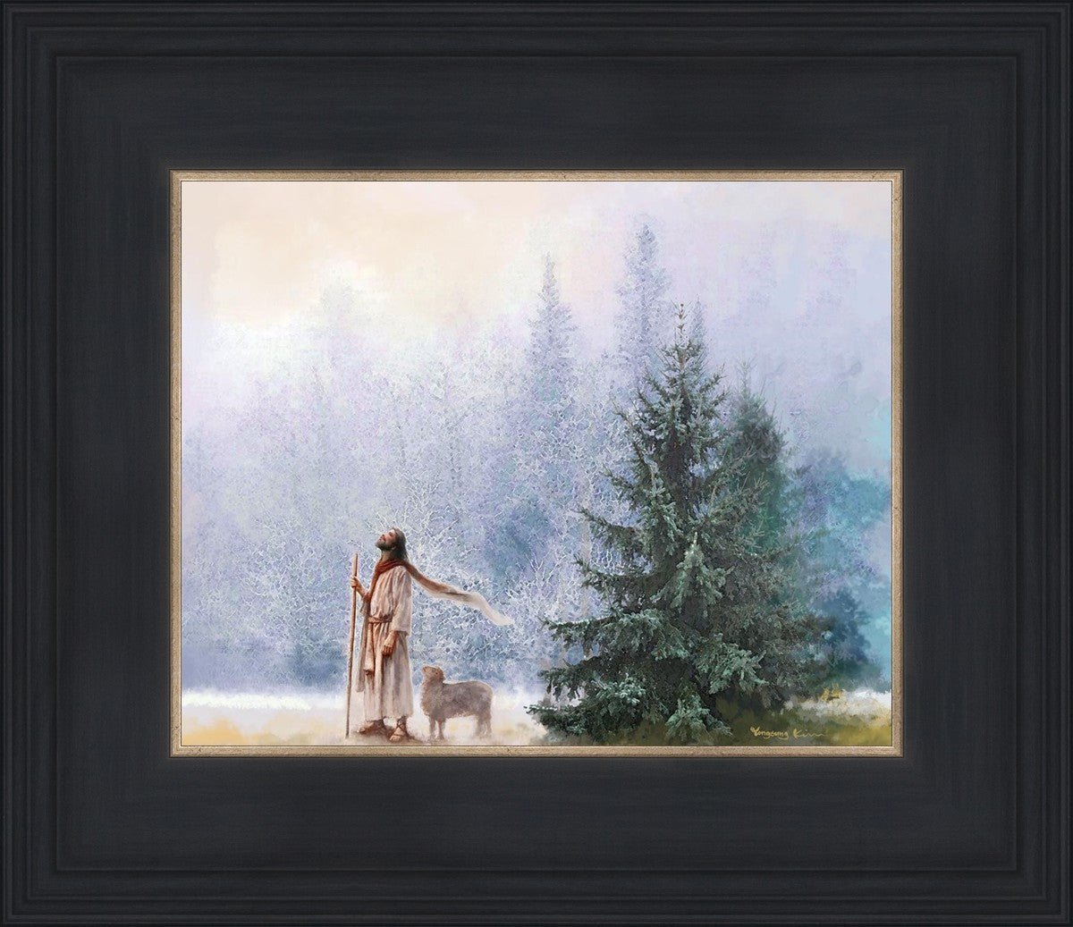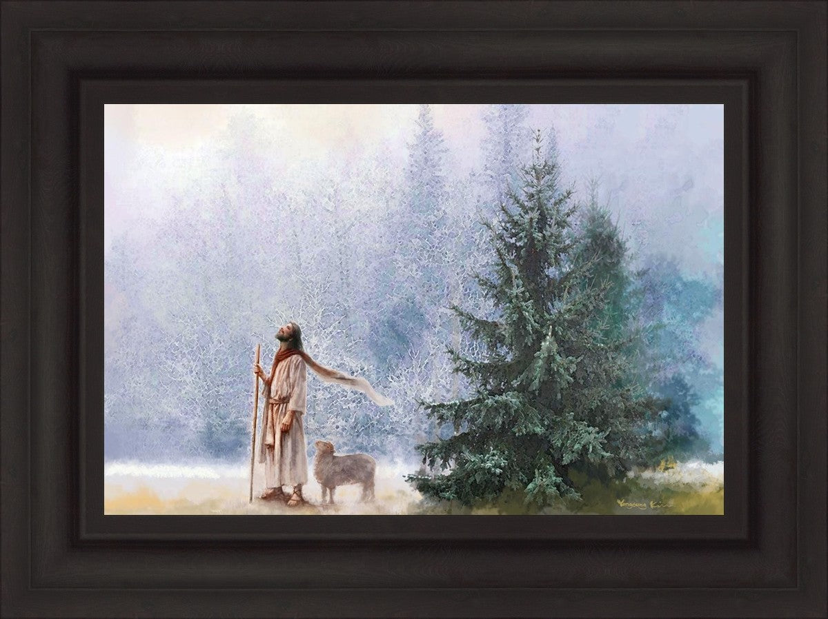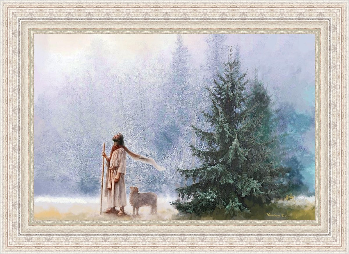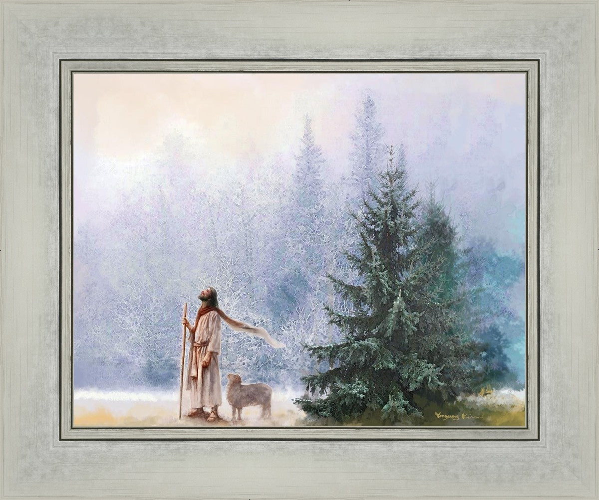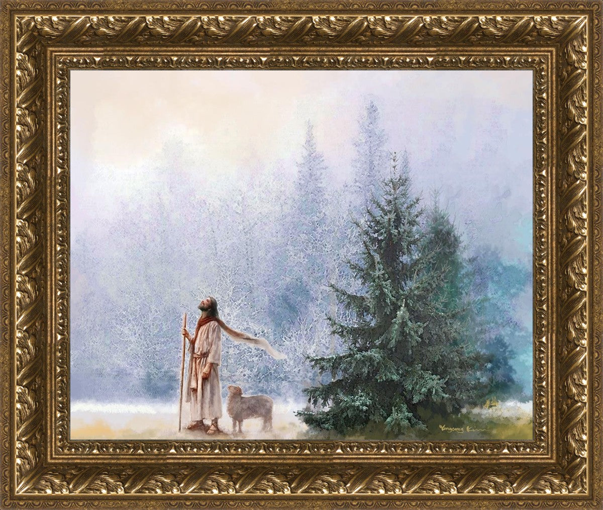 Heavenward by Yongsung Kim depicts Jesus, surrounded by trees, walking with a lamb and looking upward to the Heavens.