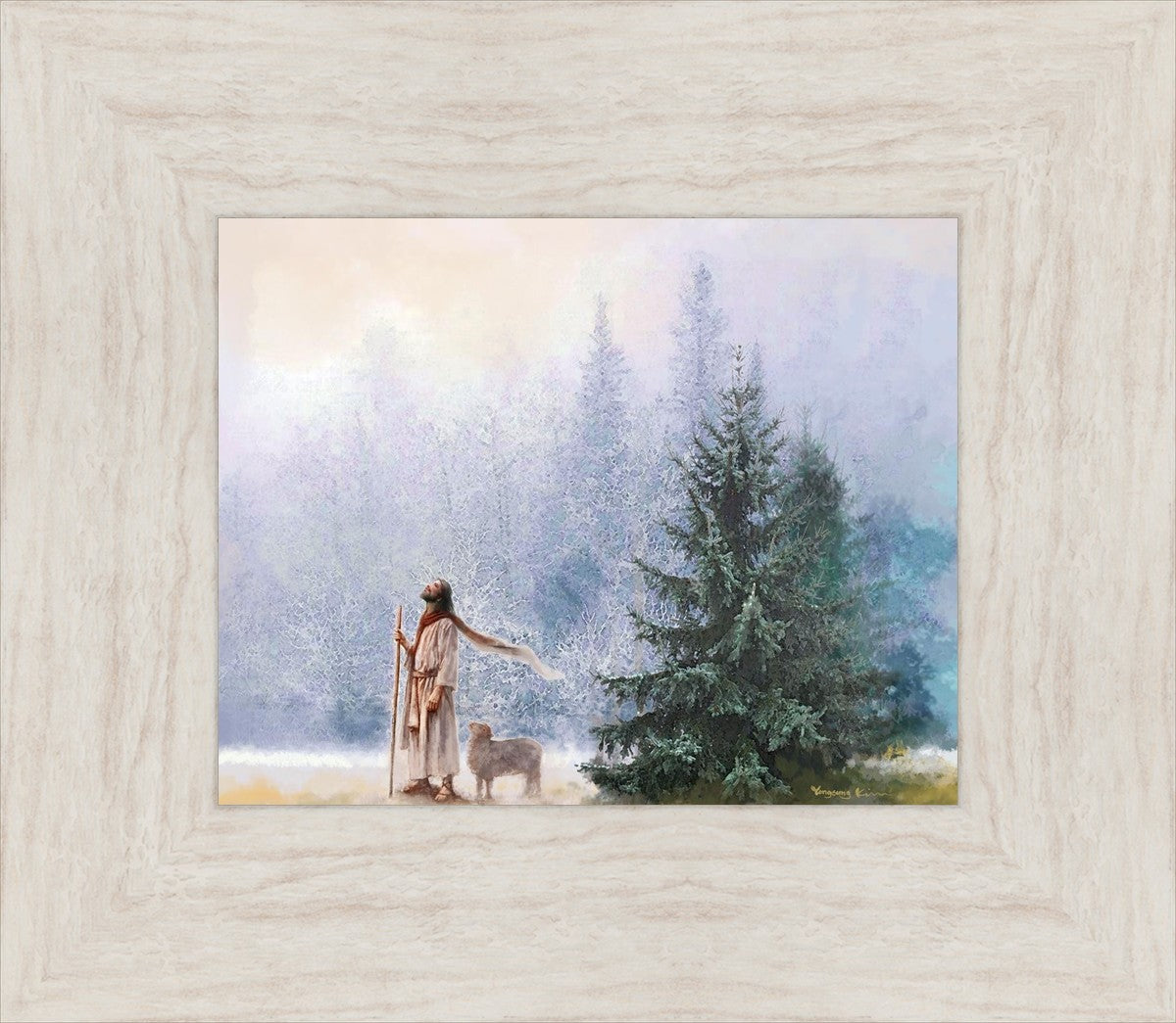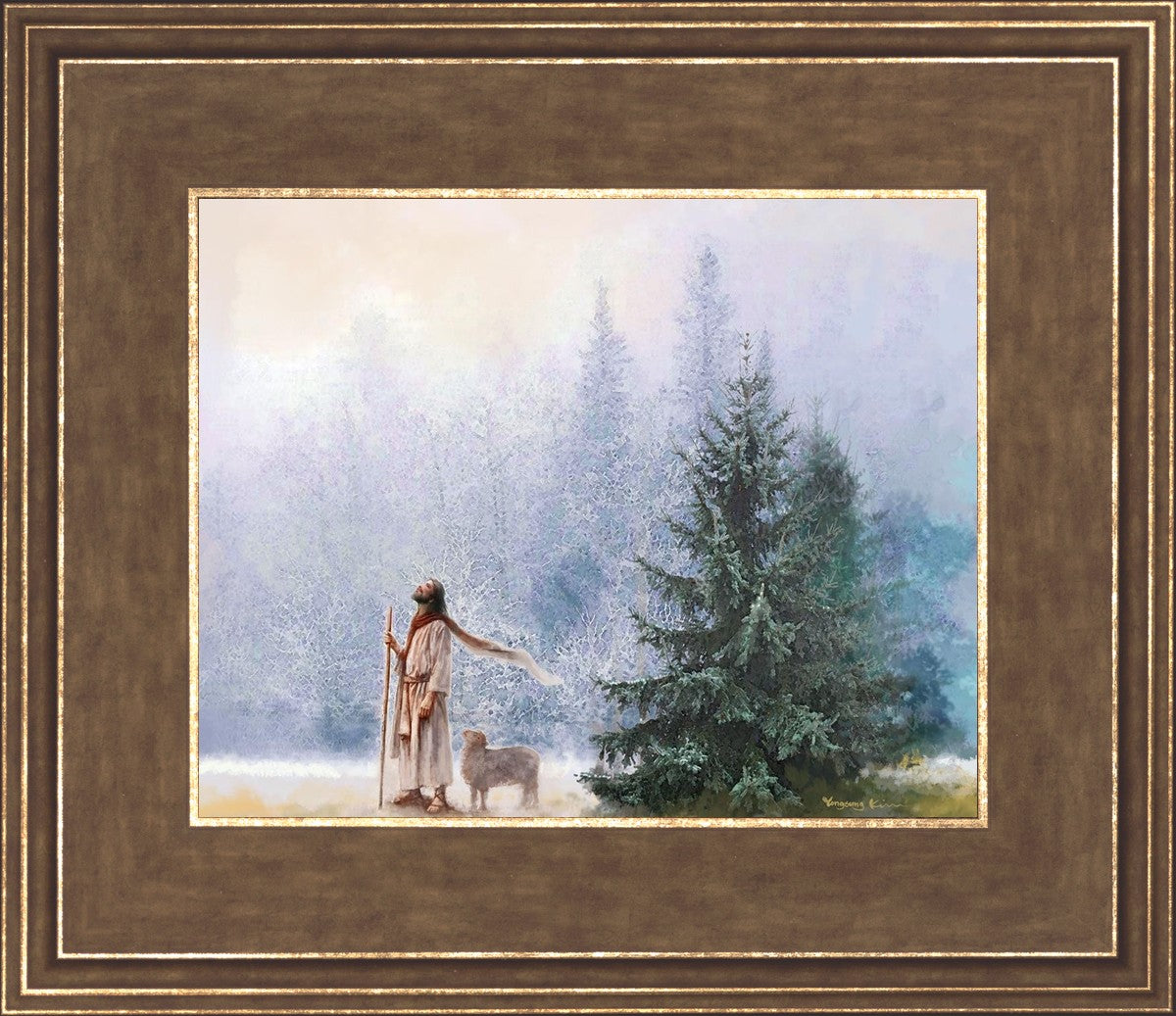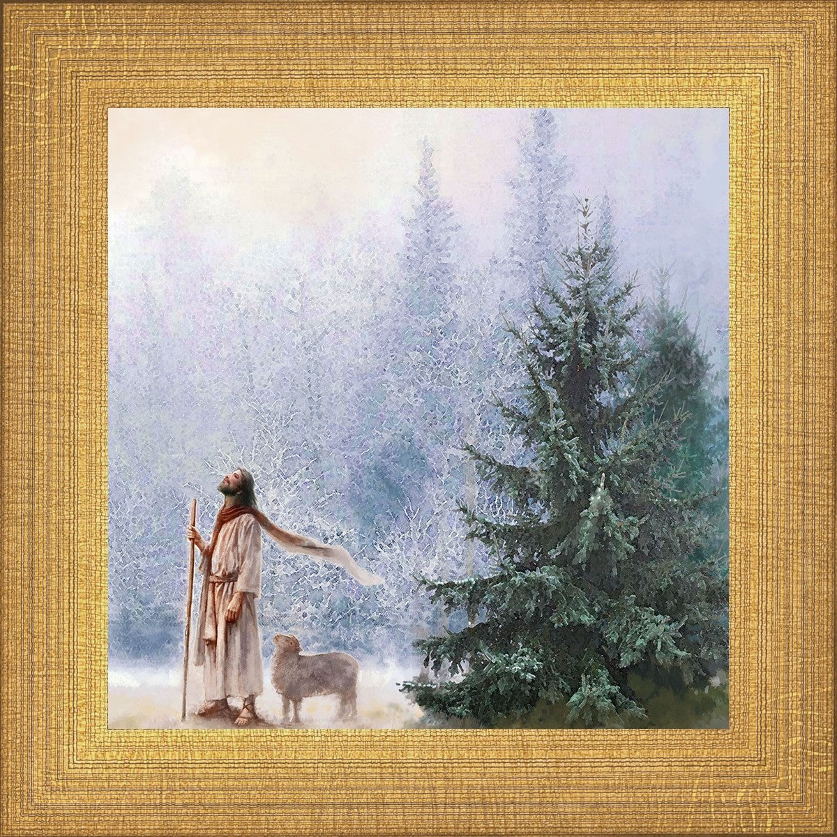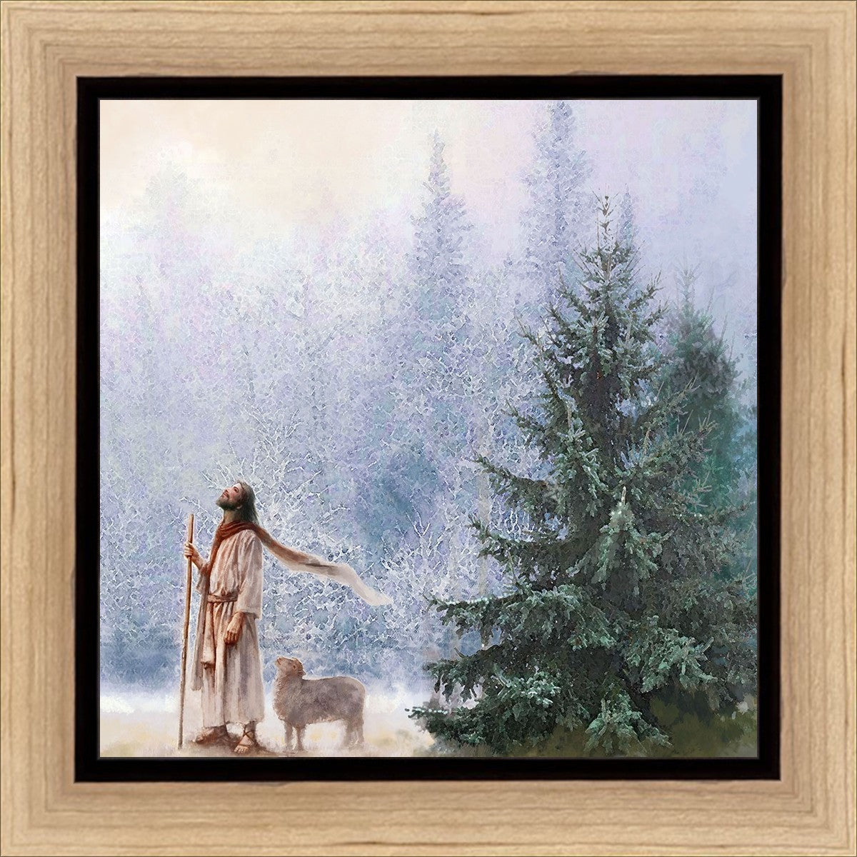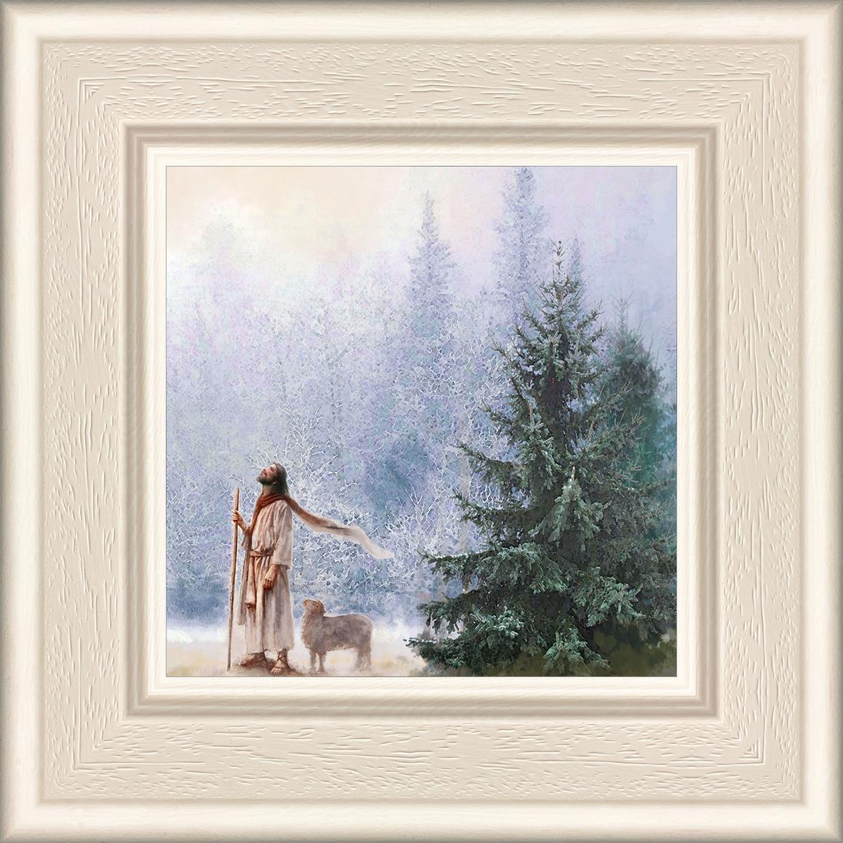 Heavenward by Yongsung Kim depicts Jesus, surrounded by trees, walking with a lamb and looking upward to the Heavens.