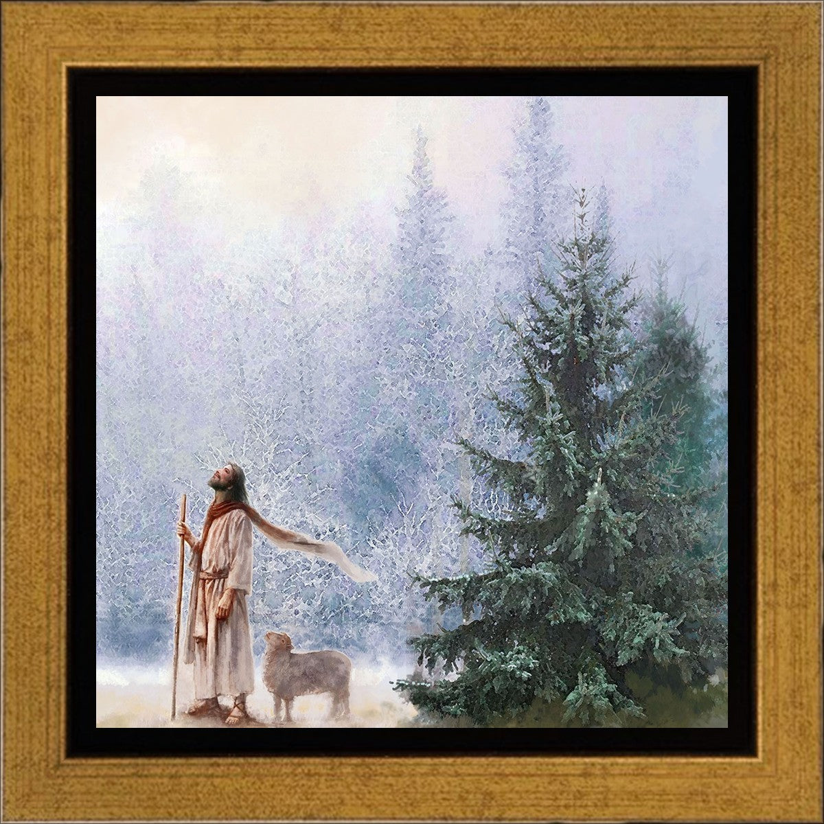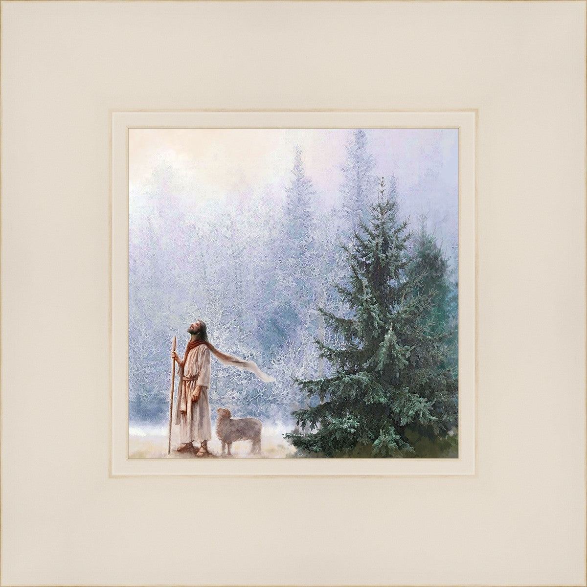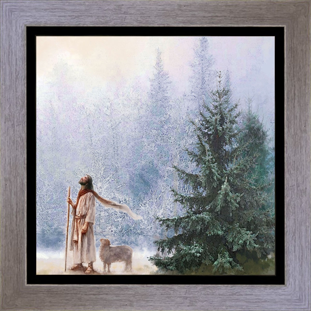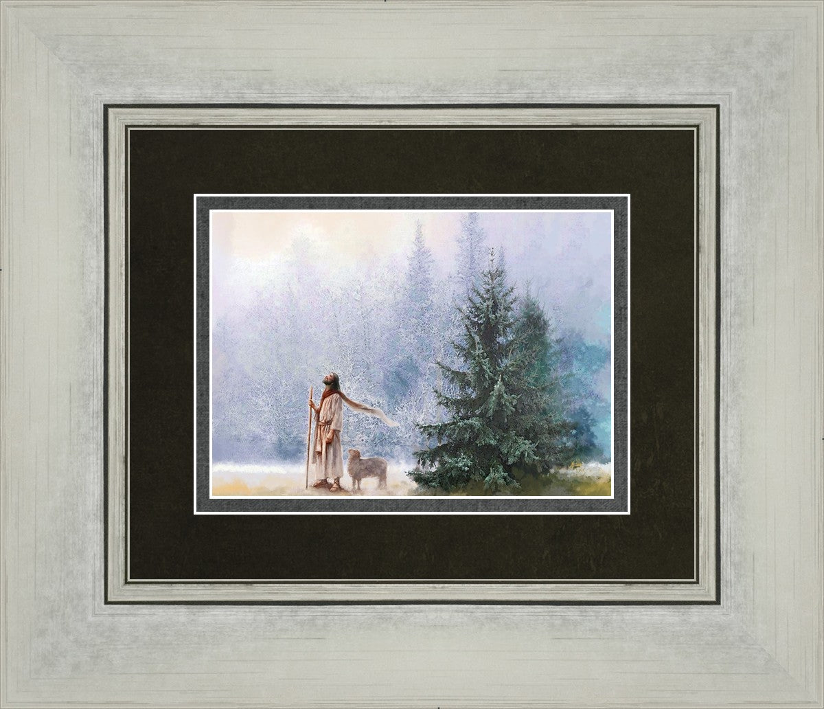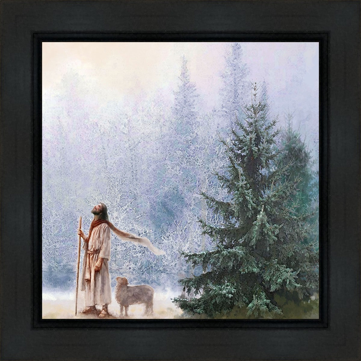 Heavenward by Yongsung Kim depicts Jesus, surrounded by trees, walking with a lamb and looking upward to the Heavens.