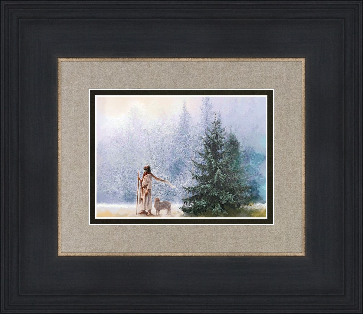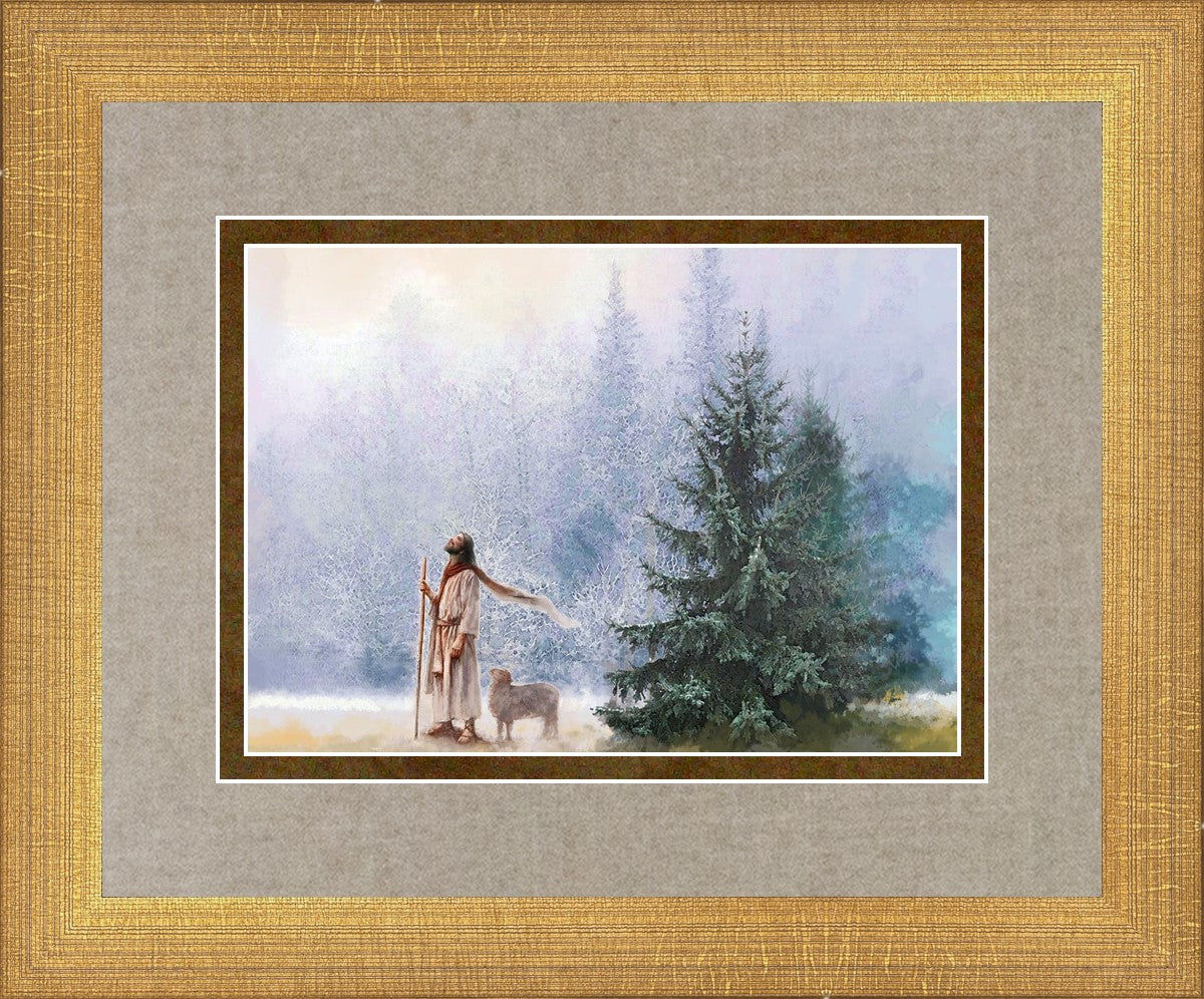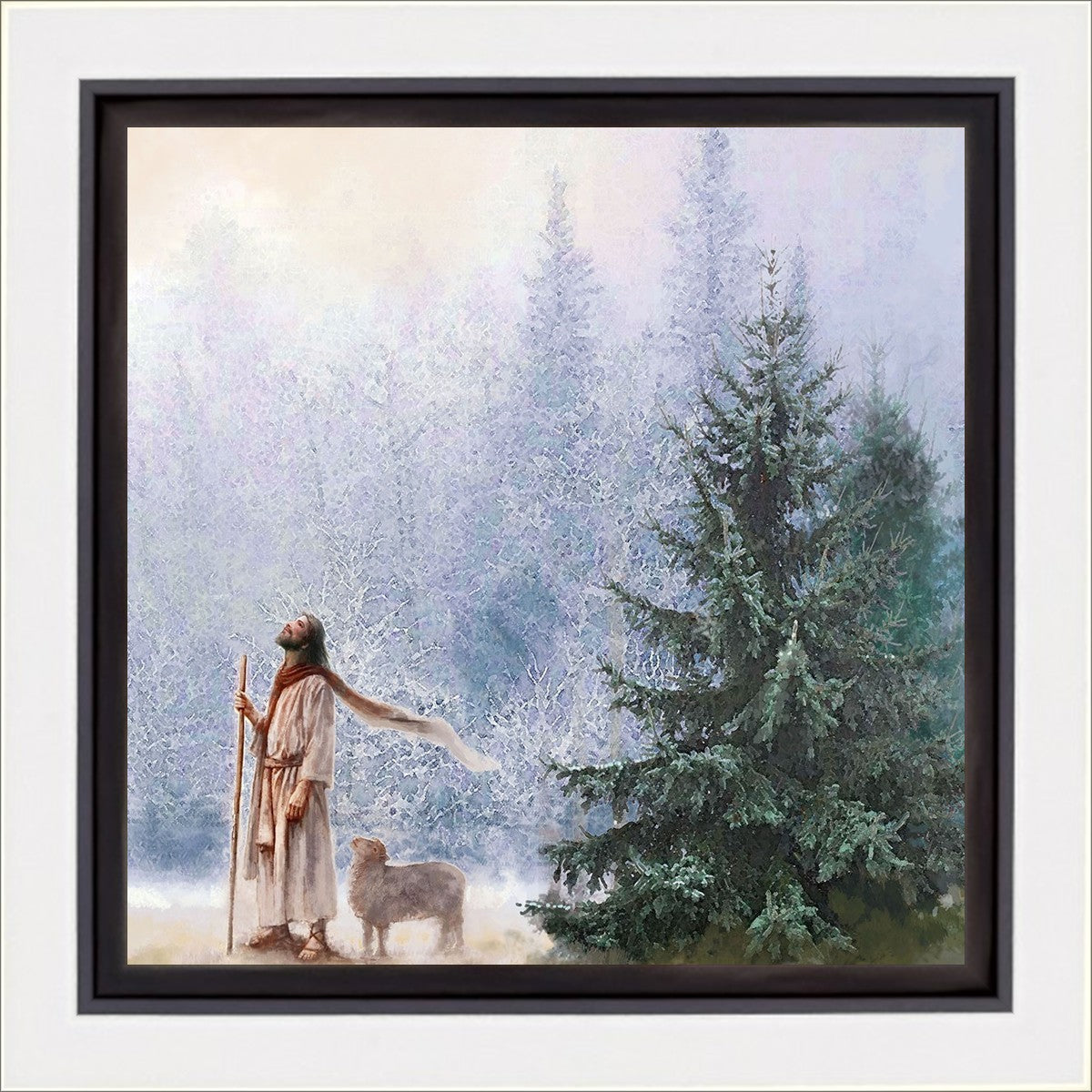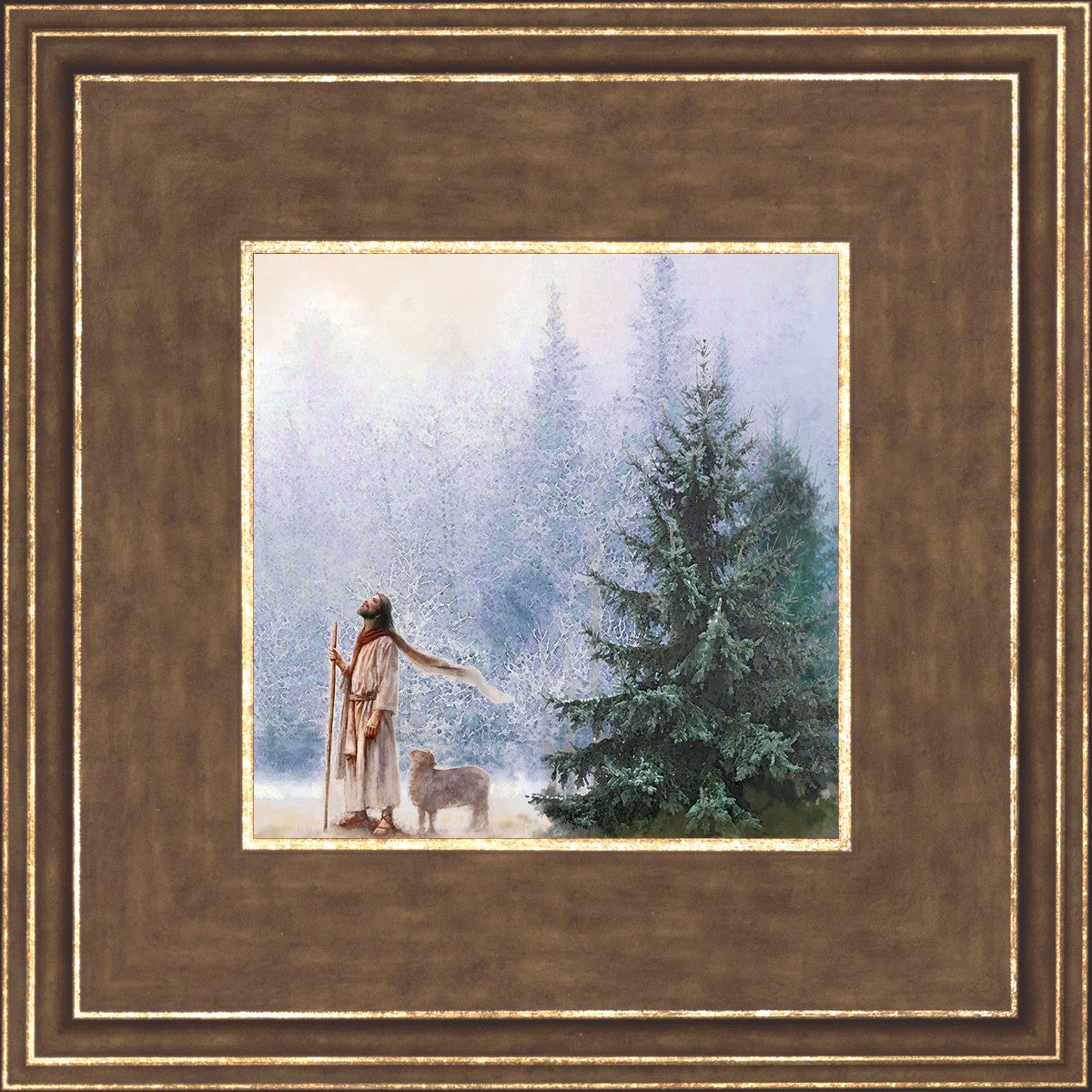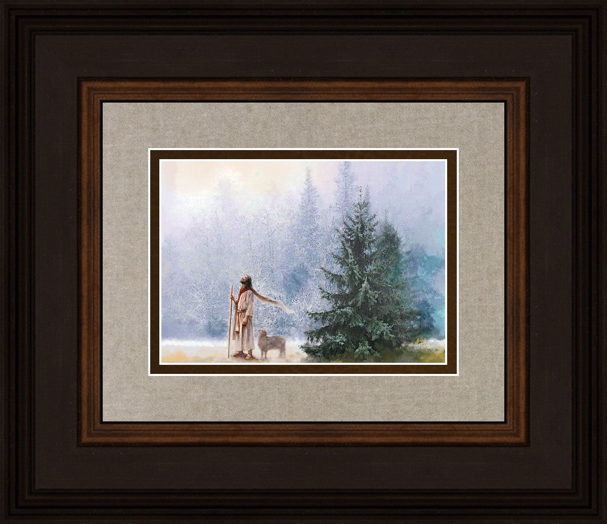 Heavenward by Yongsung Kim depicts Jesus, surrounded by trees, walking with a lamb and looking upward to the Heavens.