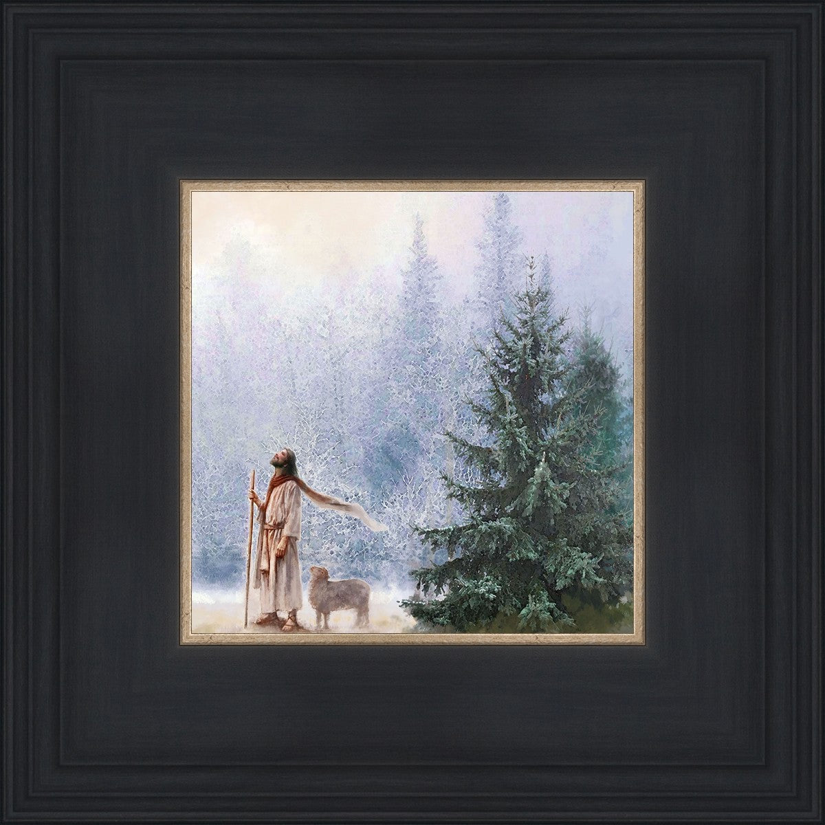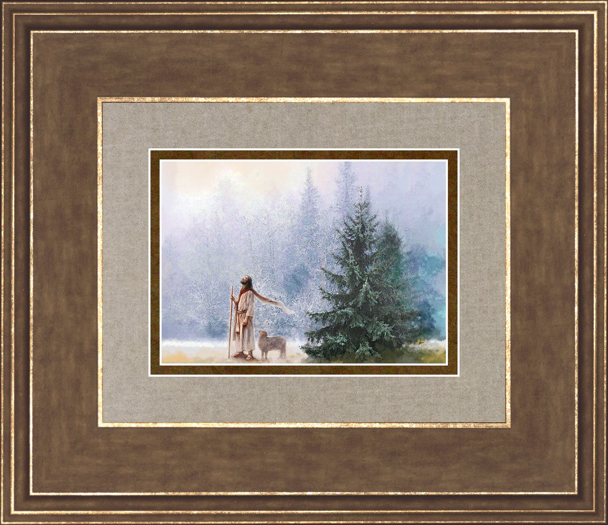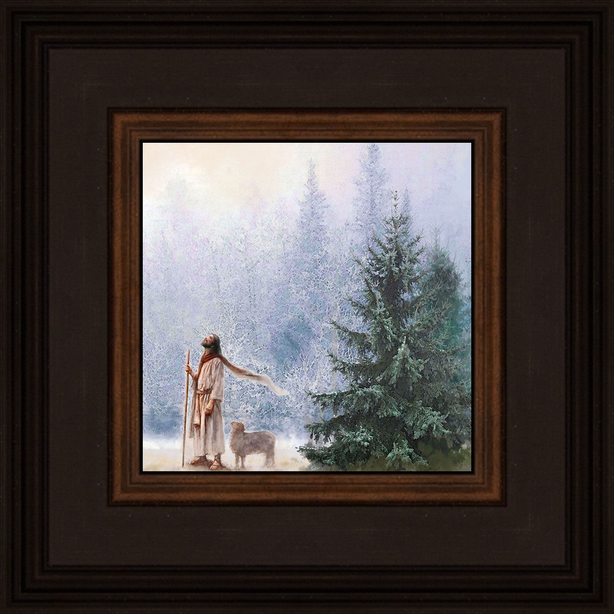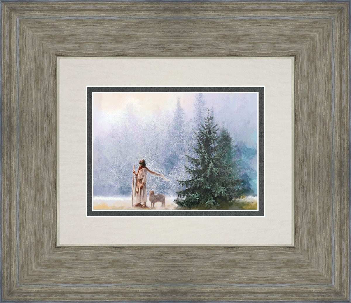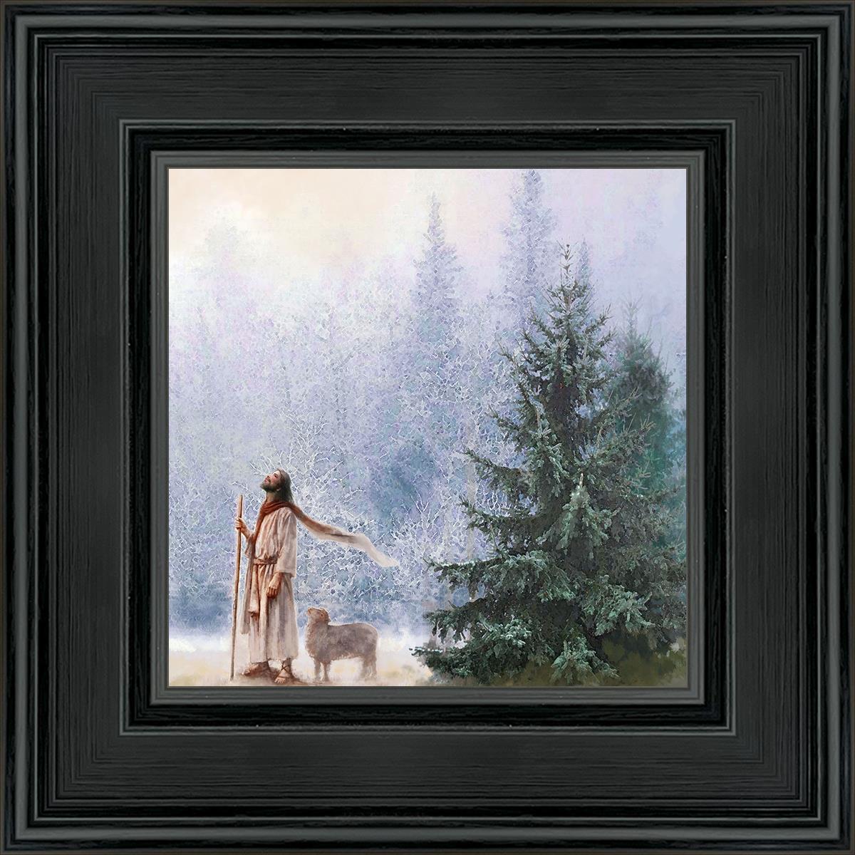 Heavenward by Yongsung Kim depicts Jesus, surrounded by trees, walking with a lamb and looking upward to the Heavens.