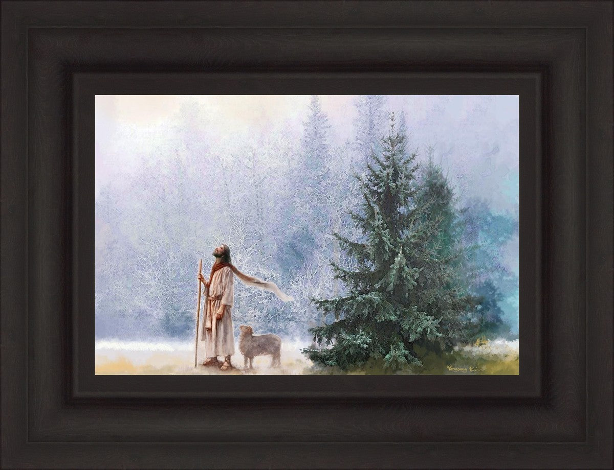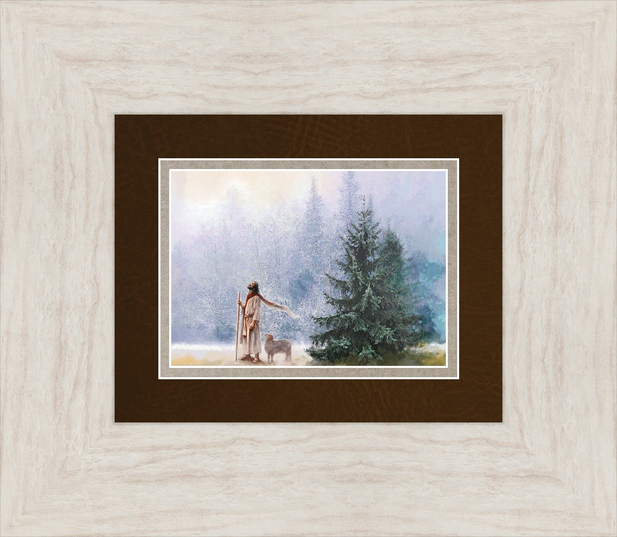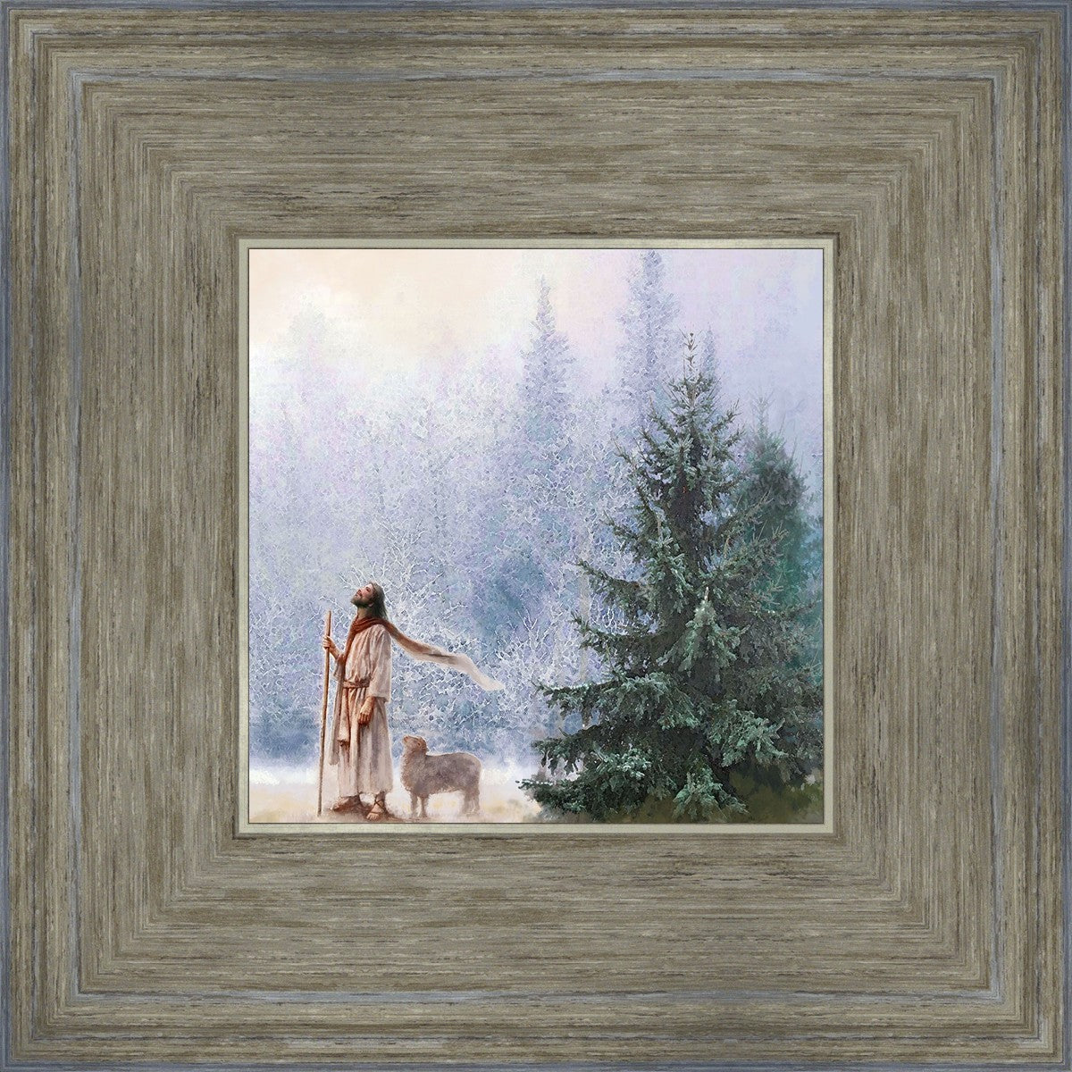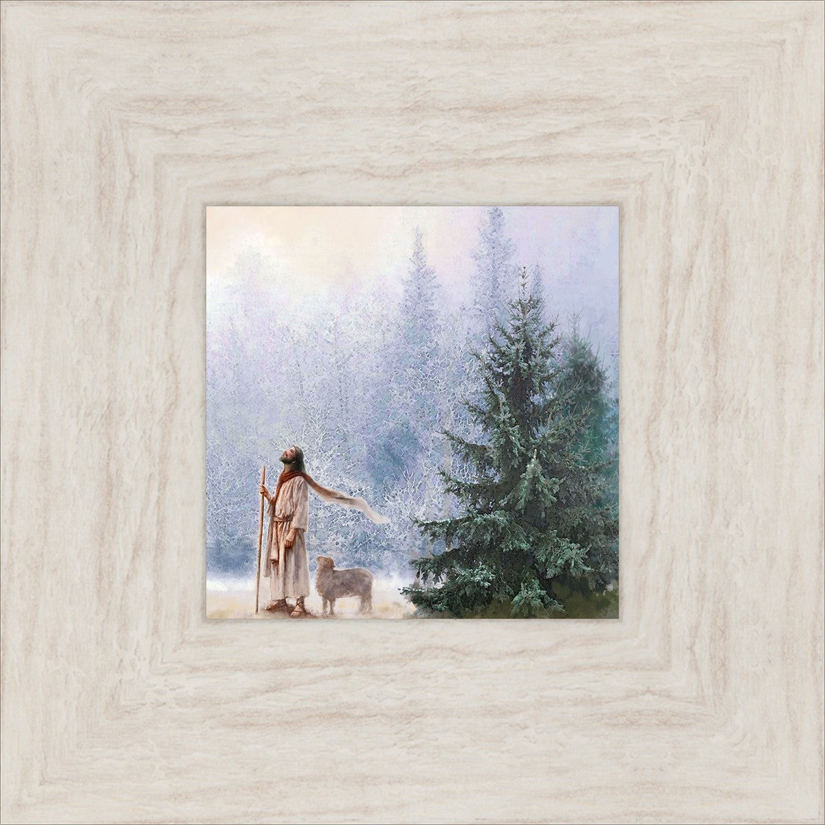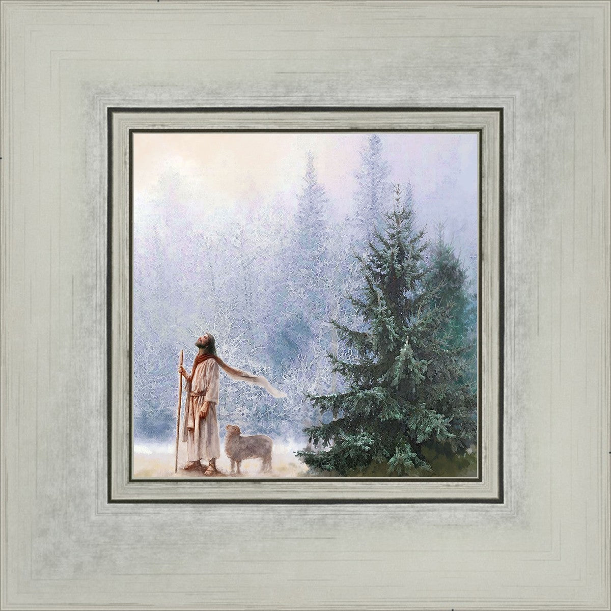 Heavenward by Yongsung Kim depicts Jesus, surrounded by trees, walking with a lamb and looking upward to the Heavens.