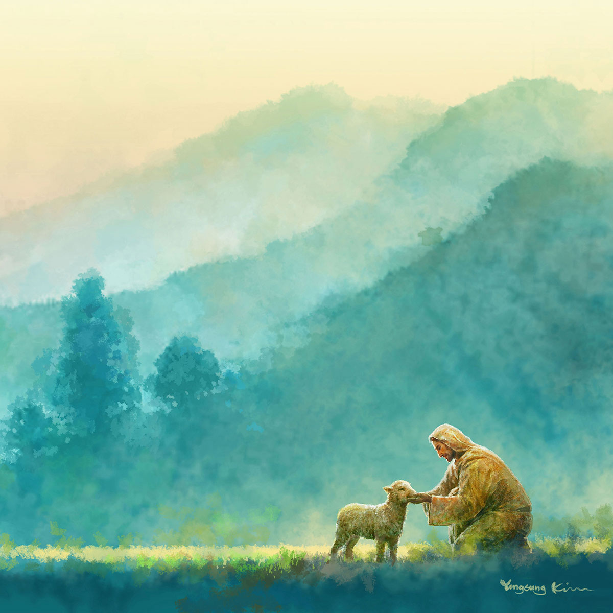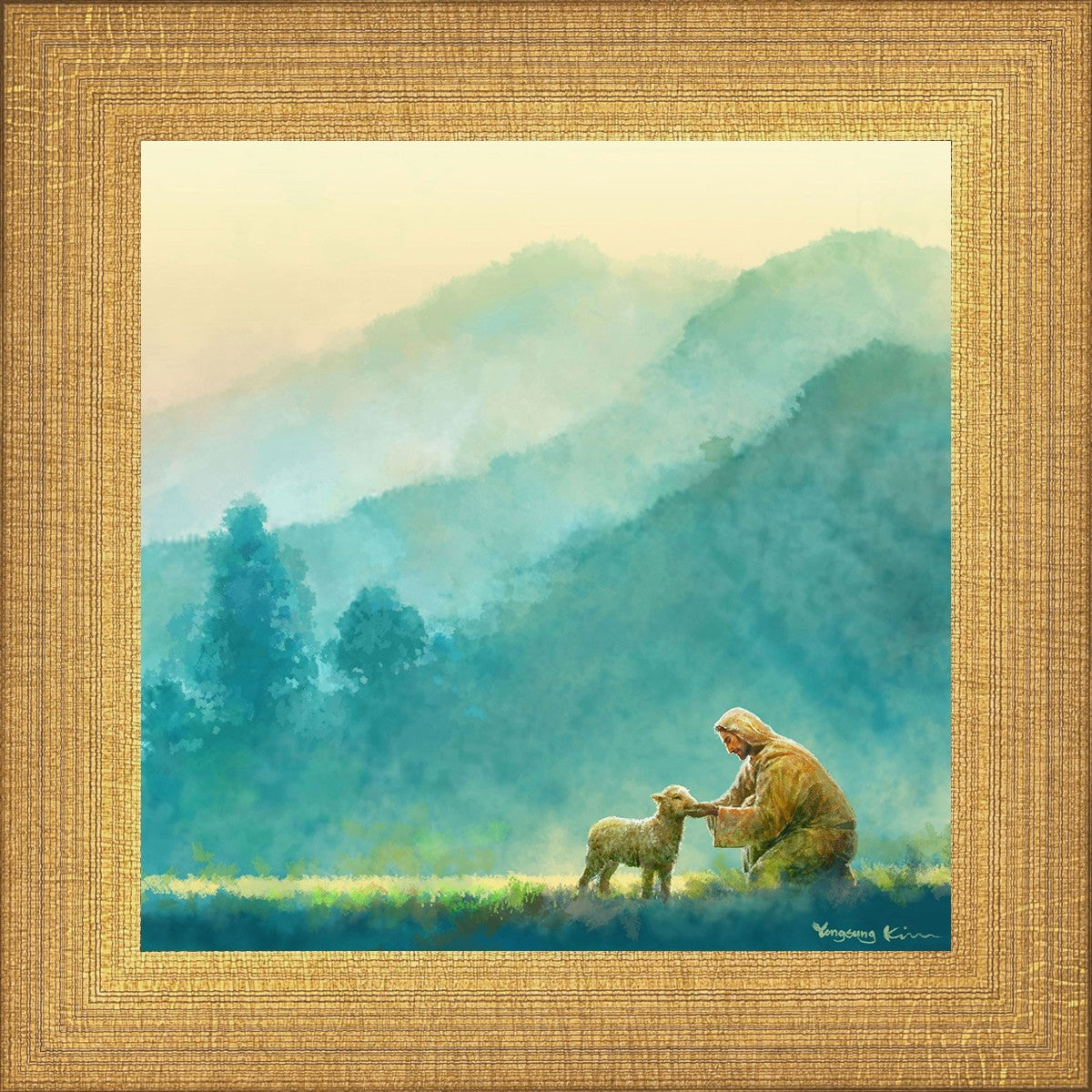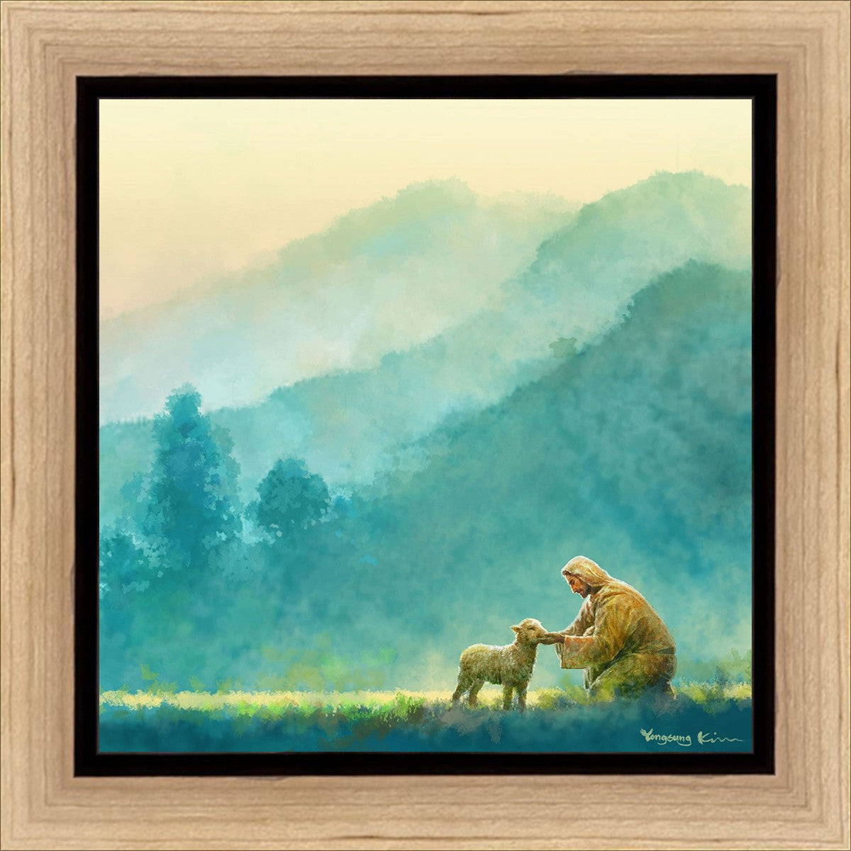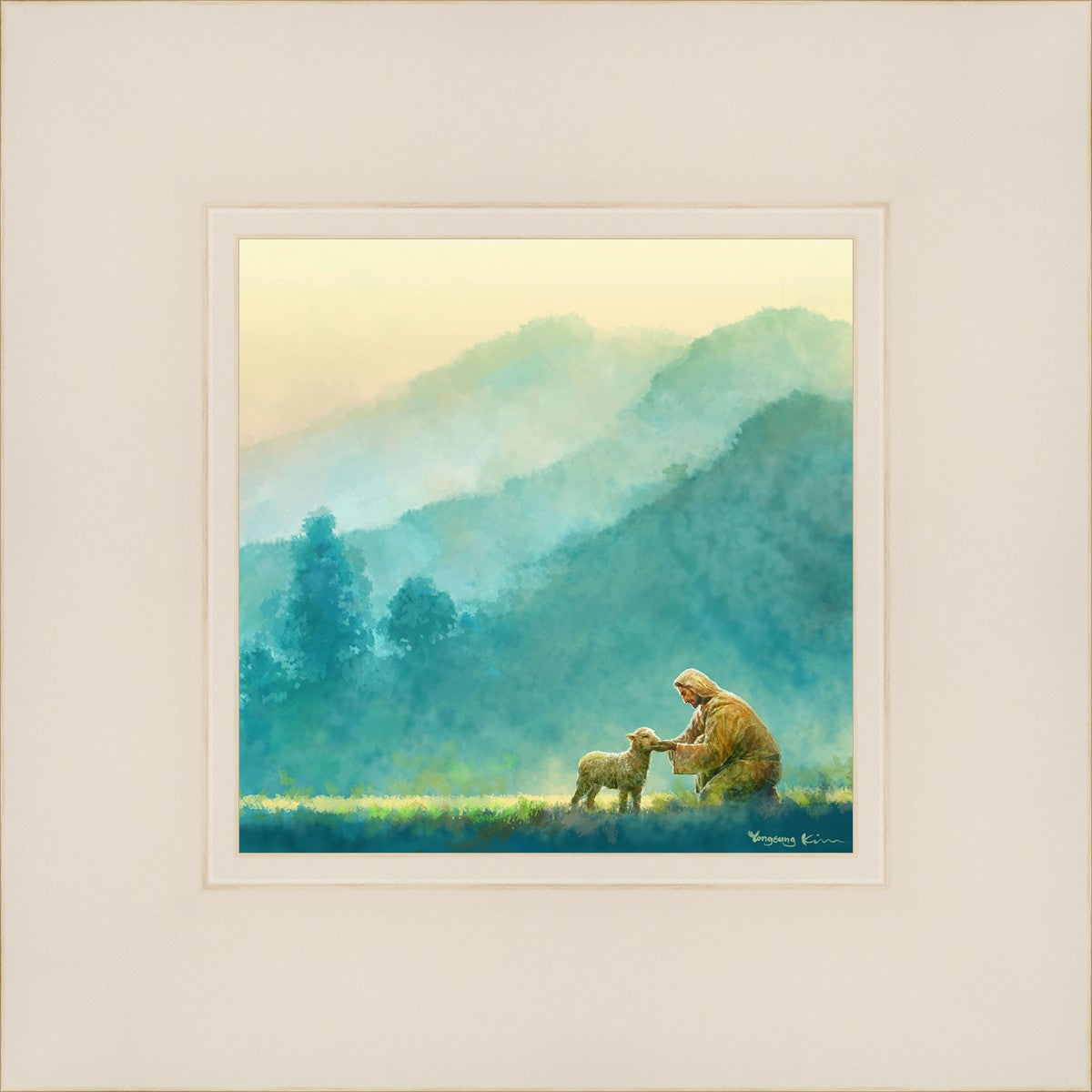 "Little One" by Yongsung Kim is a painting showcasing Jesus Christ tenderly caring for a lost lamb in a vast field, symbolizing His role as the Good Shepherd. This captivating artwork by Yongsung Kim captures the essence of divine care and compassion, for each and every member of His flock.