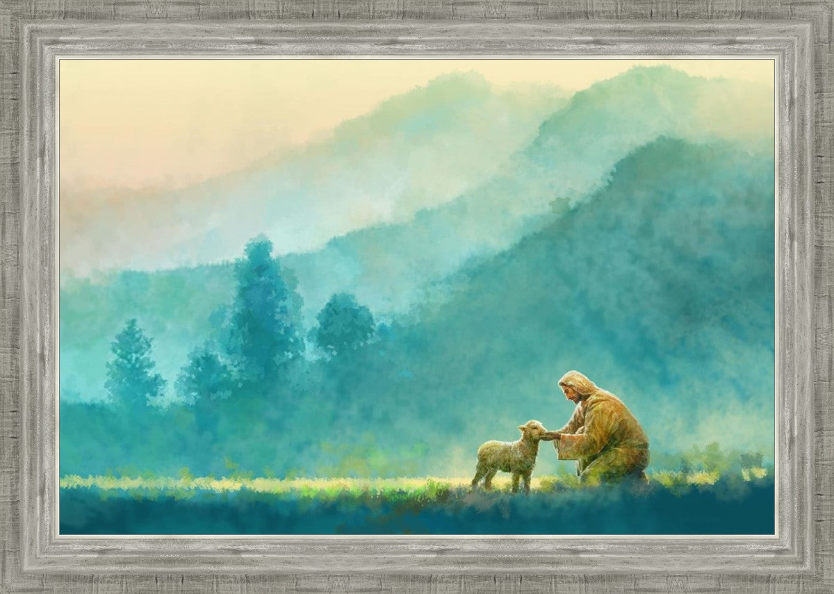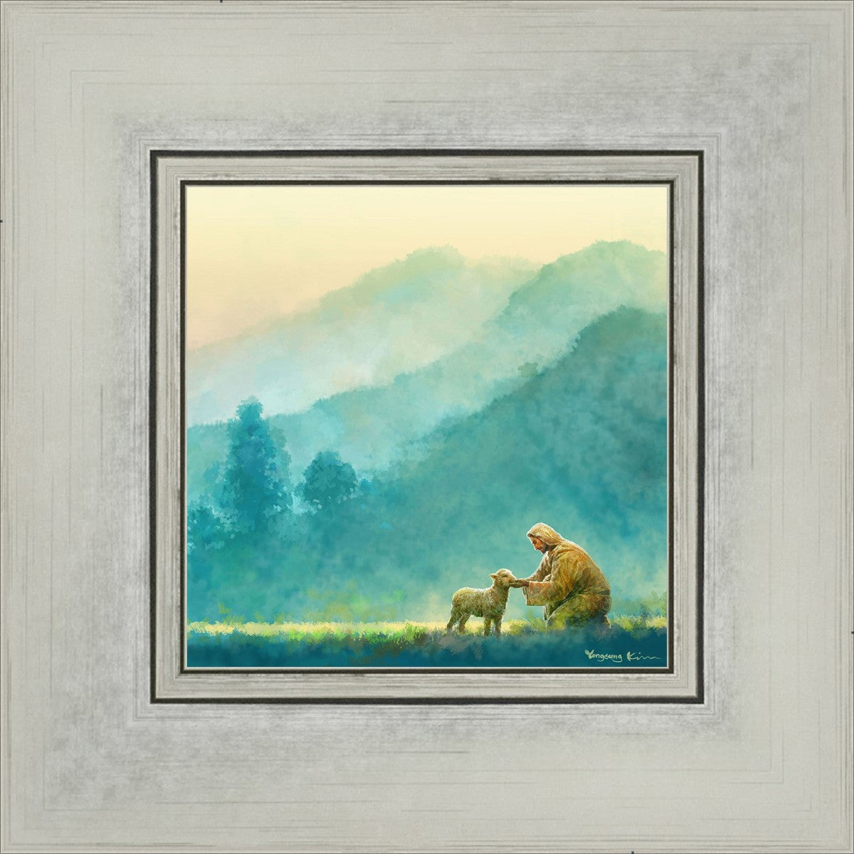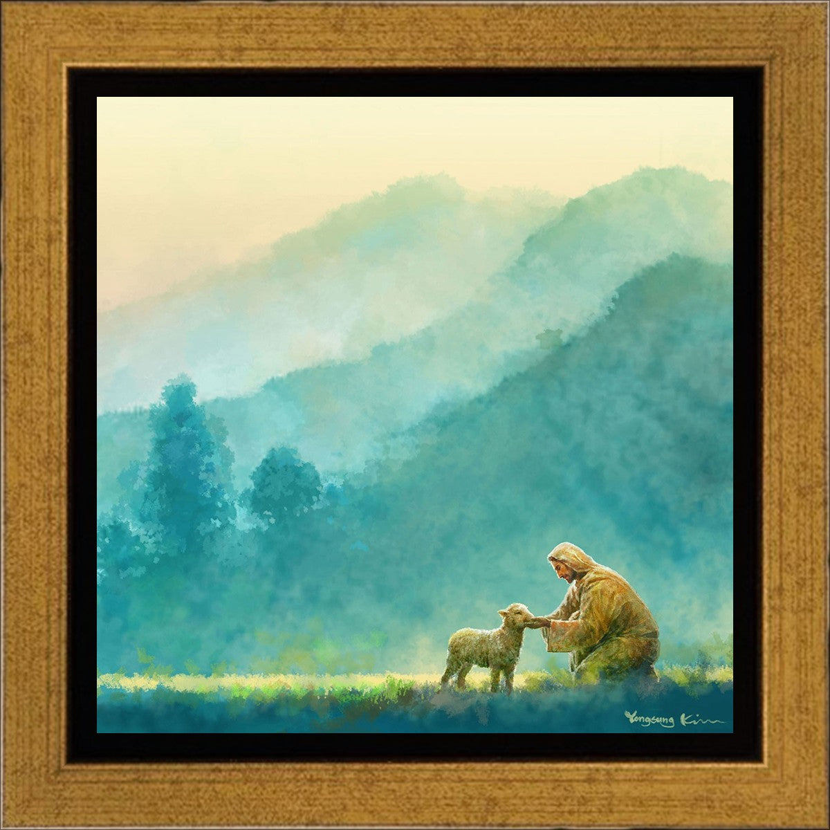 "Little One" by Yongsung Kim is a painting showcasing Jesus Christ tenderly caring for a lost lamb in a vast field, symbolizing His role as the Good Shepherd. This captivating artwork by Yongsung Kim captures the essence of divine care and compassion, for each and every member of His flock.