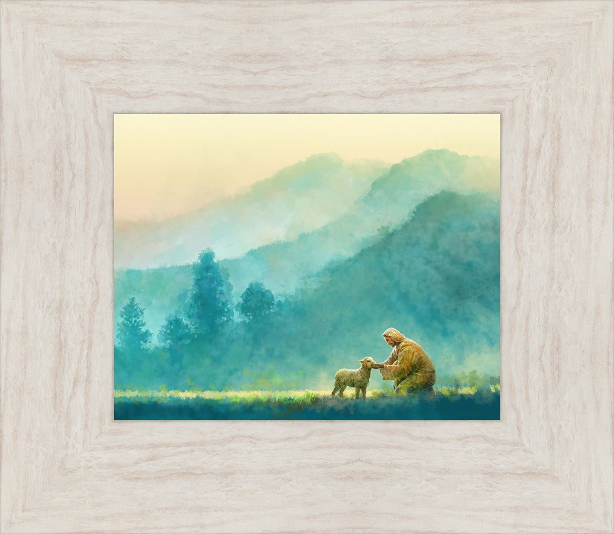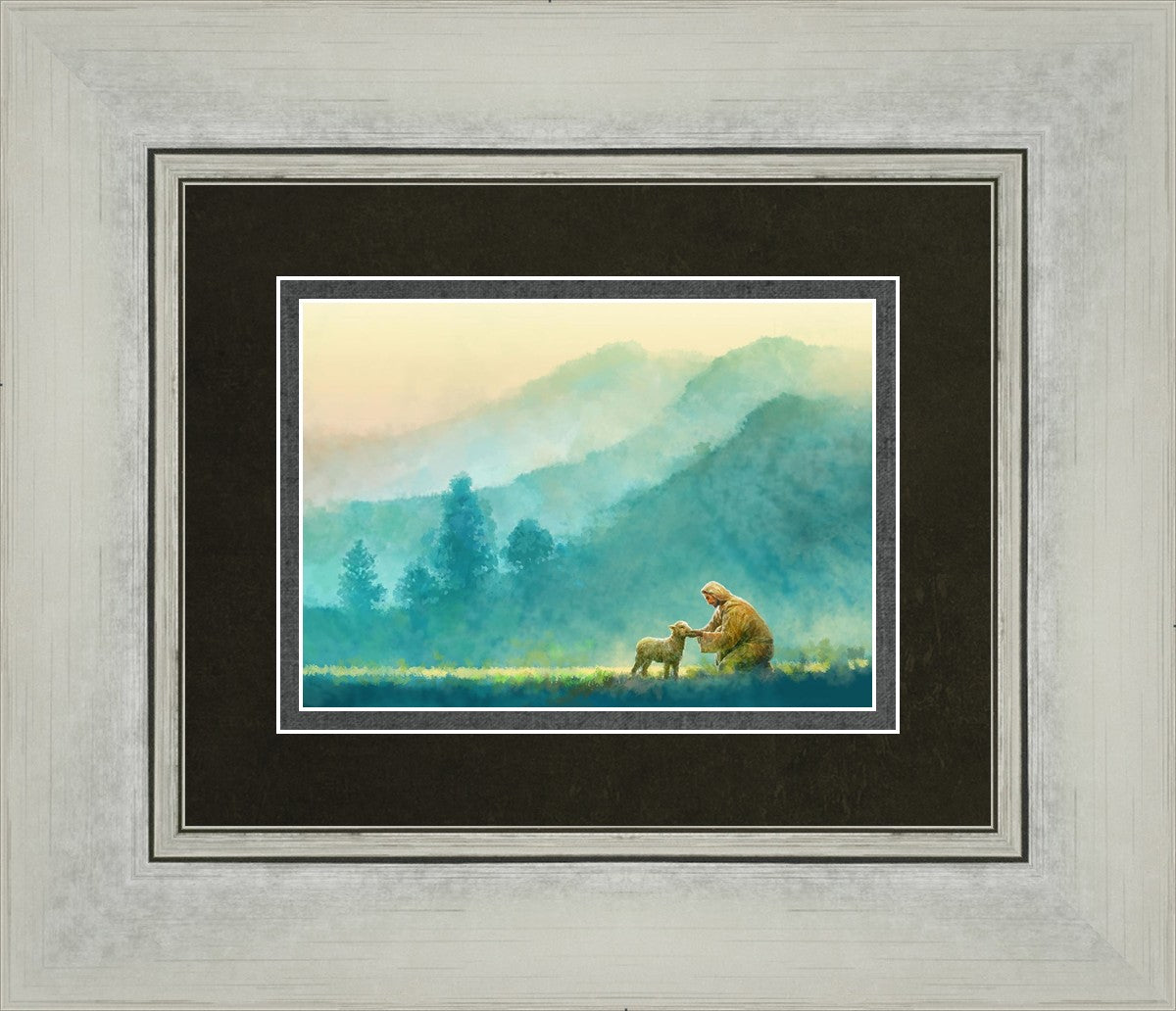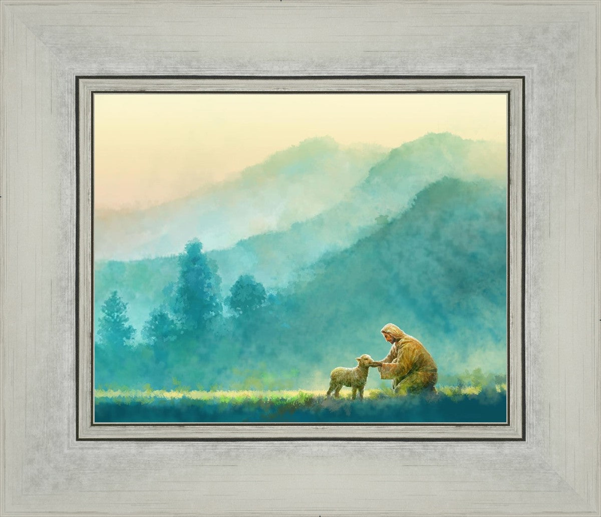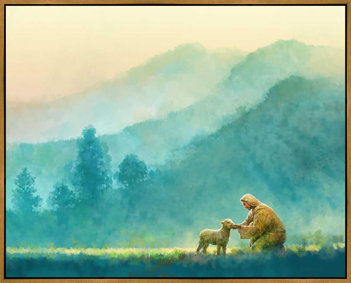 "Little One" by Yongsung Kim is a painting showcasing Jesus Christ tenderly caring for a lost lamb in a vast field, symbolizing His role as the Good Shepherd. This captivating artwork by Yongsung Kim captures the essence of divine care and compassion, for each and every member of His flock.