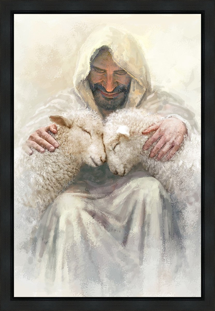 Painting of Love by Yongsung Kim depicting Christ holding two sheep.