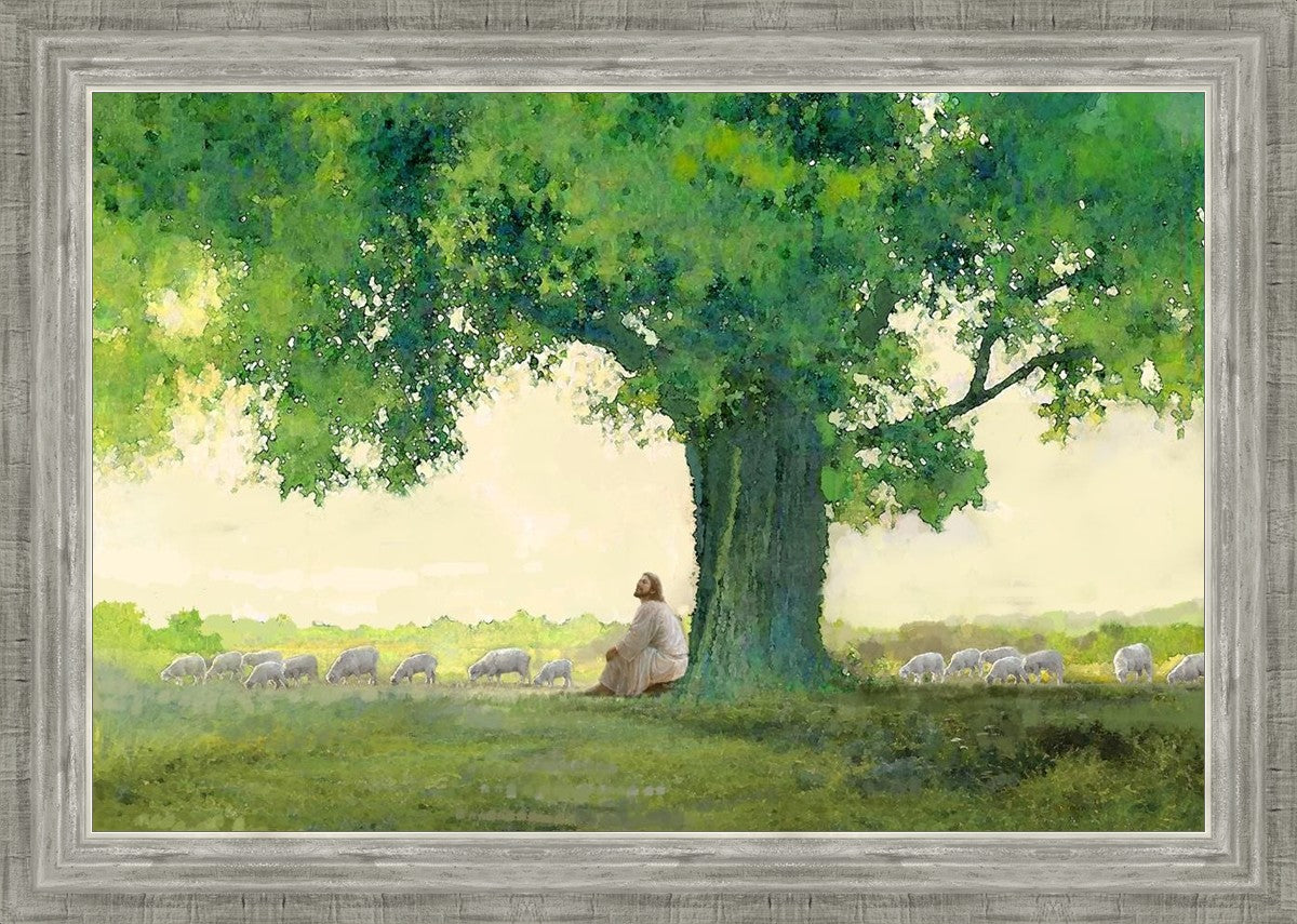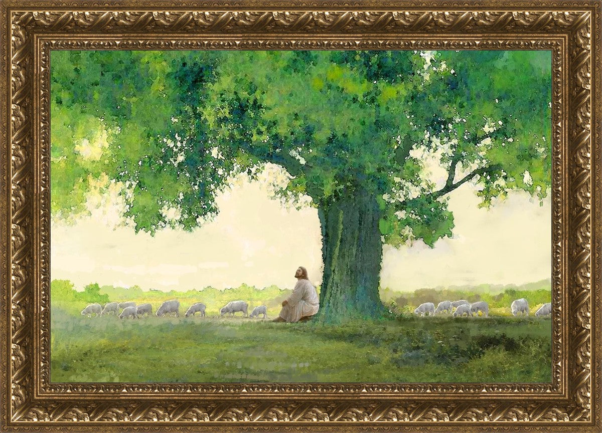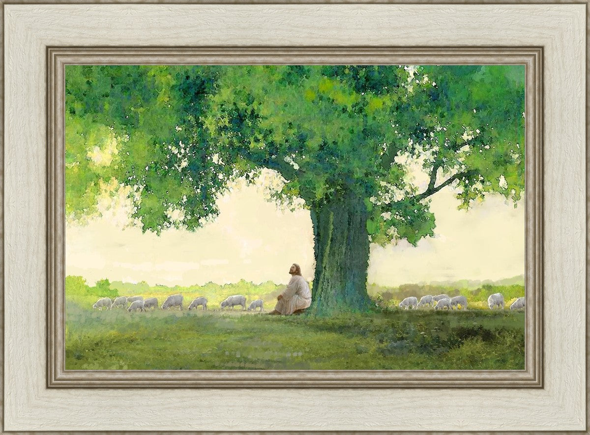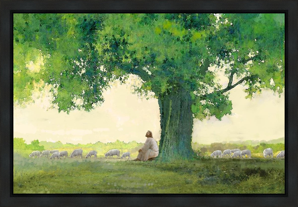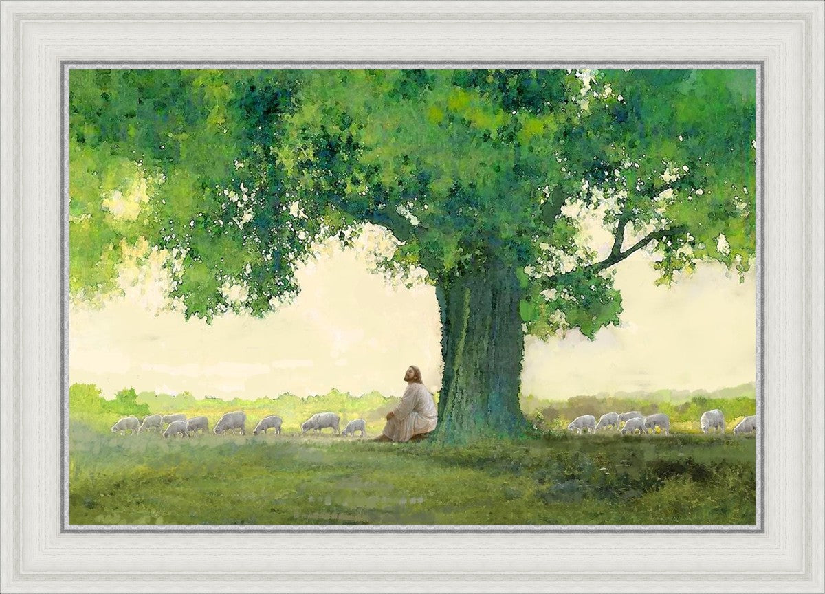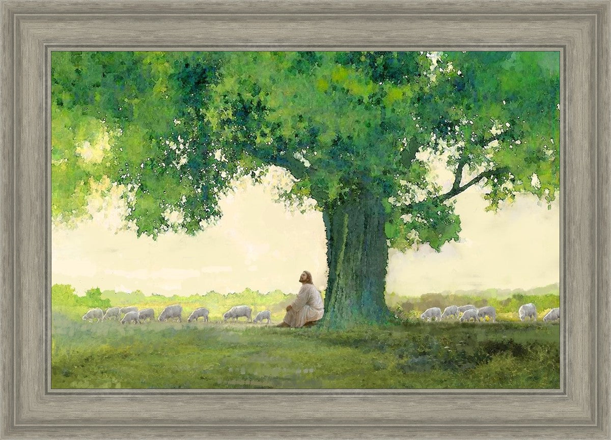 Morning Solace is a painting by Yongsung Kim. This painting depicts Jesus Christ sitting under a big green tree while watching His flock.