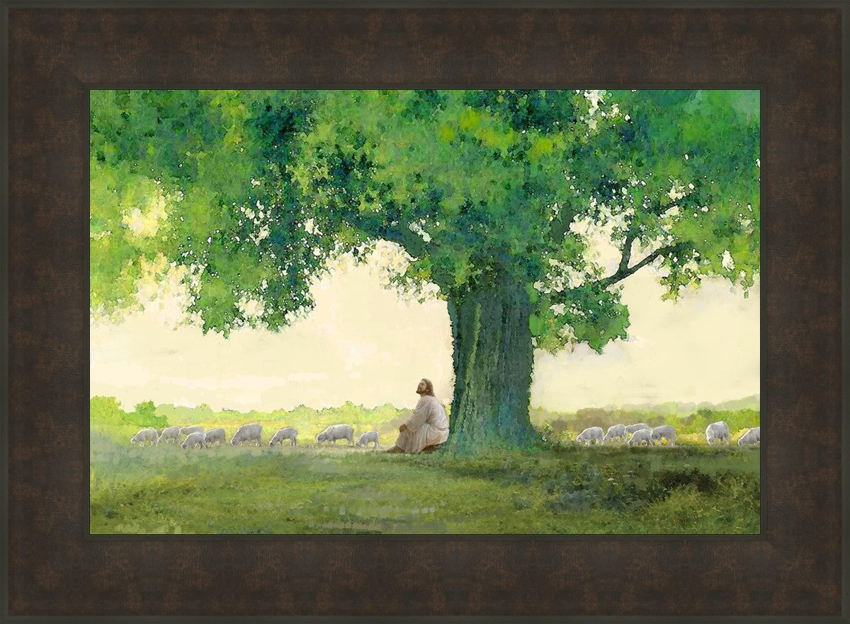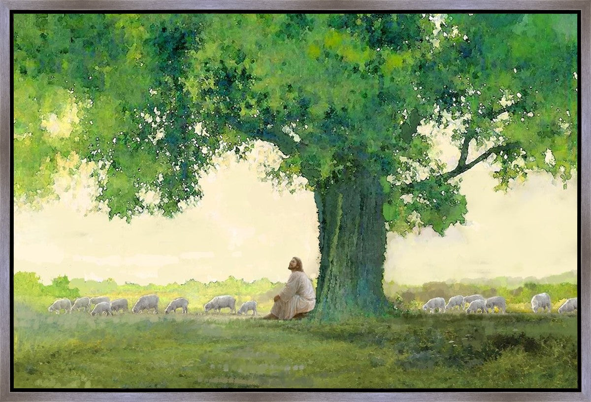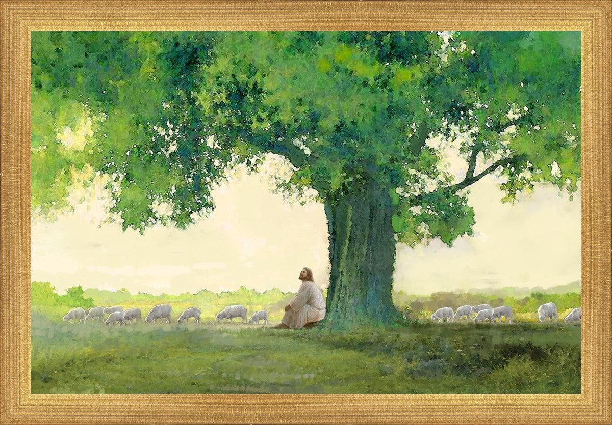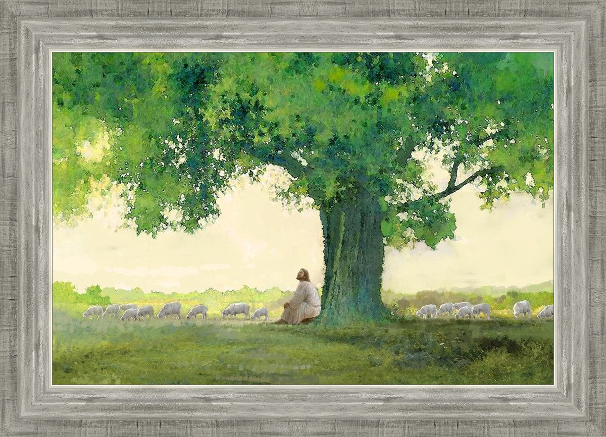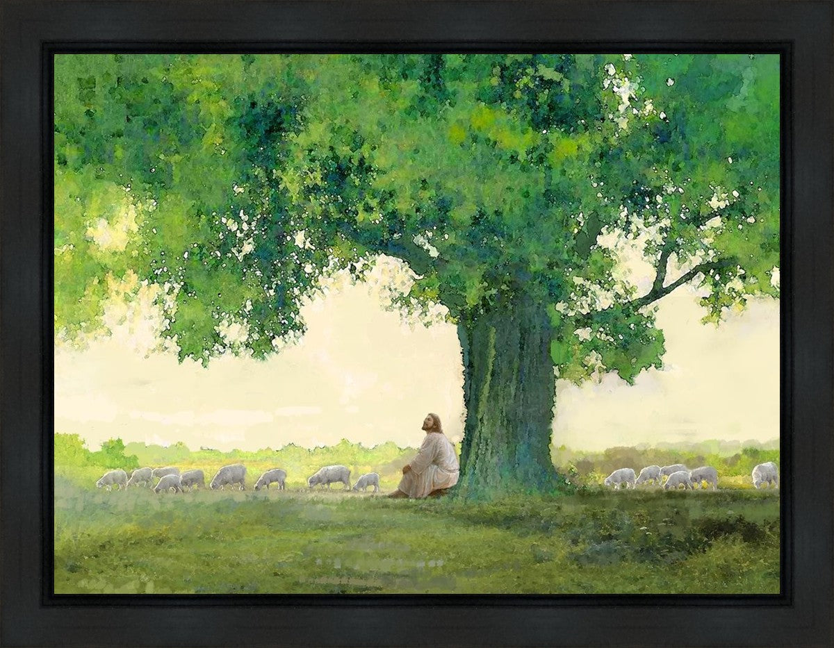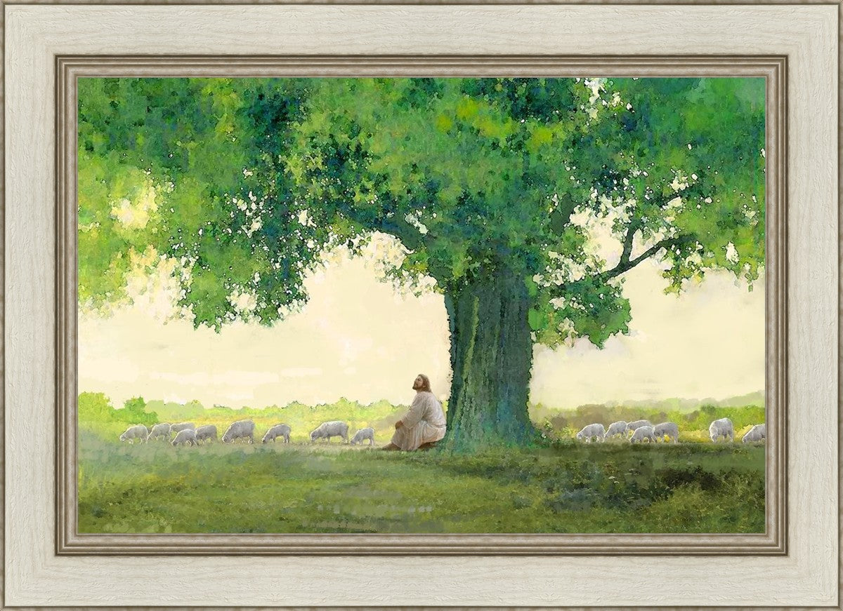Morning Solace is a painting by Yongsung Kim. This painting depicts Jesus Christ sitting under a big green tree while watching His flock.