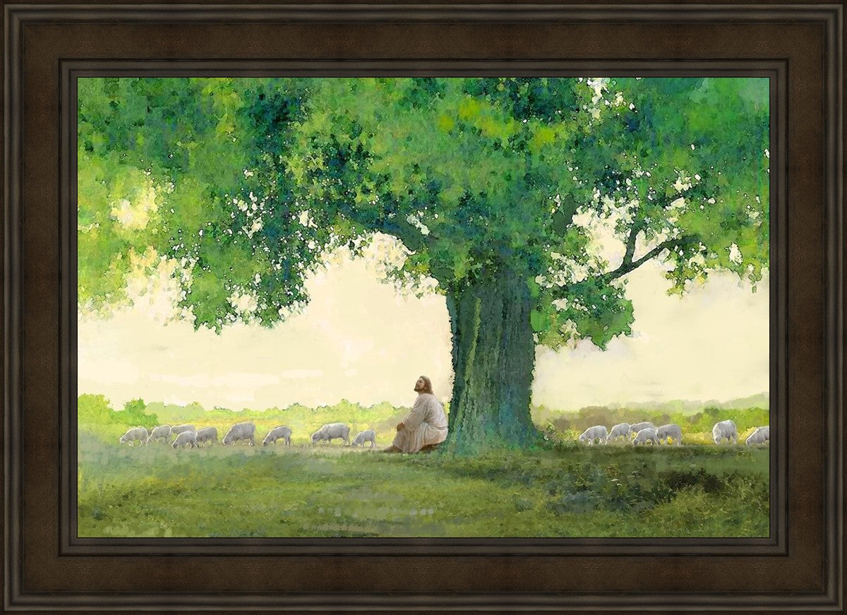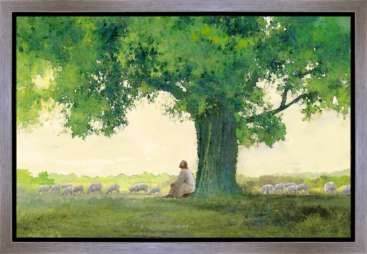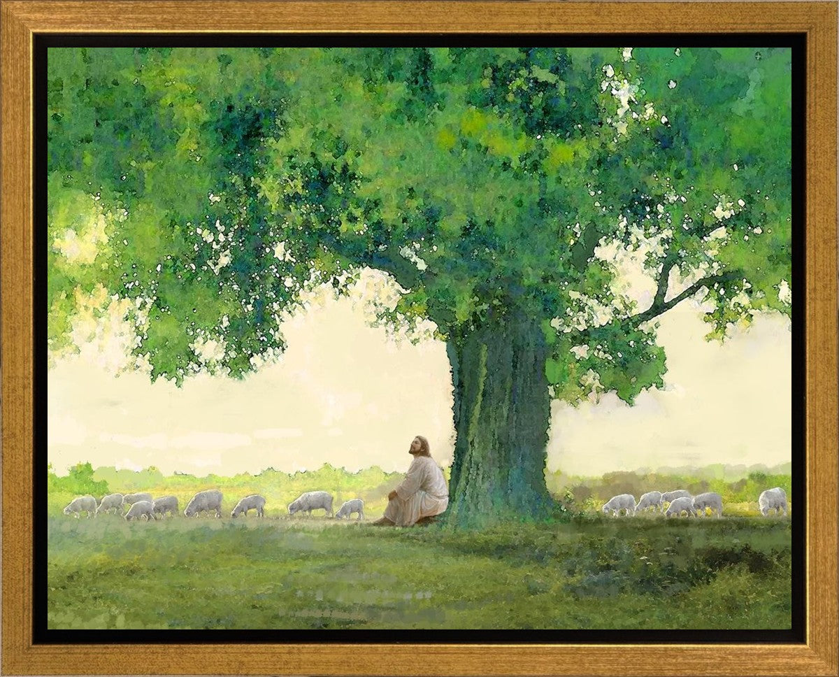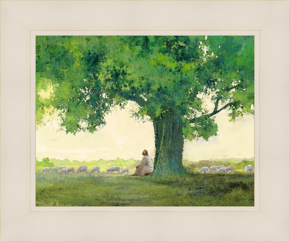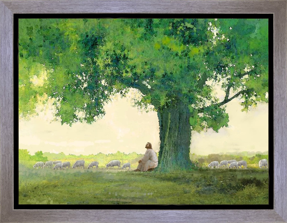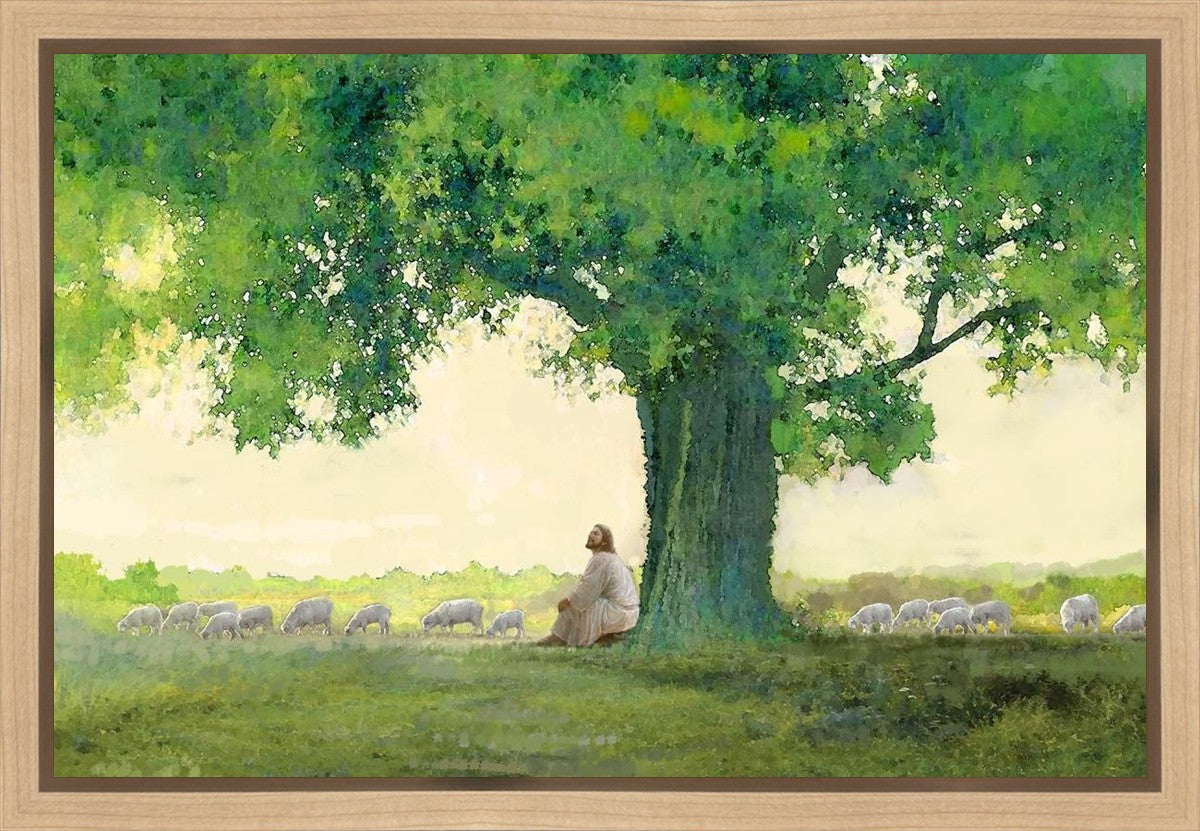 Morning Solace is a painting by Yongsung Kim. This painting depicts Jesus Christ sitting under a big green tree while watching His flock.