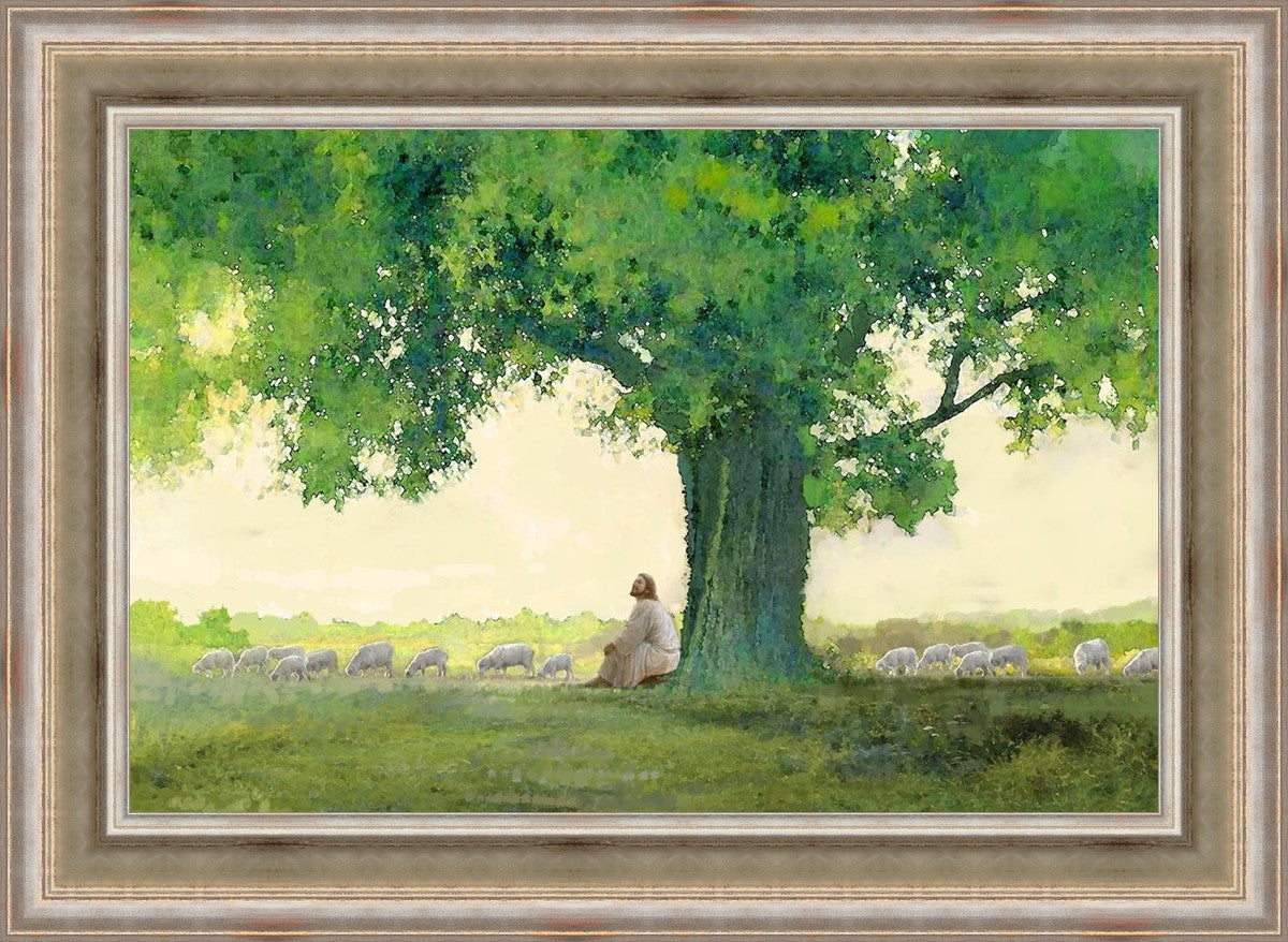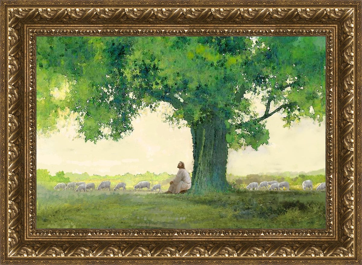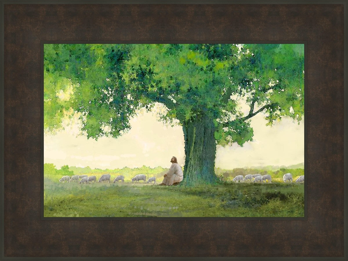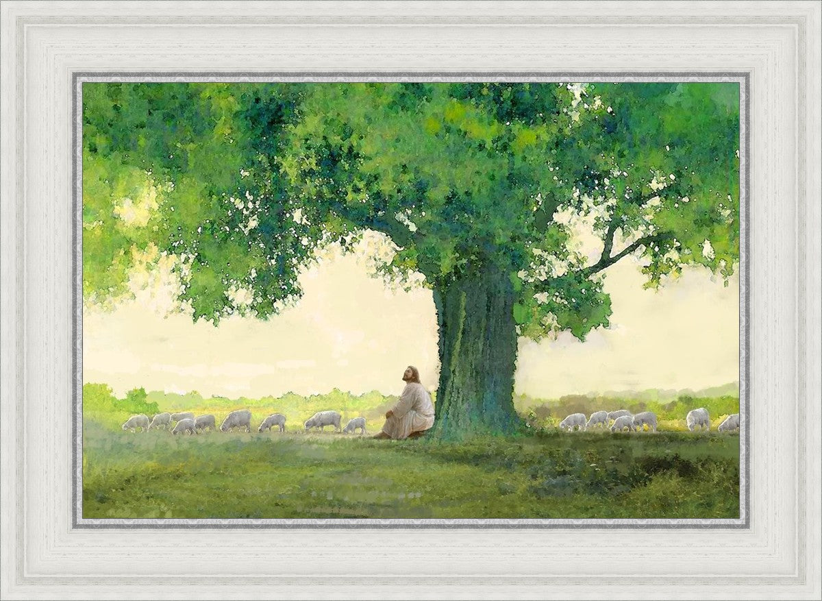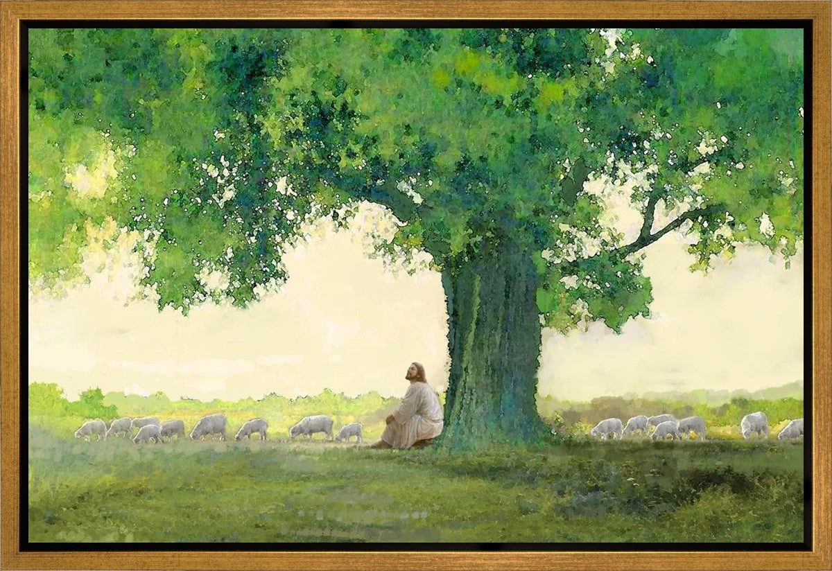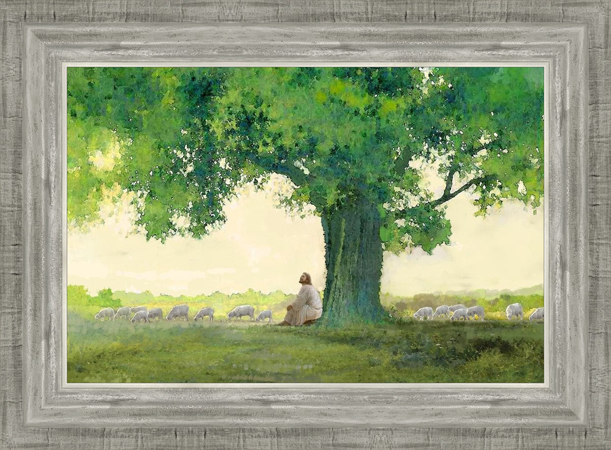 Morning Solace is a painting by Yongsung Kim. This painting depicts Jesus Christ sitting under a big green tree while watching His flock.