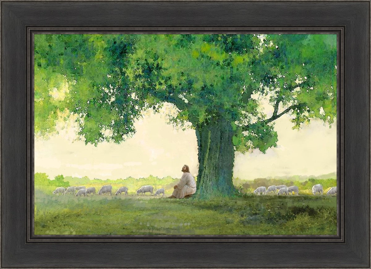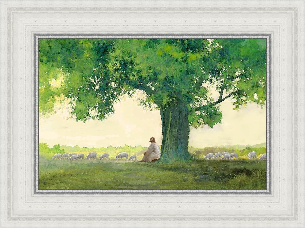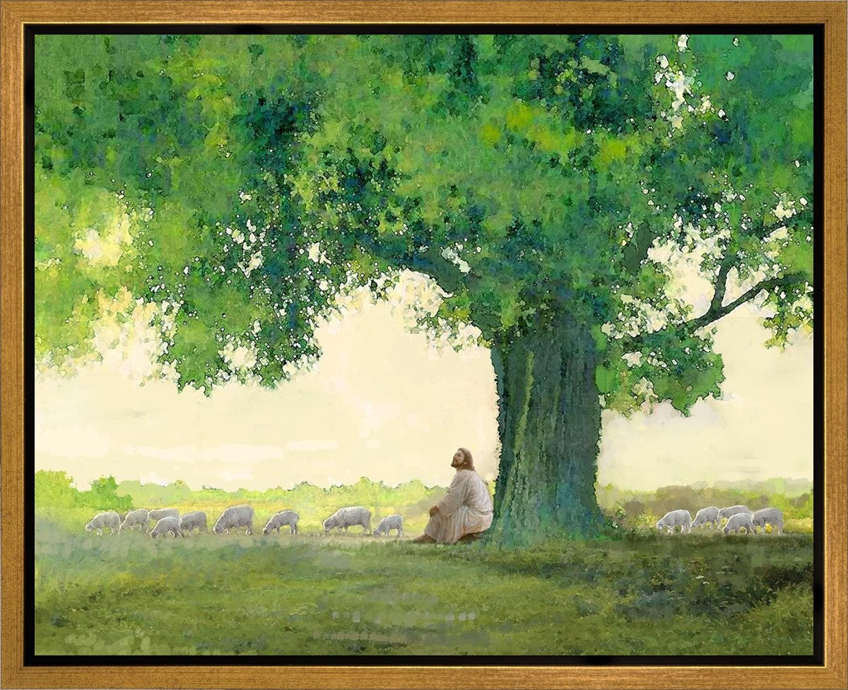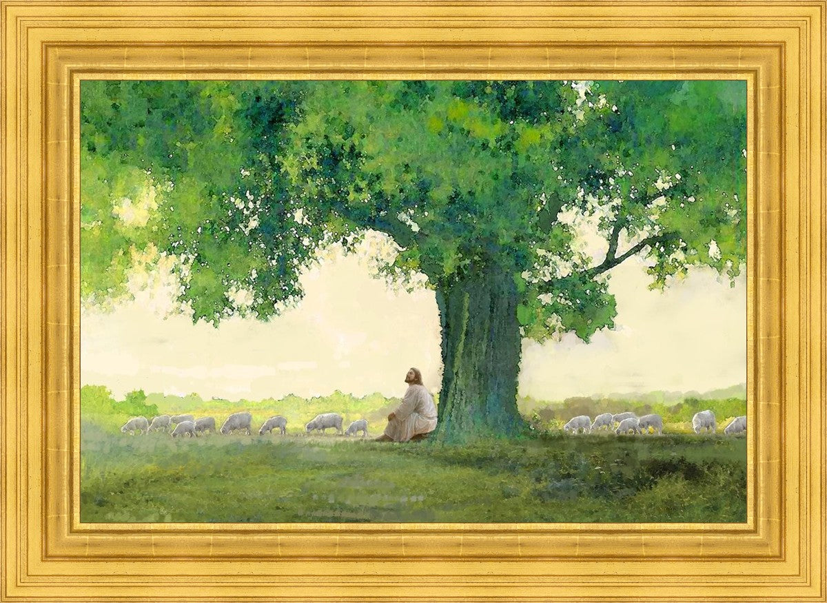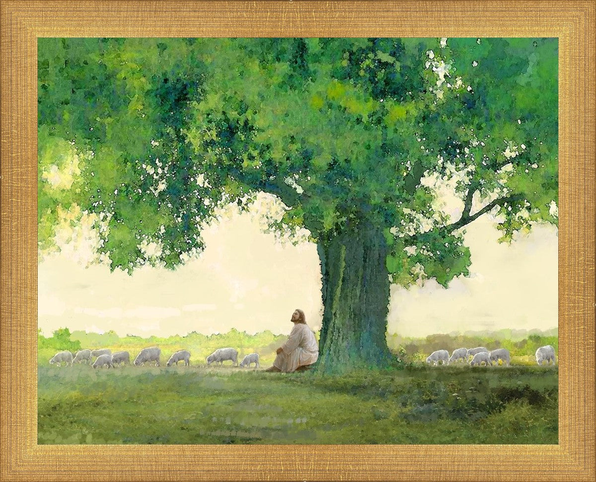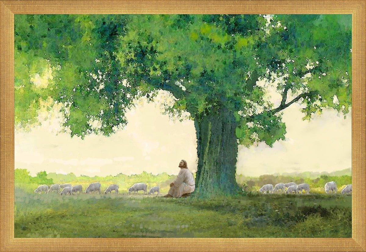 Morning Solace is a painting by Yongsung Kim. This painting depicts Jesus Christ sitting under a big green tree while watching His flock.