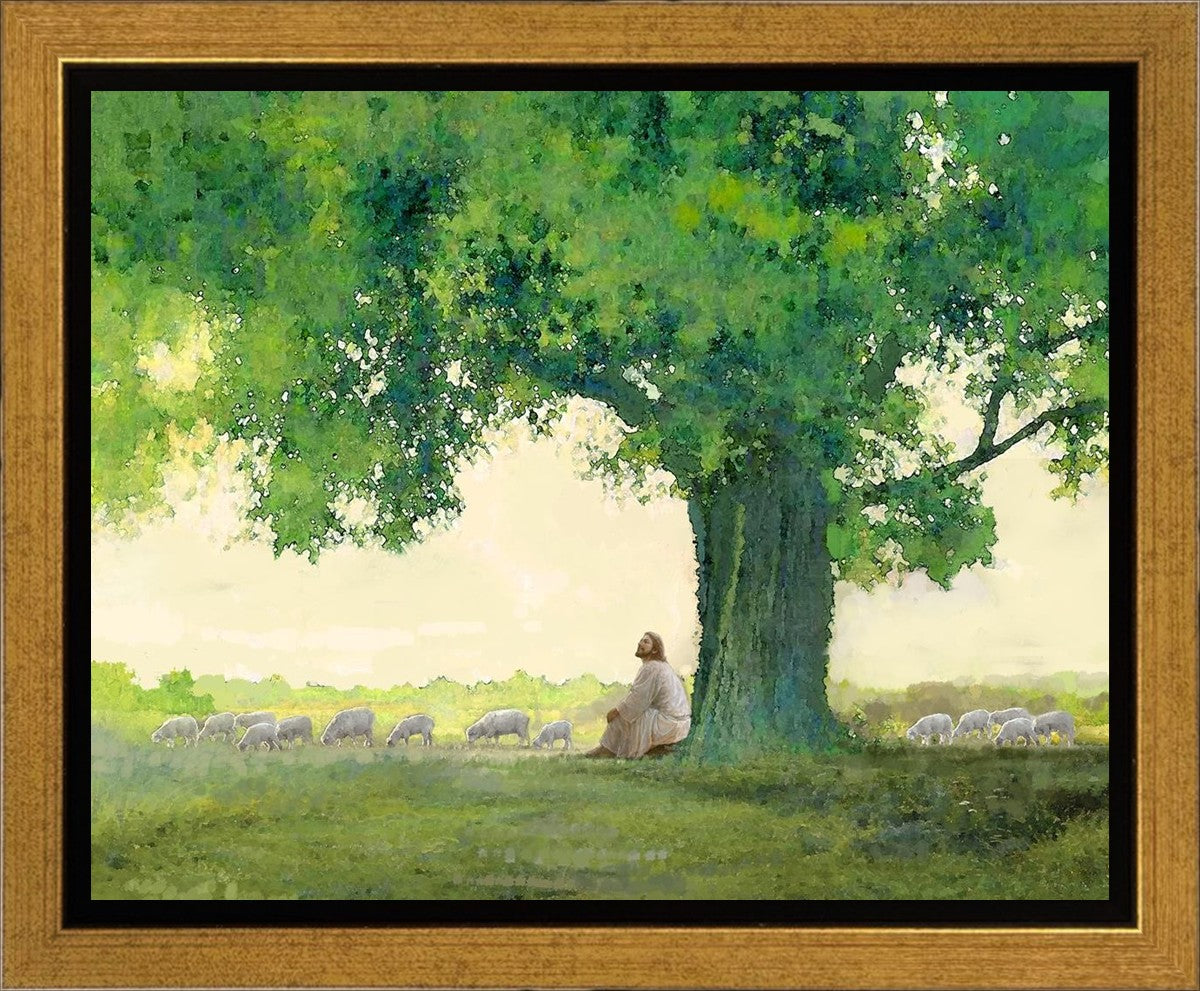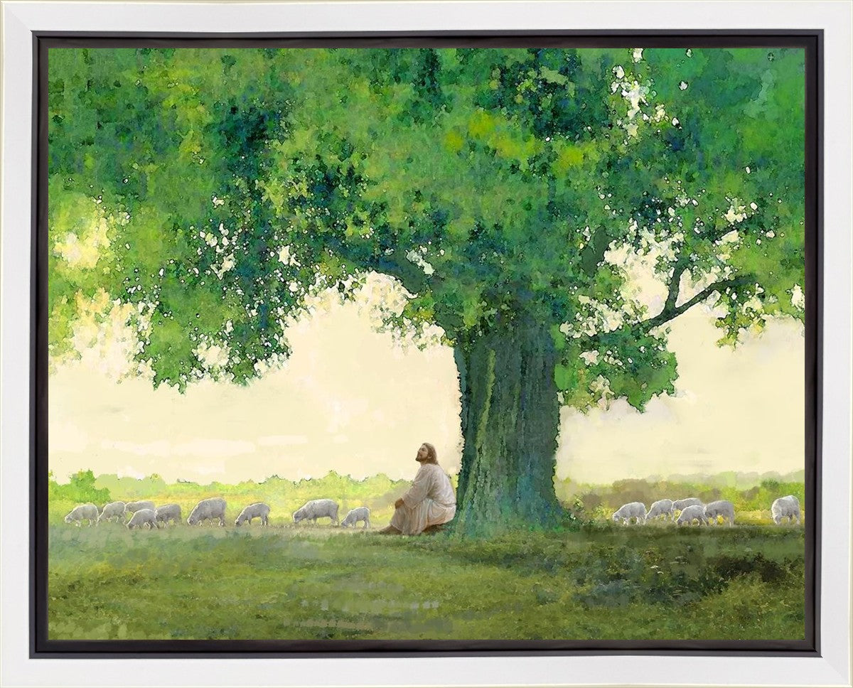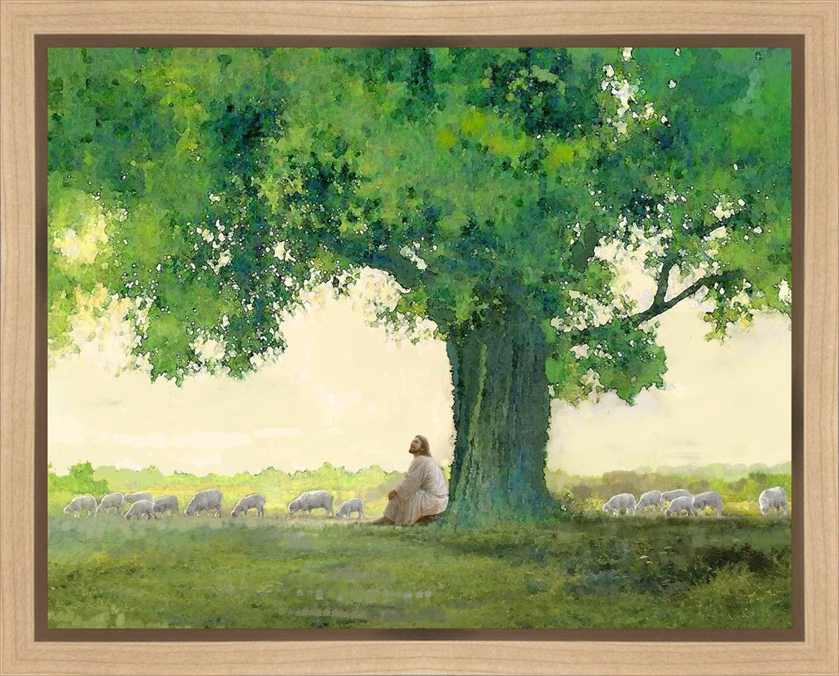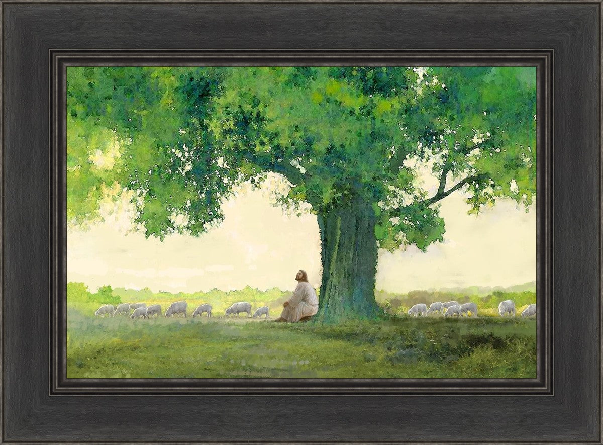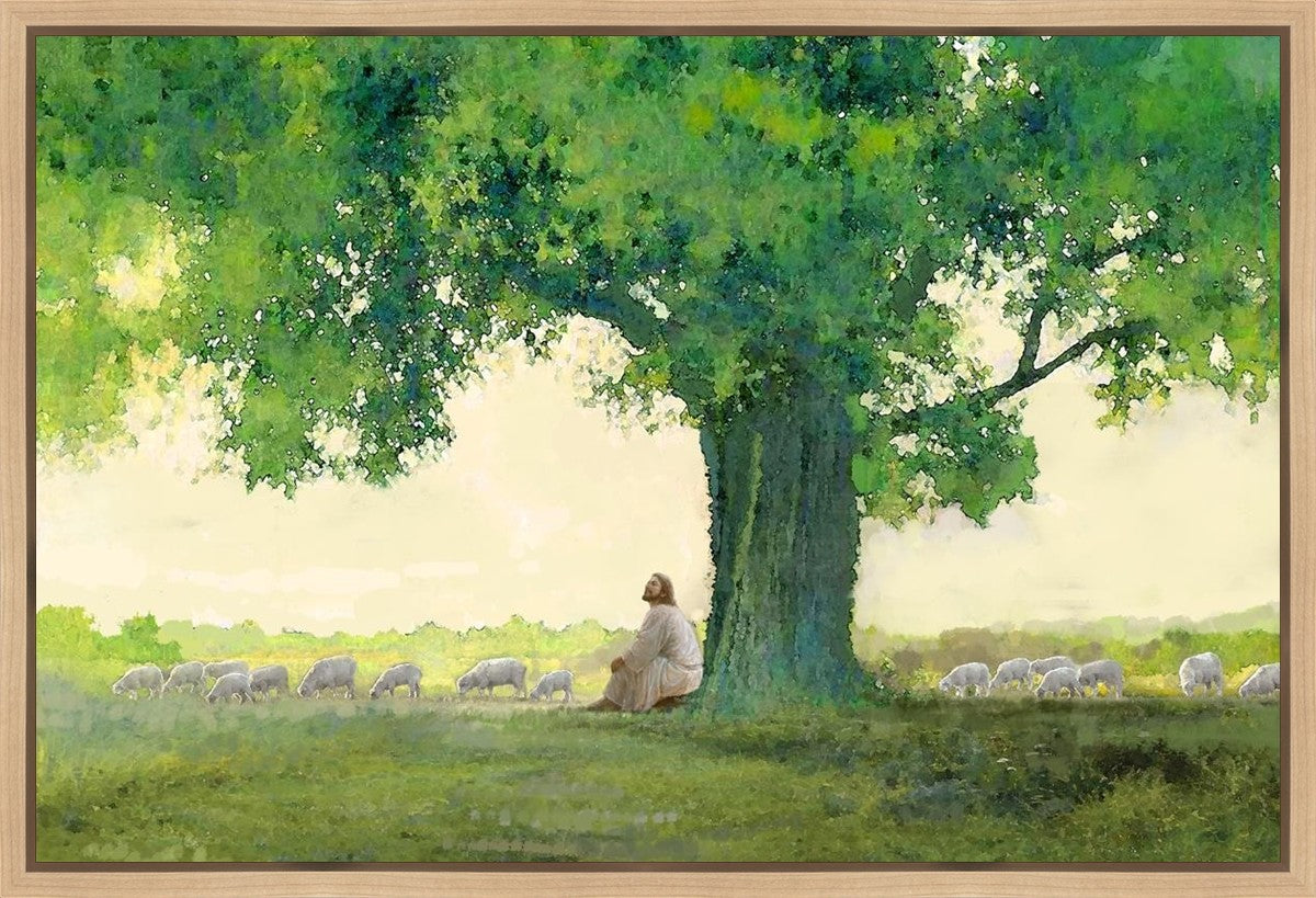 Morning Solace is a painting by Yongsung Kim. This painting depicts Jesus Christ sitting under a big green tree while watching His flock.