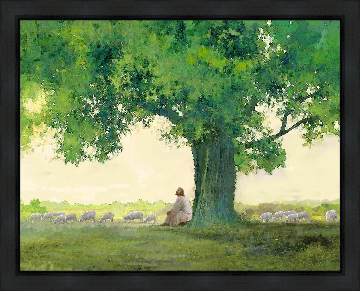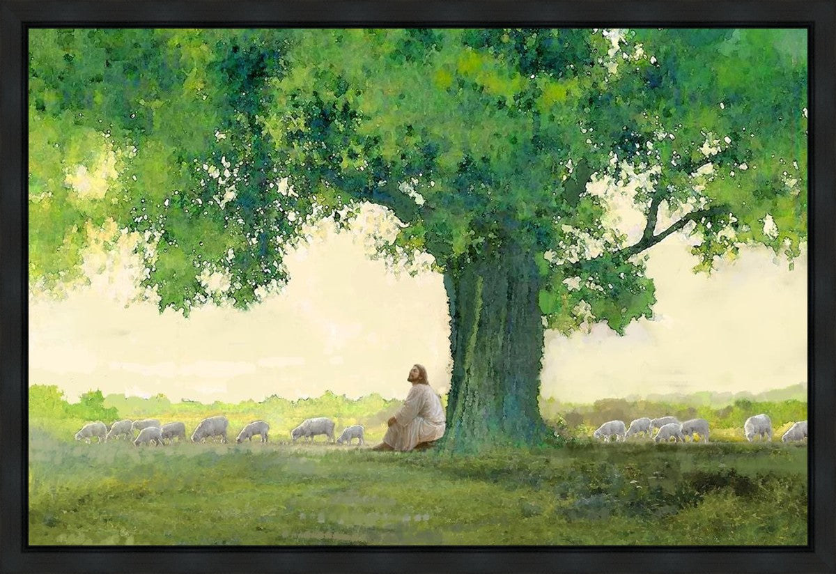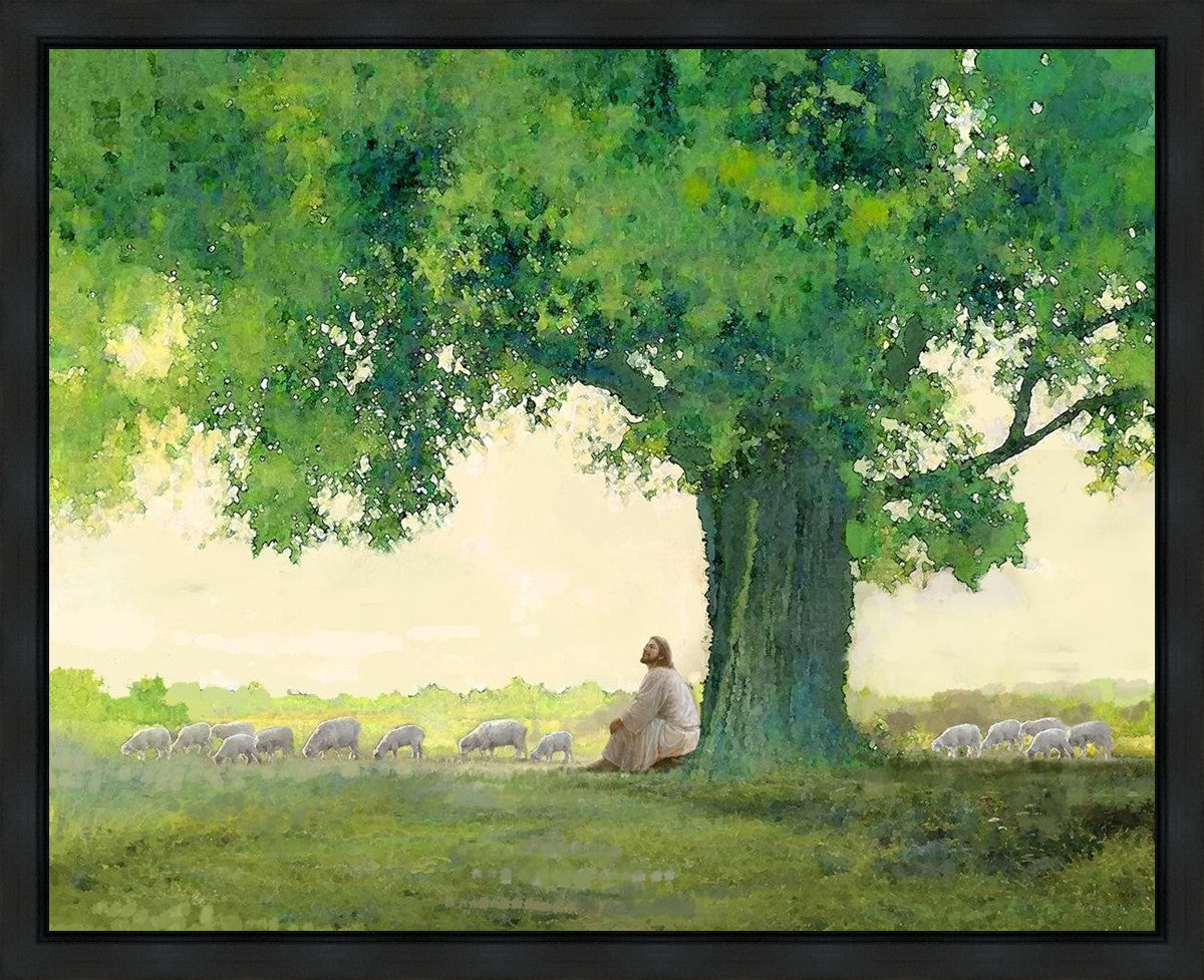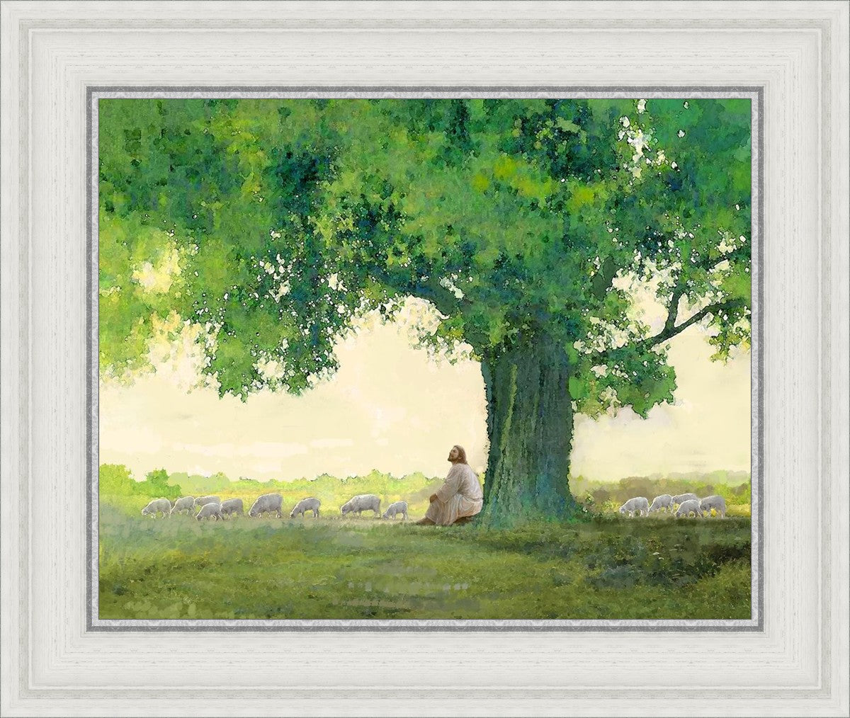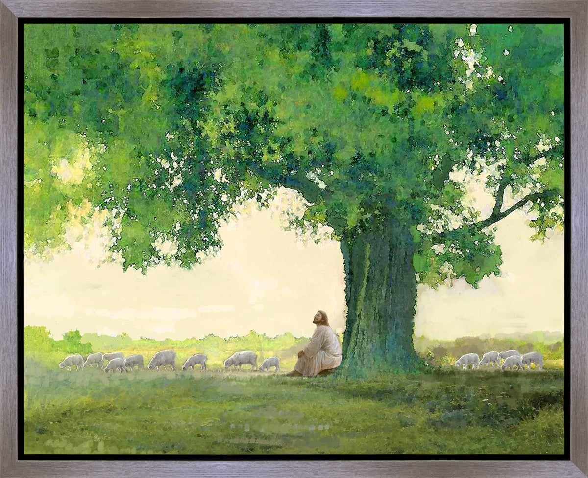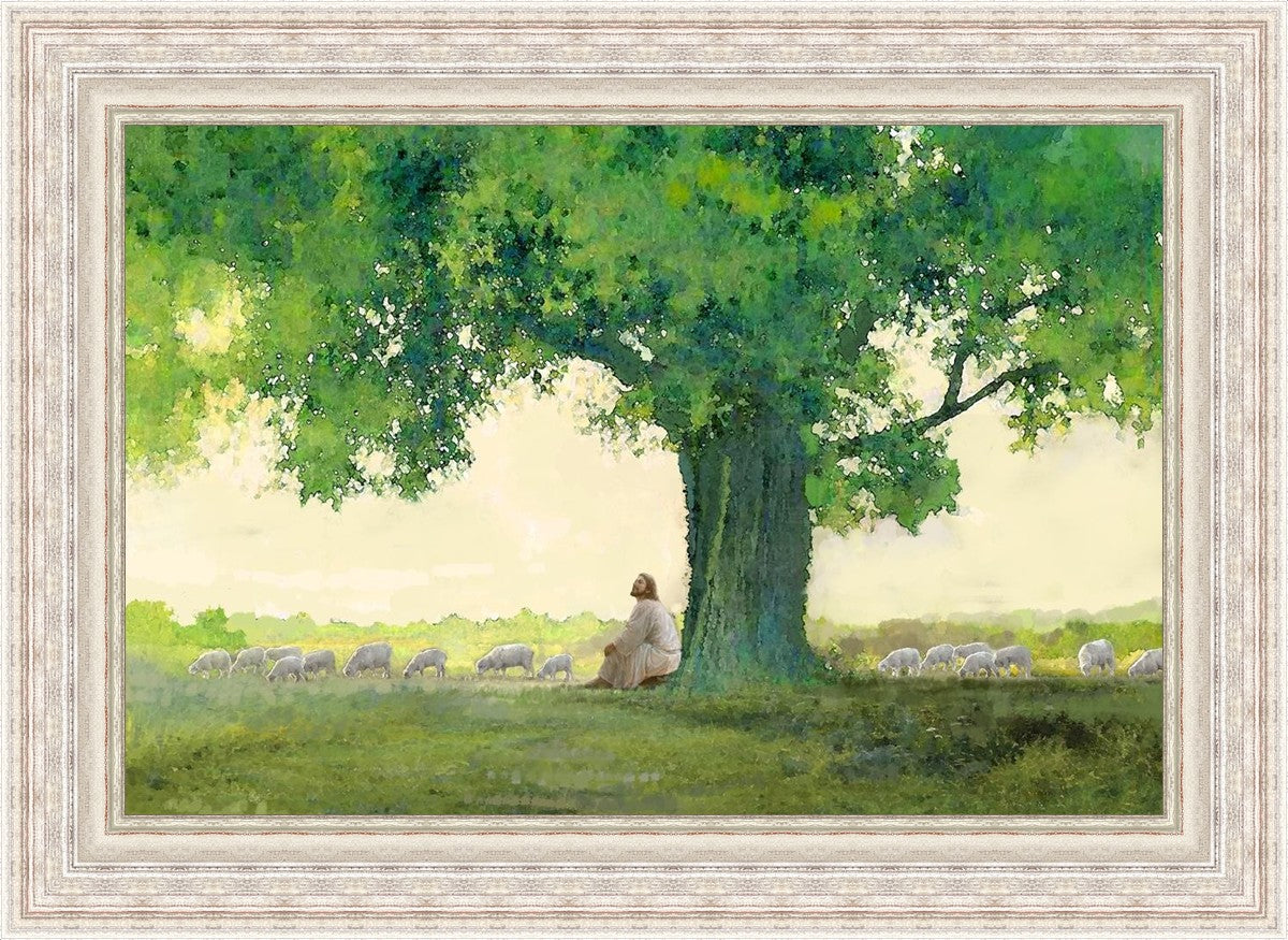 Morning Solace is a painting by Yongsung Kim. This painting depicts Jesus Christ sitting under a big green tree while watching His flock.