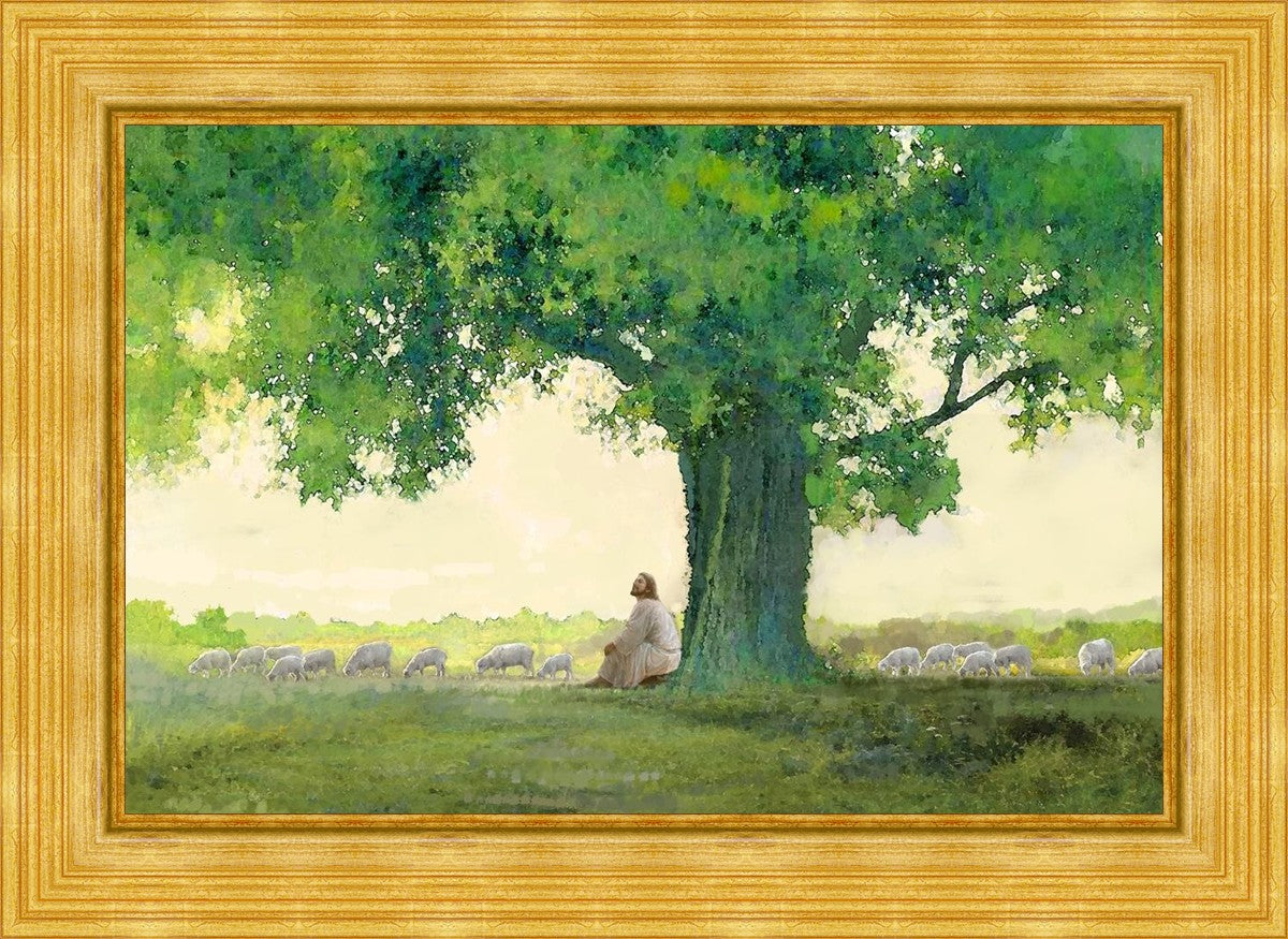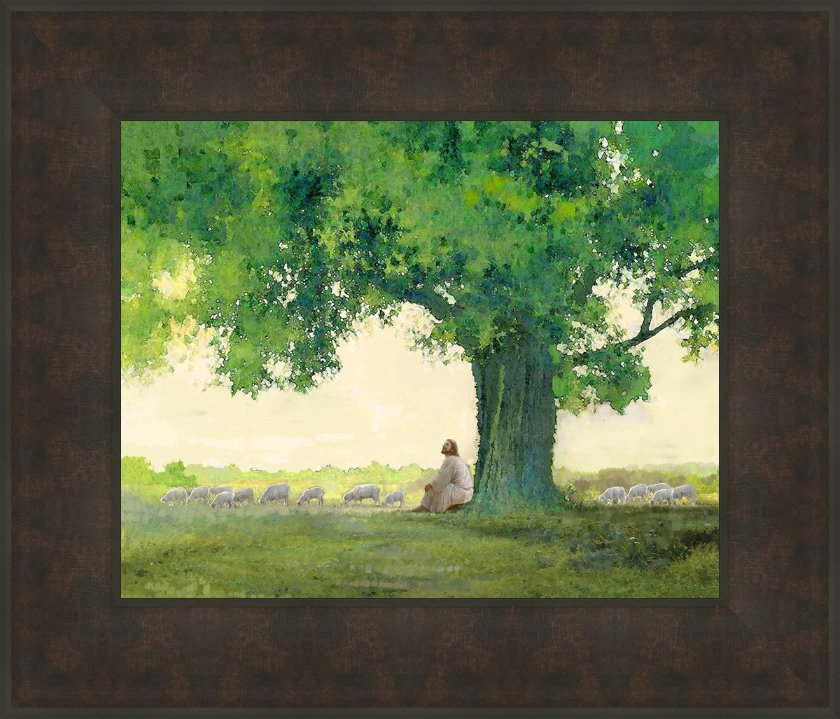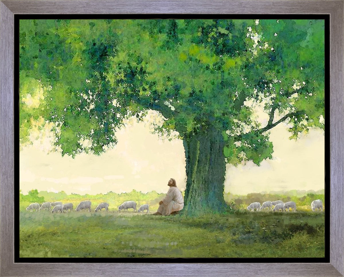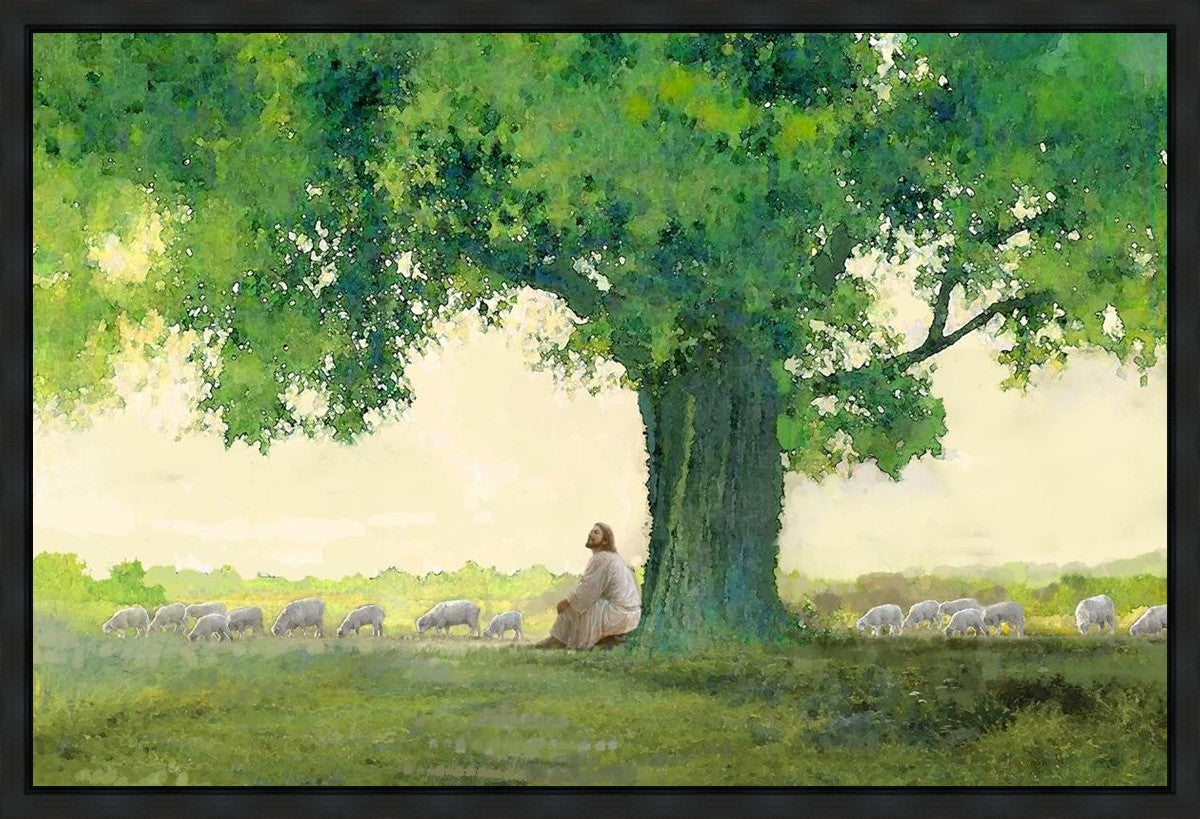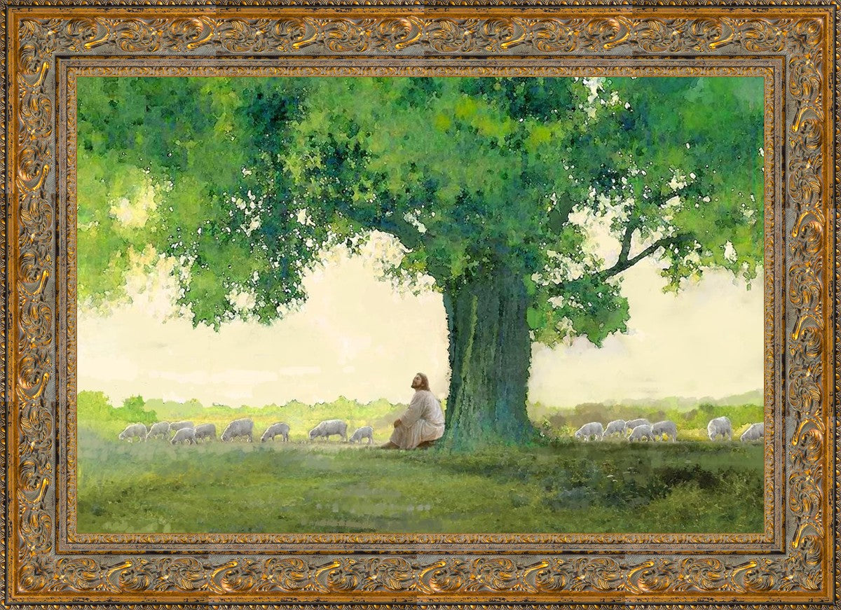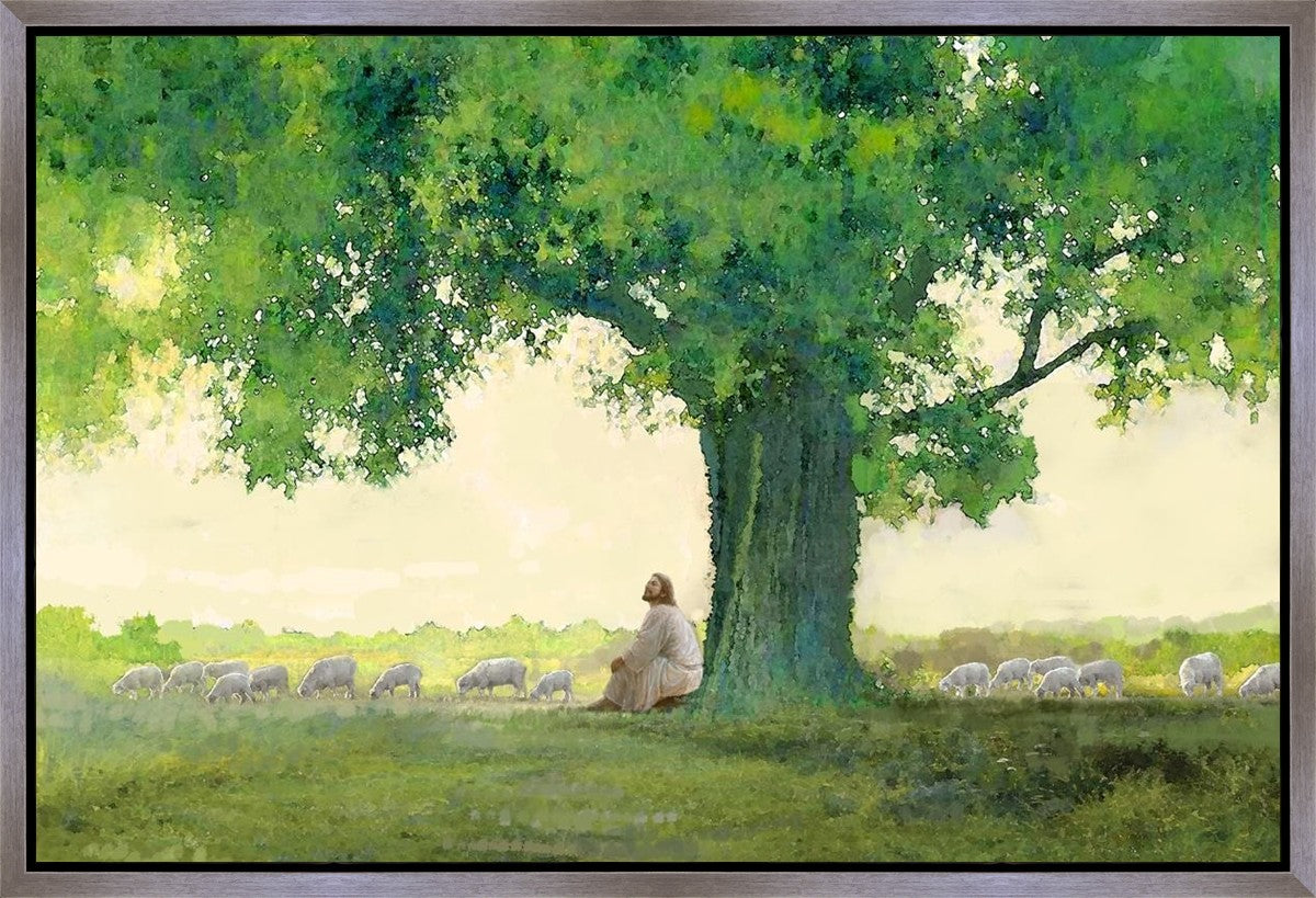 Morning Solace is a painting by Yongsung Kim. This painting depicts Jesus Christ sitting under a big green tree while watching His flock.