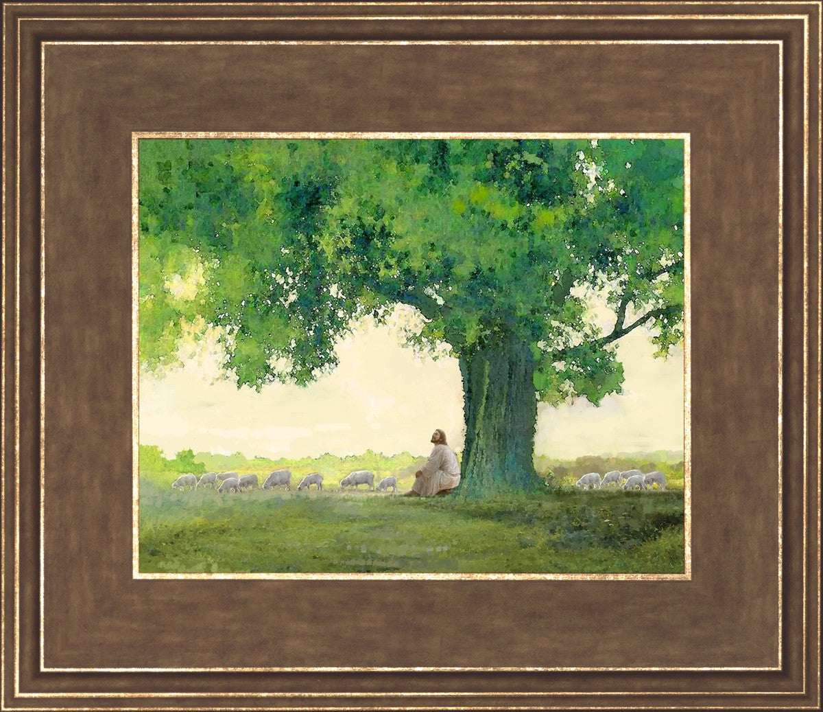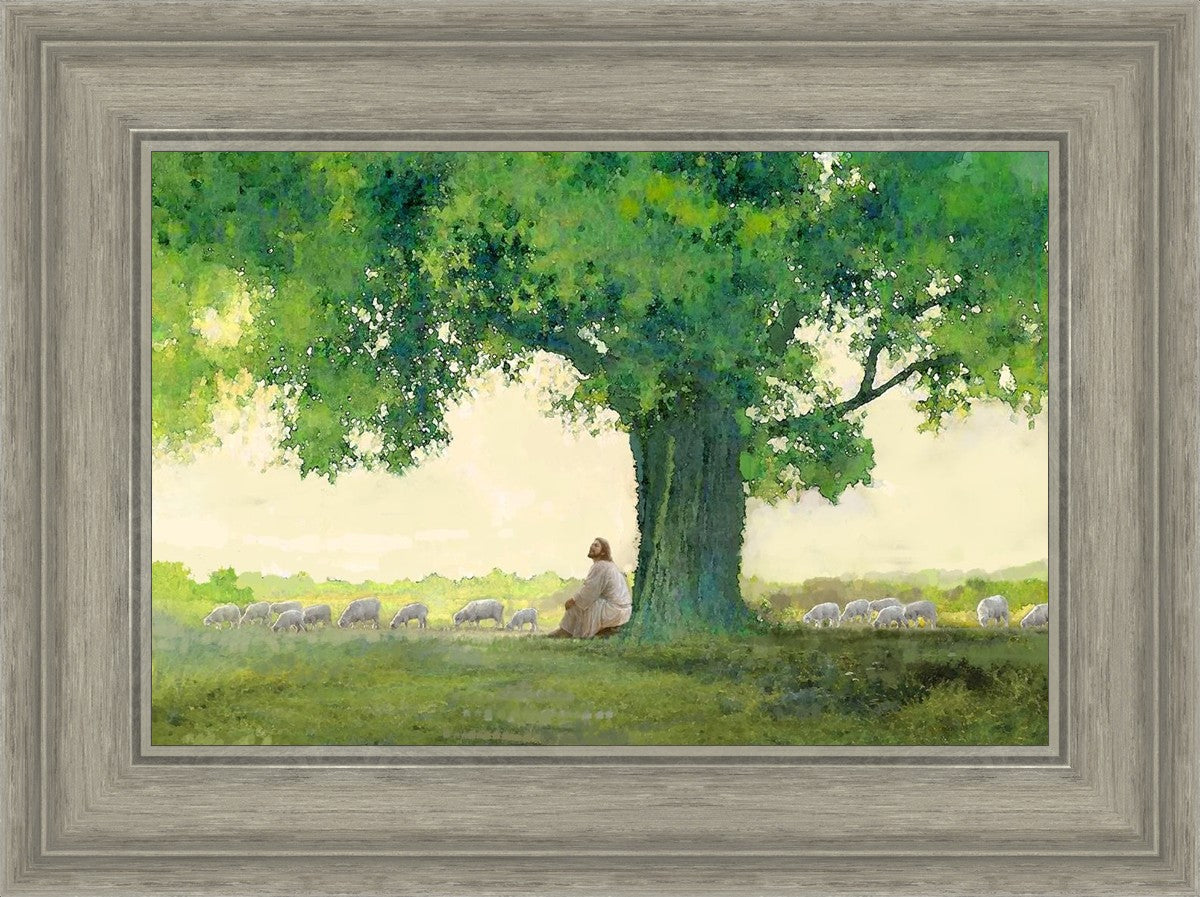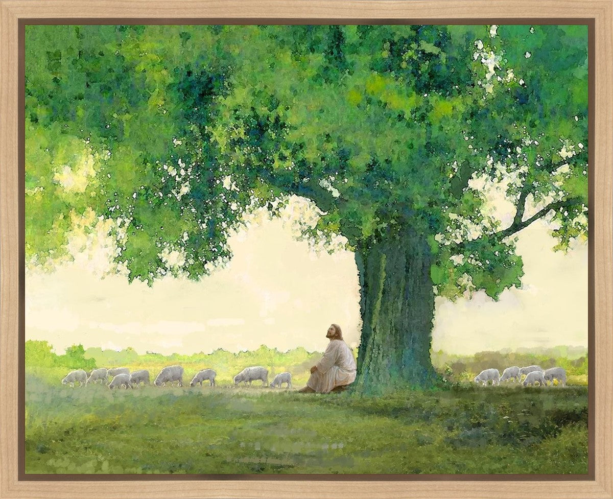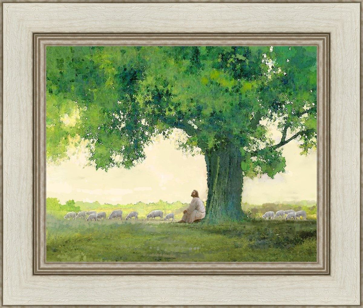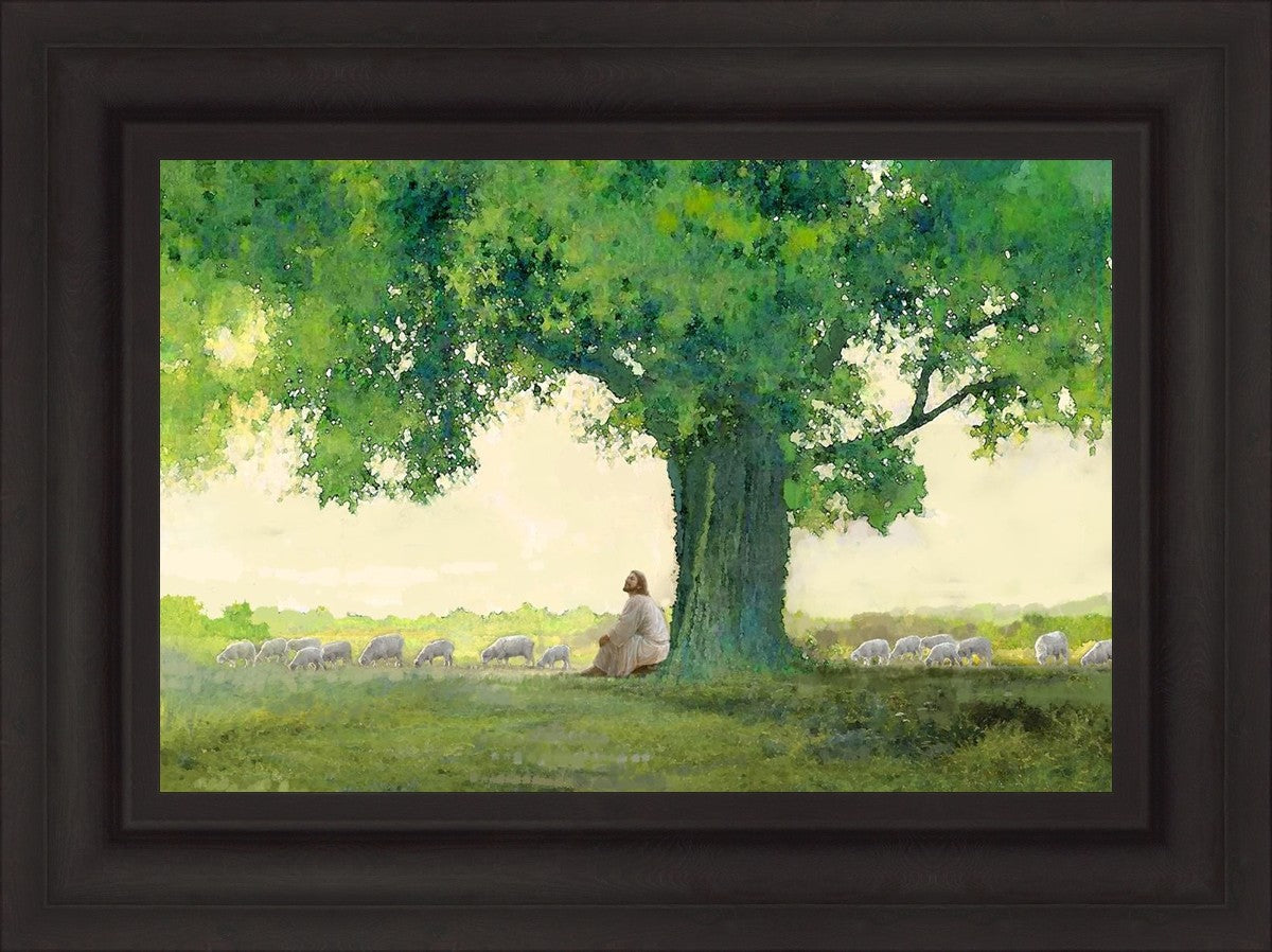 Morning Solace is a painting by Yongsung Kim. This painting depicts Jesus Christ sitting under a big green tree while watching His flock.