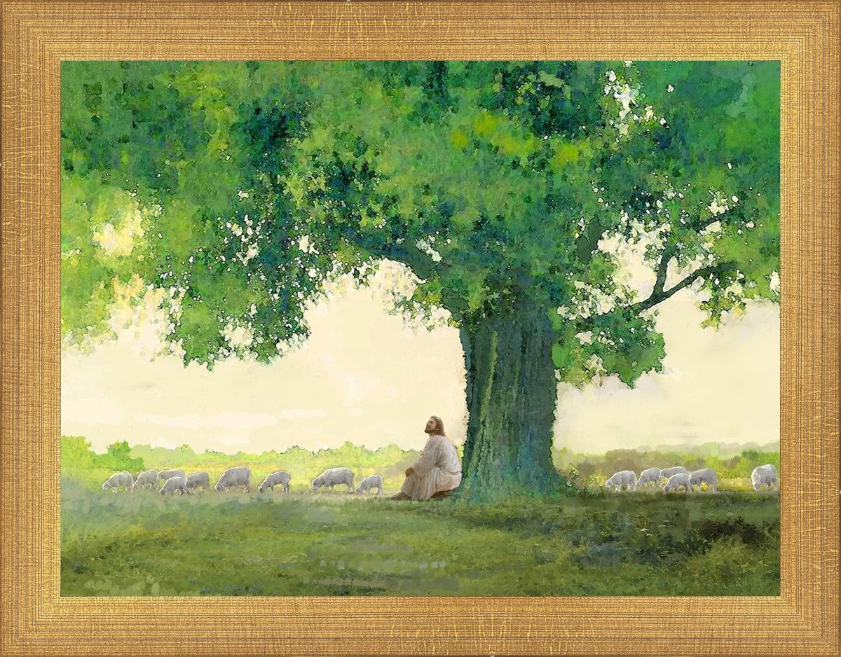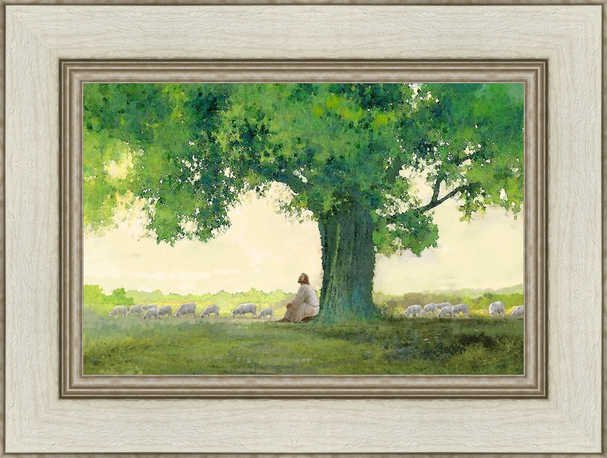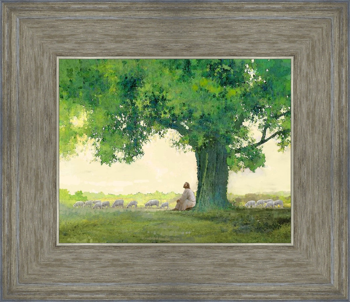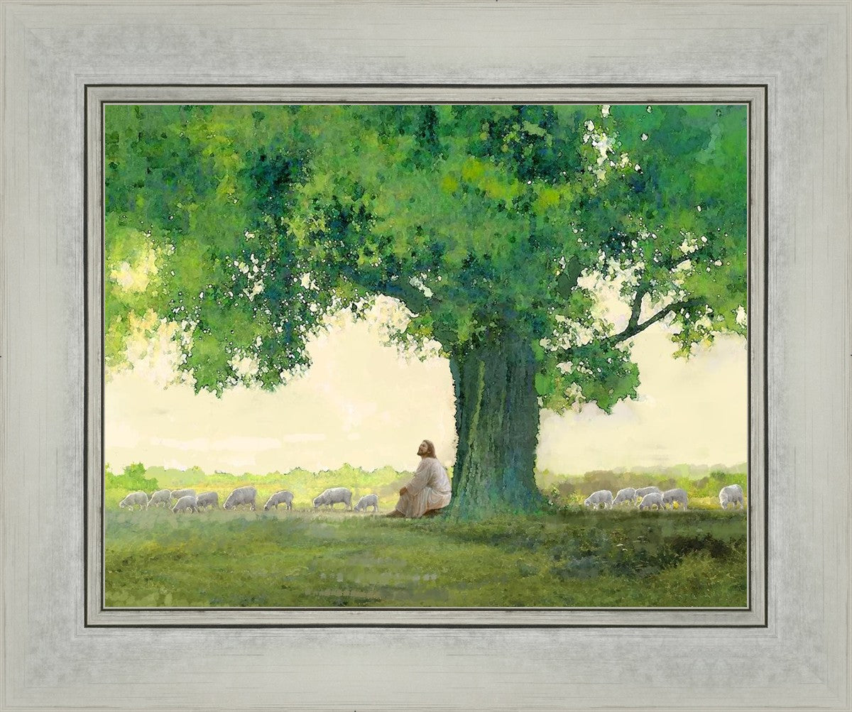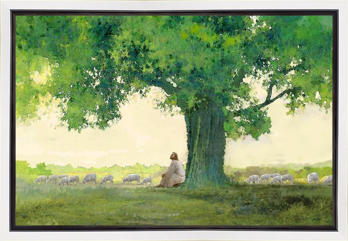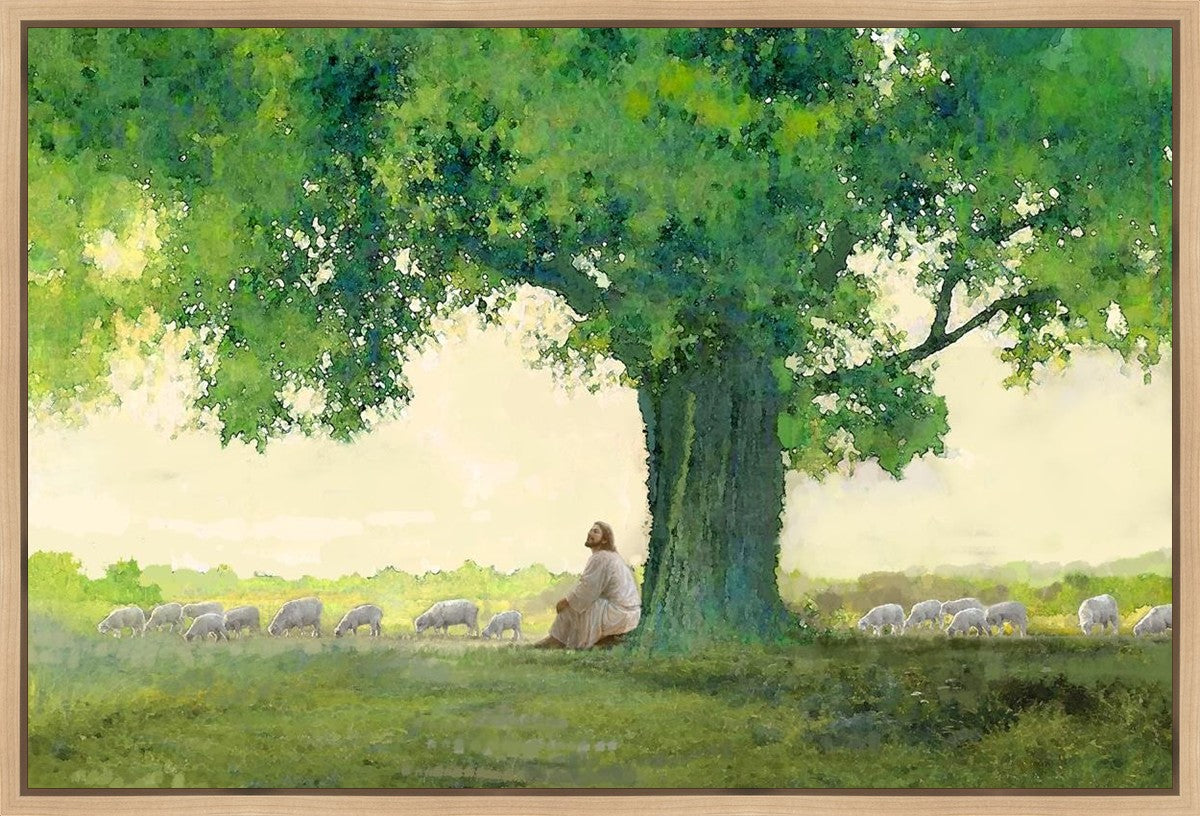 Morning Solace is a painting by Yongsung Kim. This painting depicts Jesus Christ sitting under a big green tree while watching His flock.